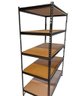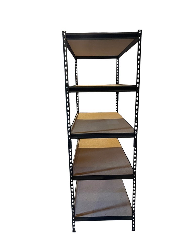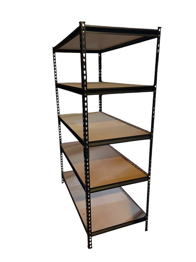 A heavy-duty freestanding storage shelving unit featuring a black metal frame with multiple tiers of composite wood (MDF) shelves. The adjustable shelving design allows for flexible spacing, making it ideal for garage, basement, workshop, or utility storage. Clean, functional, and sturdy—perfect for organizing tools, bins, and household items.