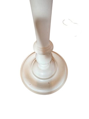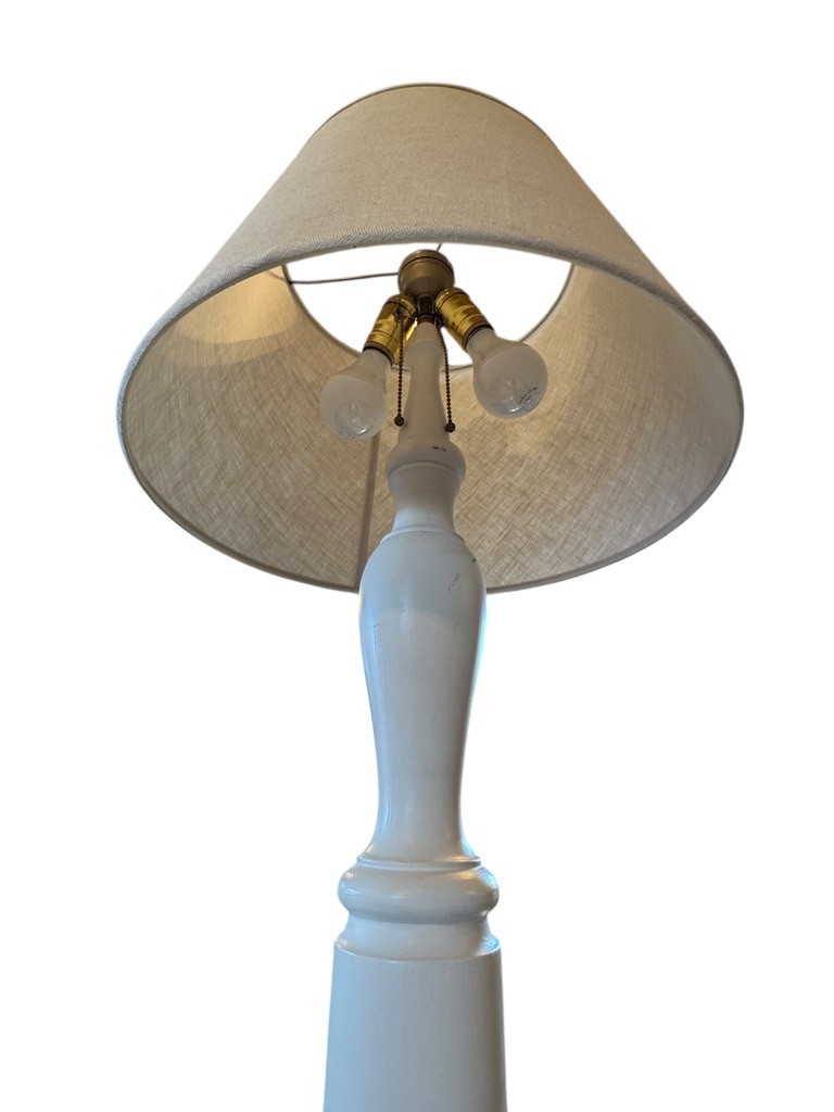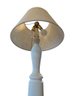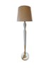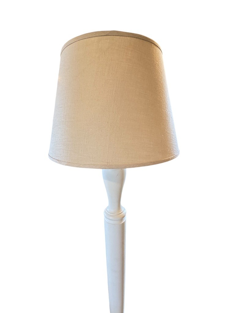 A classic and elegant floor lamp featuring a slender, turned wood form in a soft neutral finish. The graceful silhouette is anchored by a round, stepped base and topped with a simple tapered shade, offering a timeless look that complements a variety of interiors—from traditional to transitional spaces.
