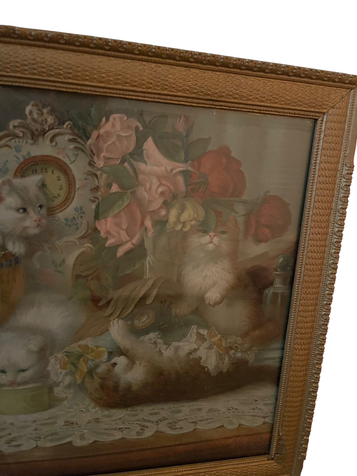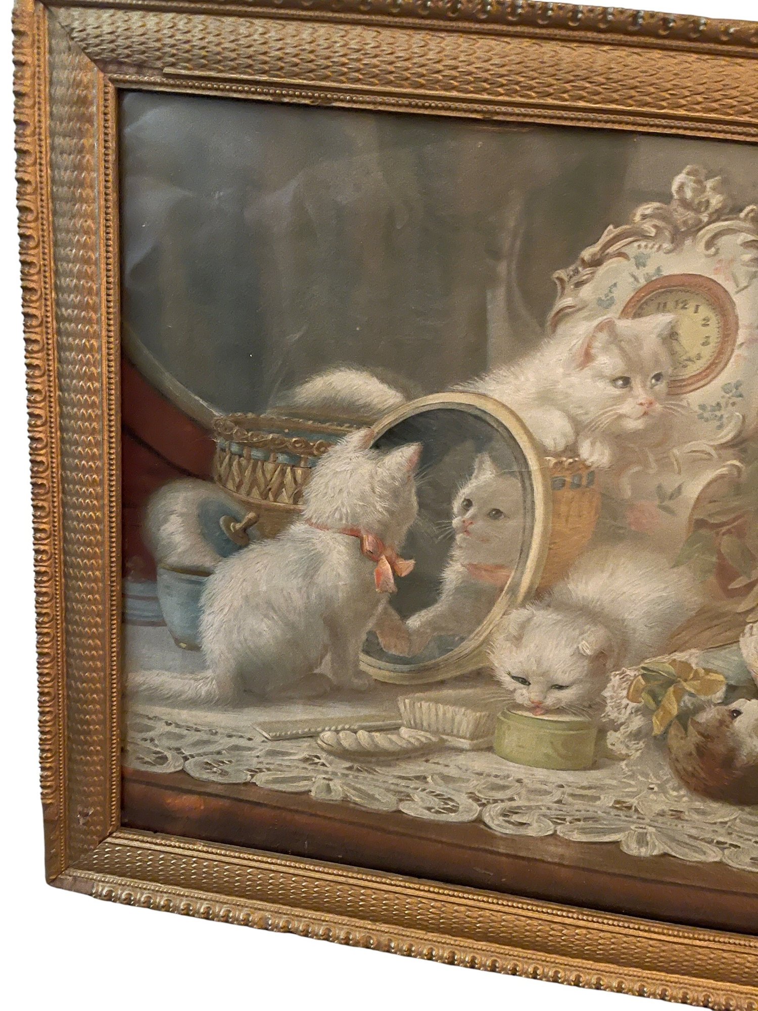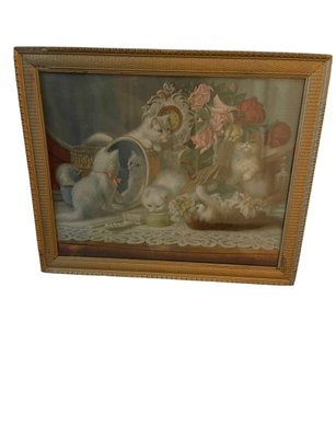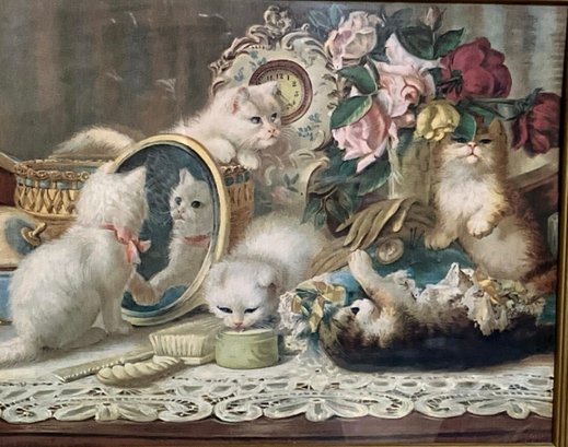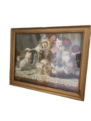 Antique lithograph print of fluffy kittens with flowers playing on a vanity table originating from the late 19th or early 20th century in an antique frame. The litho illustrates all five senses, taste, smell, hearing, touch and sight.