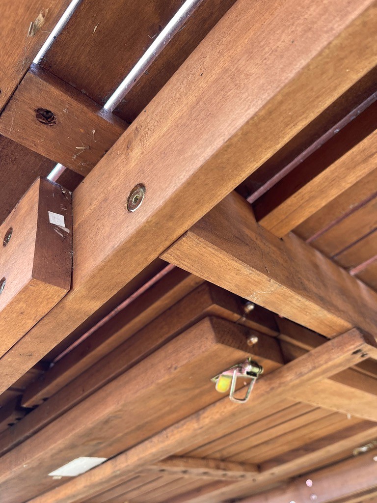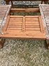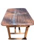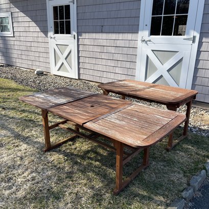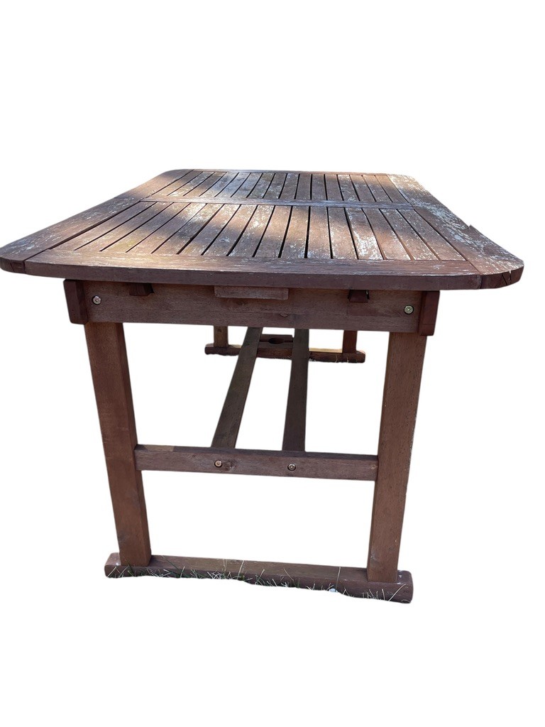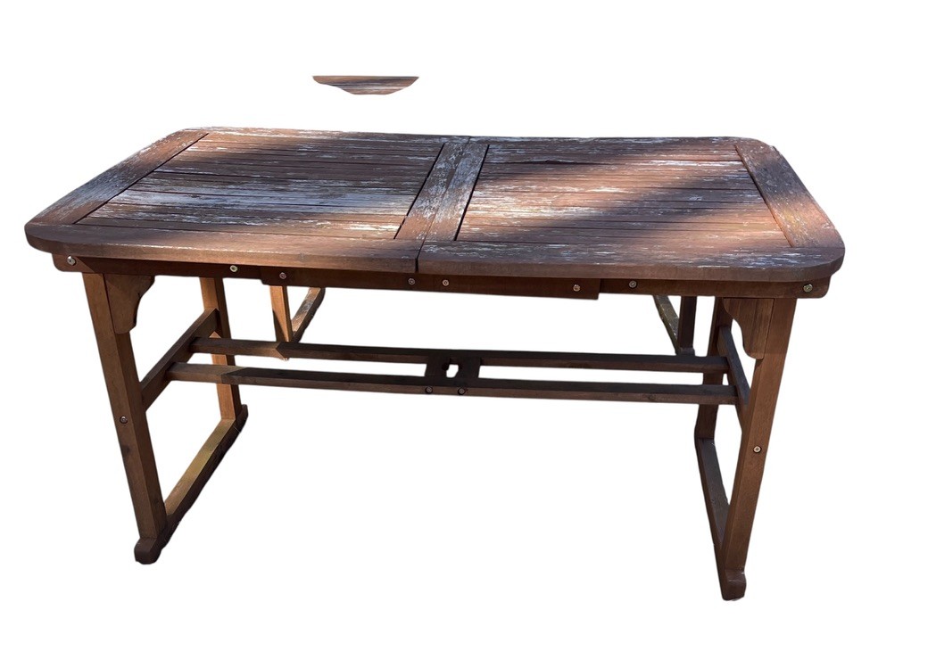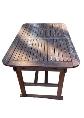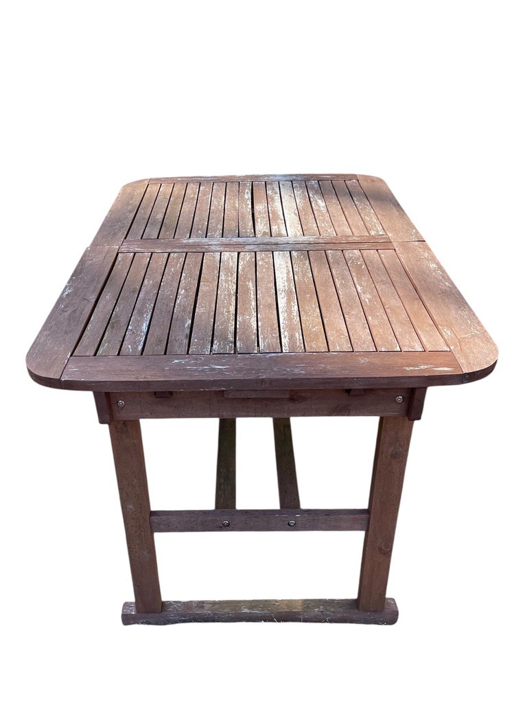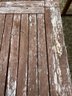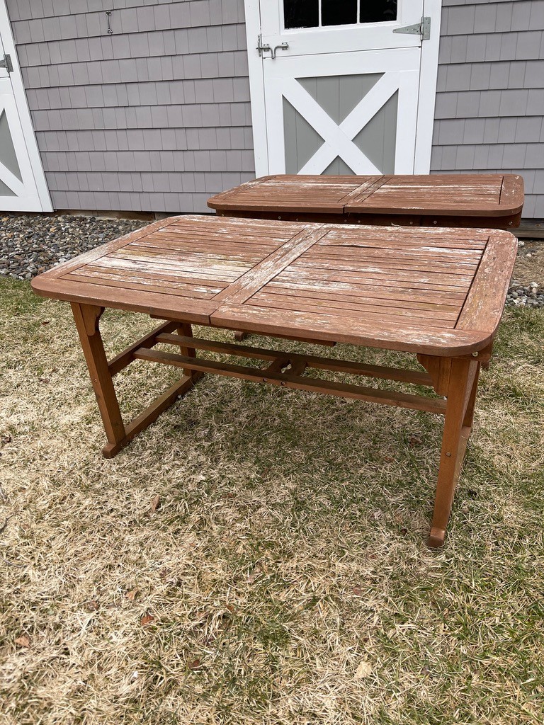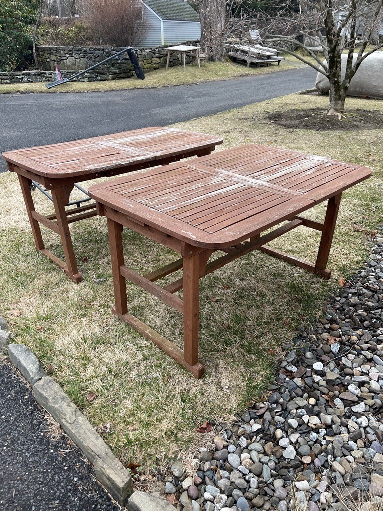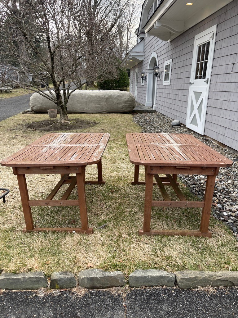 Tables were stored outside and used for buffet for entertainment. Both tables have a stored away extension in the table that folds out. The stow away extension on both tables is a different color from the more weathered part. With extension 79"