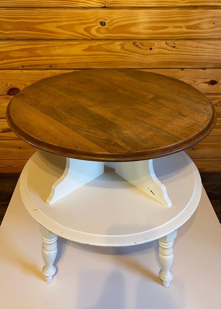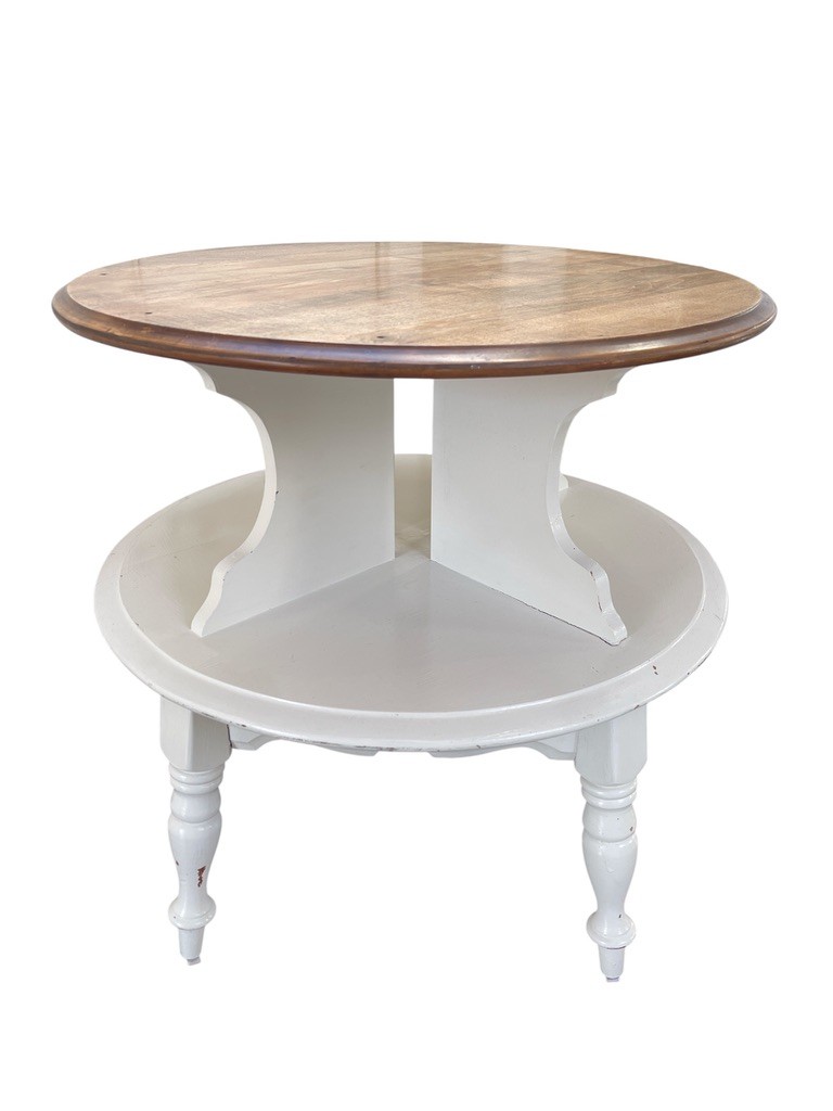 Charming round accent table featuring a warm wood top paired with a painted white base for a classic two-tone look. The table is designed with a unique two-tier structure, including a lower circular shelf that provides convenient storage or display space.