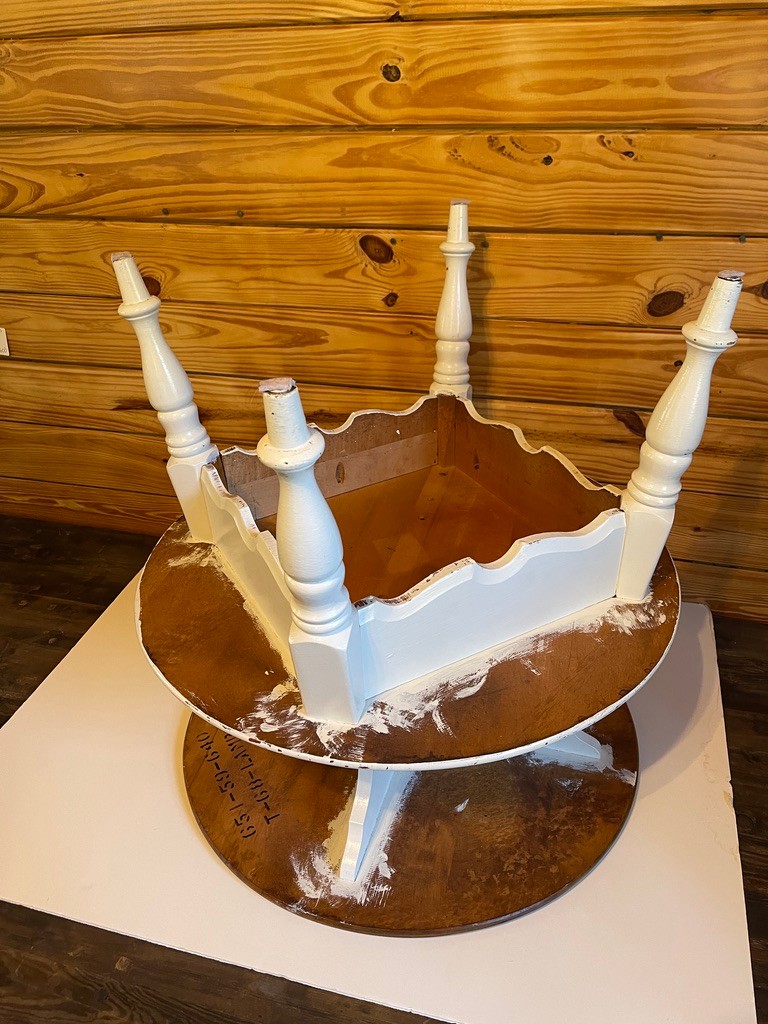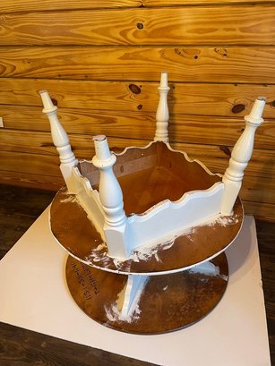 The base showcases decorative curved supports and turned legs. Ideal as a side table, occasional table, or decorative accent in a living room, bedroom, or entryway.