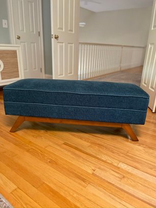 Pretty blue upholstered bench suitable for any use, but especially nice for the base of a bed.