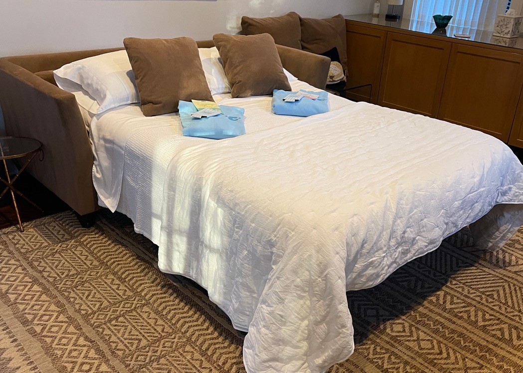 Comfortable and inviting upholstered sleeper-sofa in a warm tan/neutral tone and features clean, slightly flared arms and a deep seat cushion, offering both style and everyday comfort.