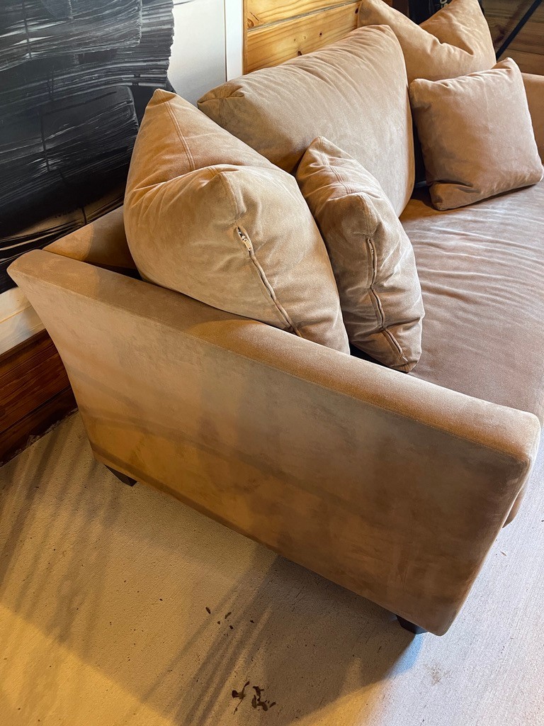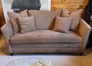 The sofa includes multiple coordinating throw pillows, adding softness and a relaxed, layered look. Upholstered in a soft, suede-like fabric, it provides a cozy feel while maintaining a tailored appearance. Supported by low-profile dark wood feet.