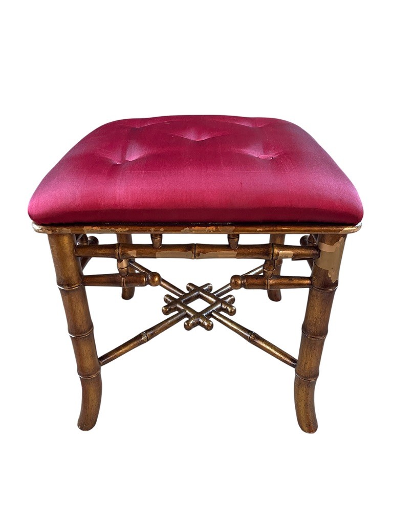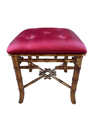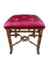 A vintage bamboo-style bench or ottoman featuring a carved wood frame with decorative cross-stretcher detailing. The seat is upholstered in a rich raspberry-red fabric with subtle tufting.