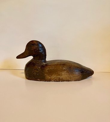 Authentic vintage hand-carved wooden duck decoy featuring a classic, timeworn surface and rich, naturally aged patina. The form is simple and well-balanced, with subtle carving details to the head and bill, and remnants of original paint adding to its rustic character.