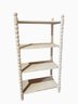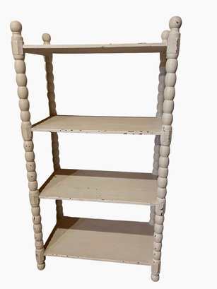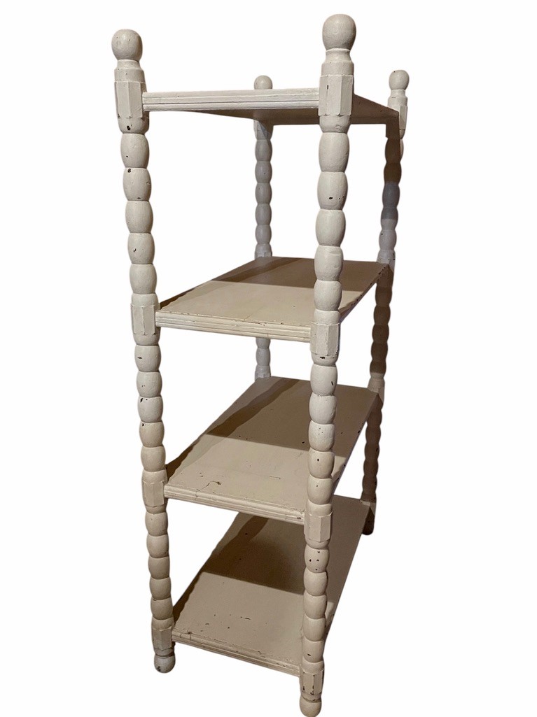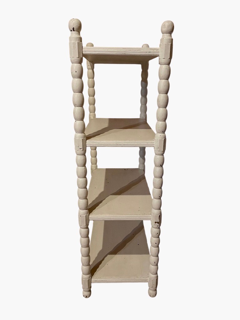 Charming vintage painted wood shelving unit featuring classic turned spindle posts and a soft cream finish. This petite open shelf offers four tiers of display and storage, making it ideal for books, small collectibles, or decorative accents.