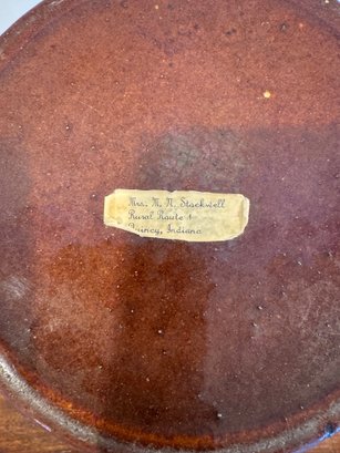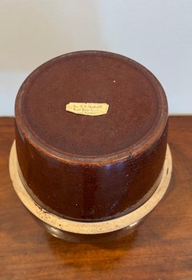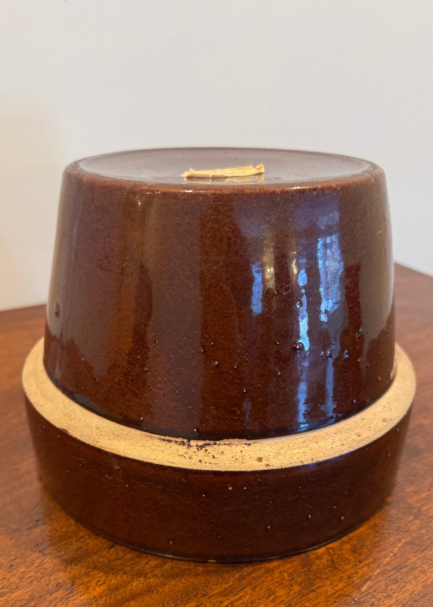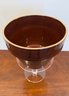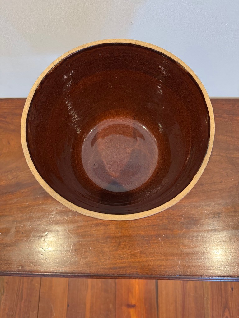 Handsome vintage stoneware bowl featuring a rich, glossy chocolate-brown glaze. with a wide, slightly flared rim tapered body. The rim reveals a natural, unglazed clay edge that adds warmth and highlights the handcrafted character of the piece. The interior is fully glazed, making it suitable for decorative display or functional use. Excellent addition to a farmhouse, rustic, or modern organic inter