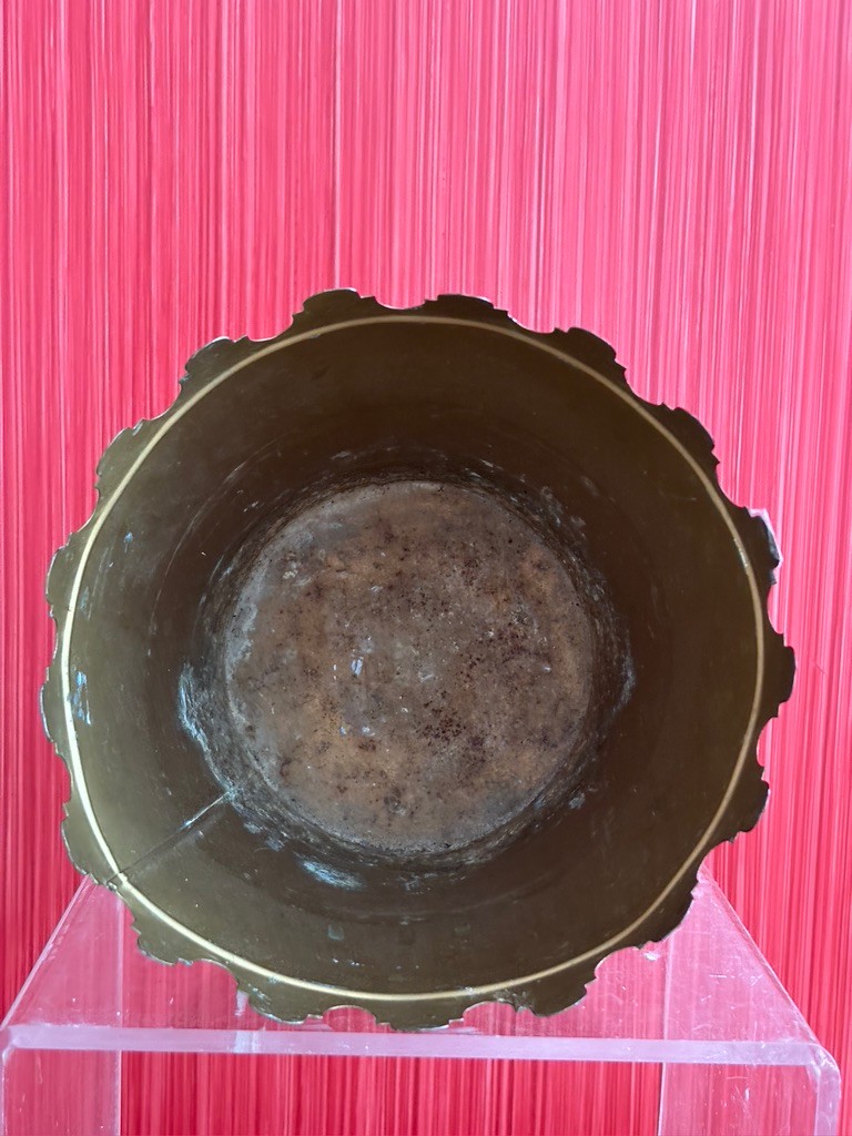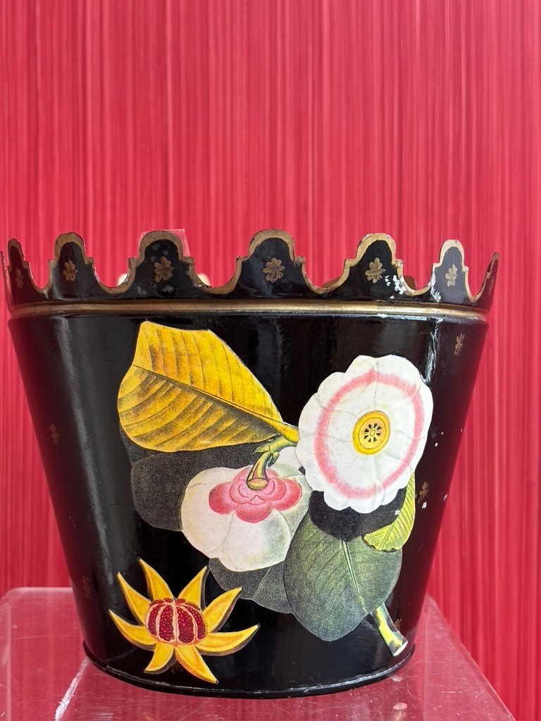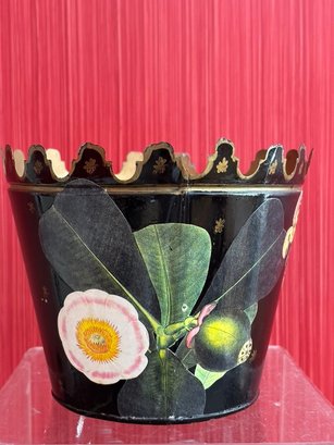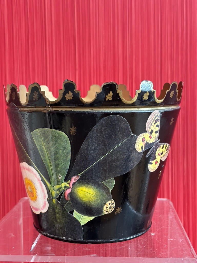 Cachepot or plant holder featuring a black finish with hand-painted butterfly and floral design. The planter has a distinct scalloped or notched rim with gold accents.