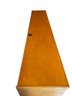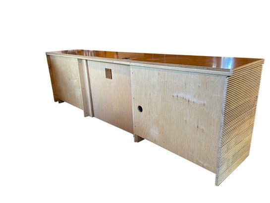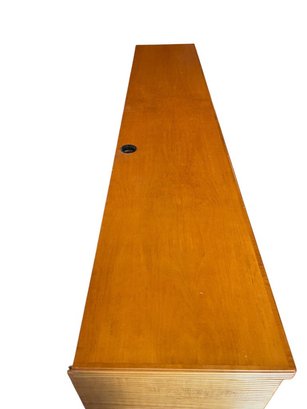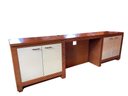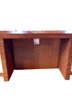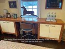 A beautifully designed vintage desk featuring a warm wood frame paired with contrasting cream cabinet fronts, offering a sophisticated blend of mid-century modern styling and practical functionality. This substantial piece makes a striking statement while providing an expansive work surface ideal for a home office or study.