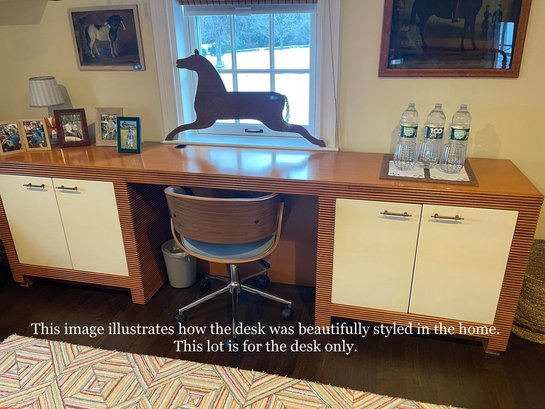 The desk is configured with double pedestal storage, including cabinet doors on both sides for concealed organization, along with a central drawer for everyday essentials. Distinctive fluted detailing along the sides adds texture and architectural interest, while the clean lines and understated hardware enhance its timeless appeal.
