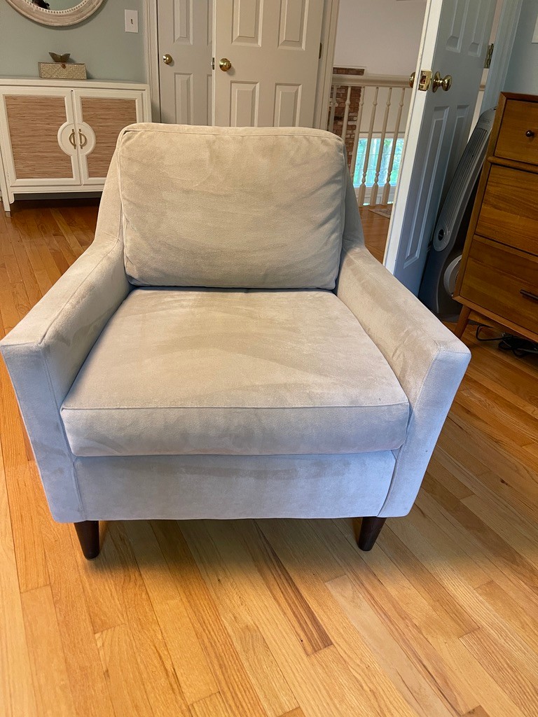 West Elm performance velvet chair has a low-slung profile and compact size perfect for any room. There is another available in this auction.