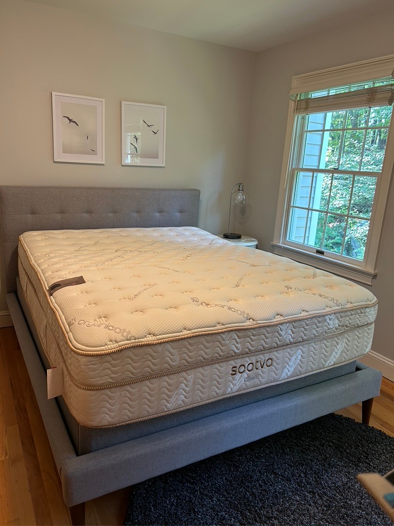 West Elm gray tufted upholstered queen bed with Saatvo classic mattress. Solid pine and engineered wood frame with reinforced joinery. Wood legs...All wood is kiln-dried for added durability. Wood slats included. Bed mattress is included if desired. Mattress measures 80 x 60 x 14