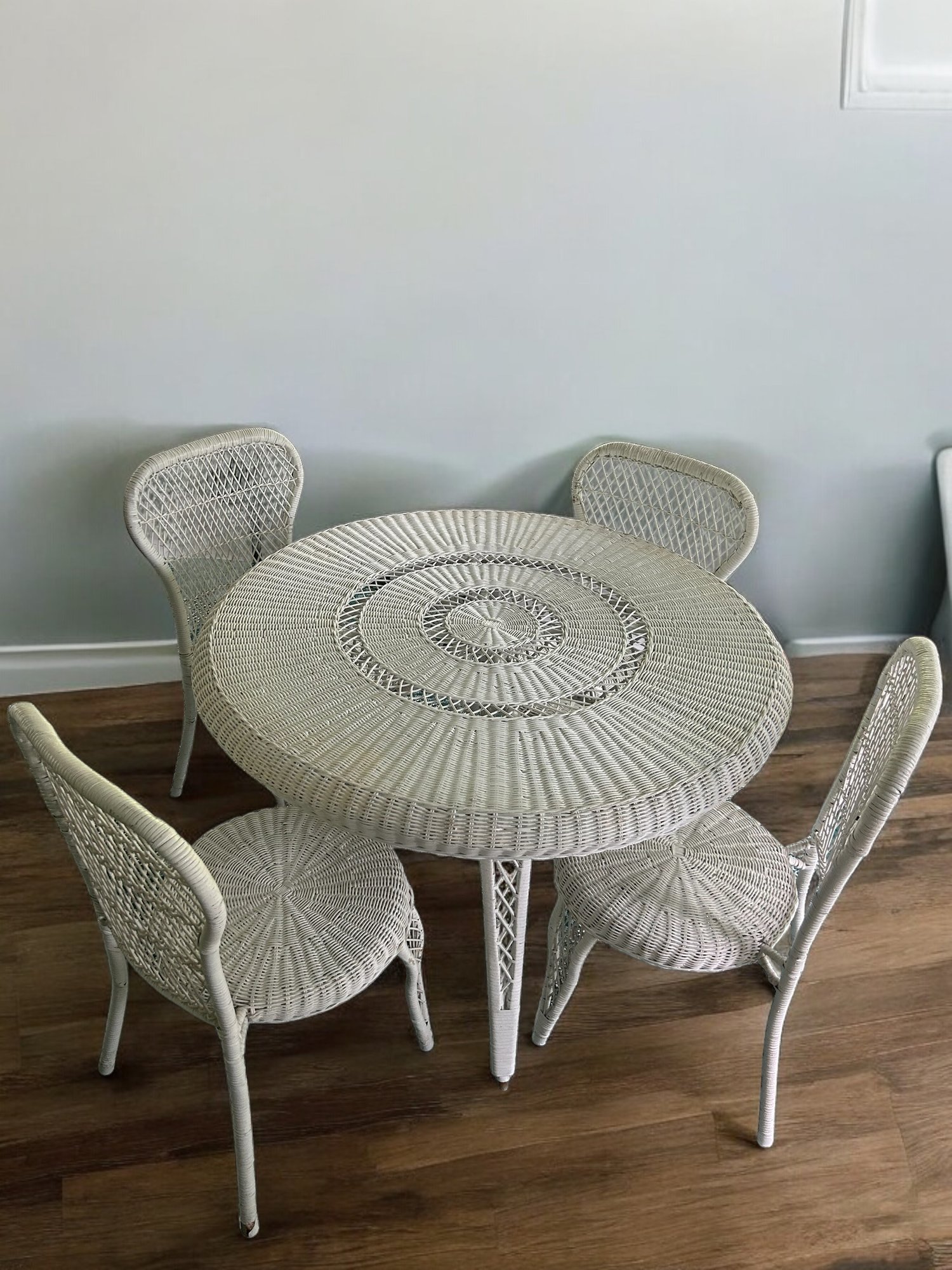 Round wicker table with four chairs. Table has a removable glass top.