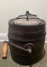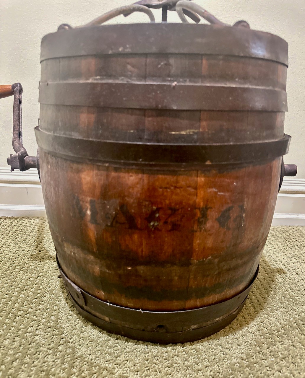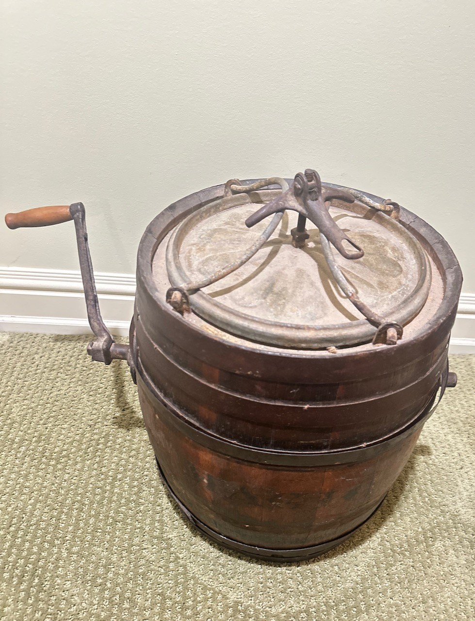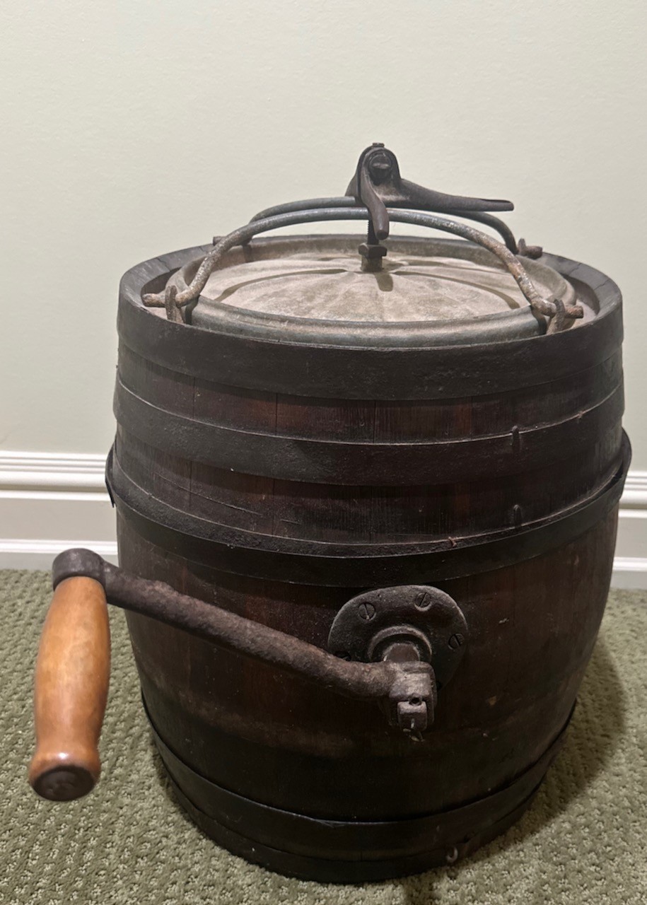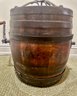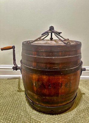 Antique wooden butter churn barrel featuring a hand-crank mechanism and iron bands for structural support. Constructed from wooden staves bound by iron hoops with a fitted lid and a side-mounted crank handle.