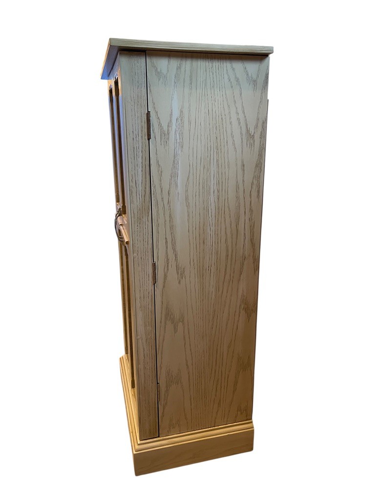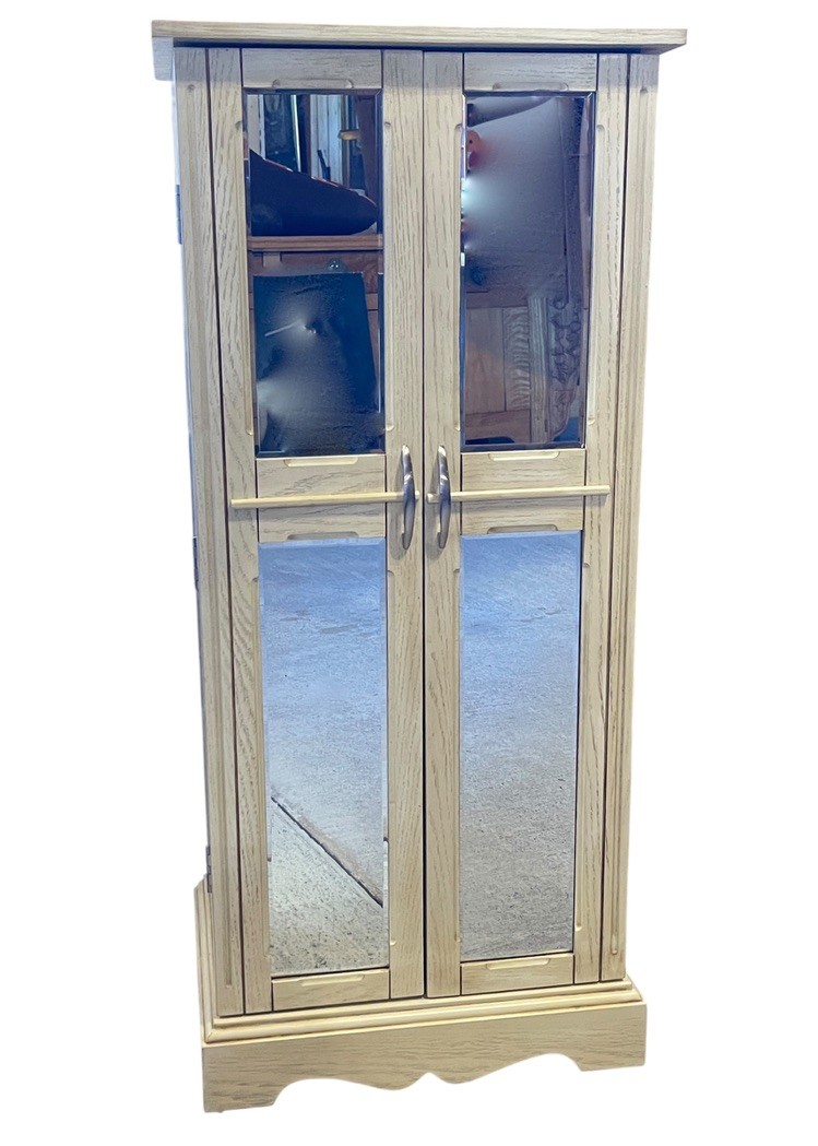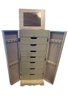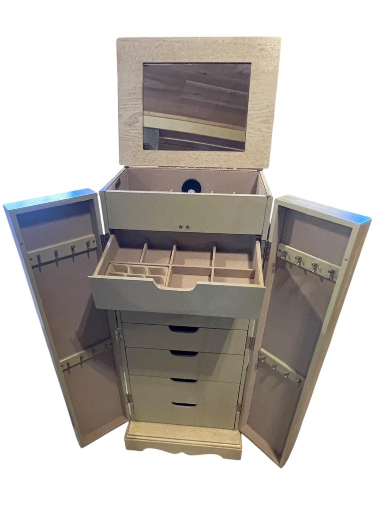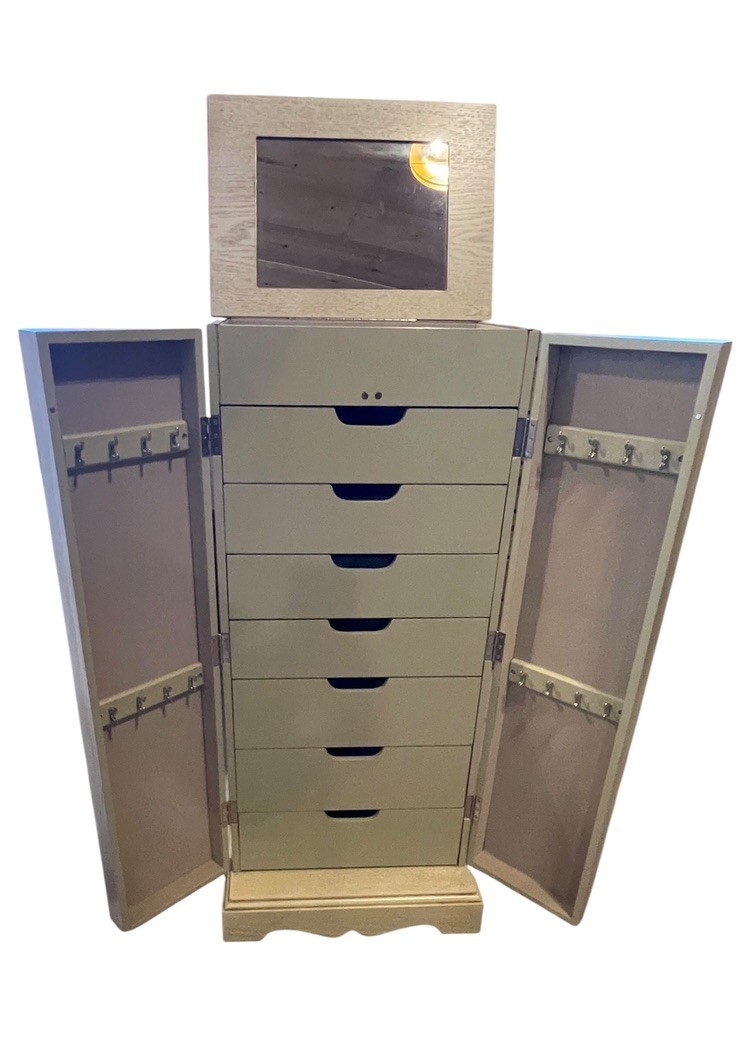 The front opens to multiple pull-out drawers, ideal for rings, bracelets, and other valuables, while the dual side doors feature hooks for neatly storing necklaces and chains. Finished in a soft neutral tone, this piece blends seamlessly into both traditional and modern interiors.