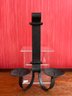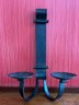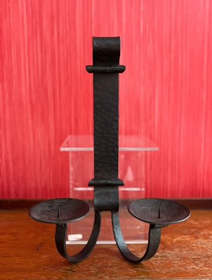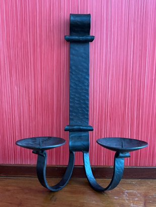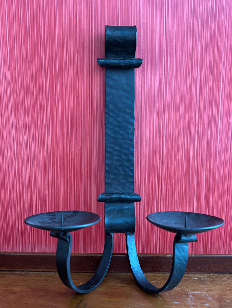 Vintage hand hammered wrought iron wall candle sconce featuring a heavy rustic design with two arms for holding candles.
