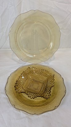 Vintage yellow amber depression glass plates and bowl