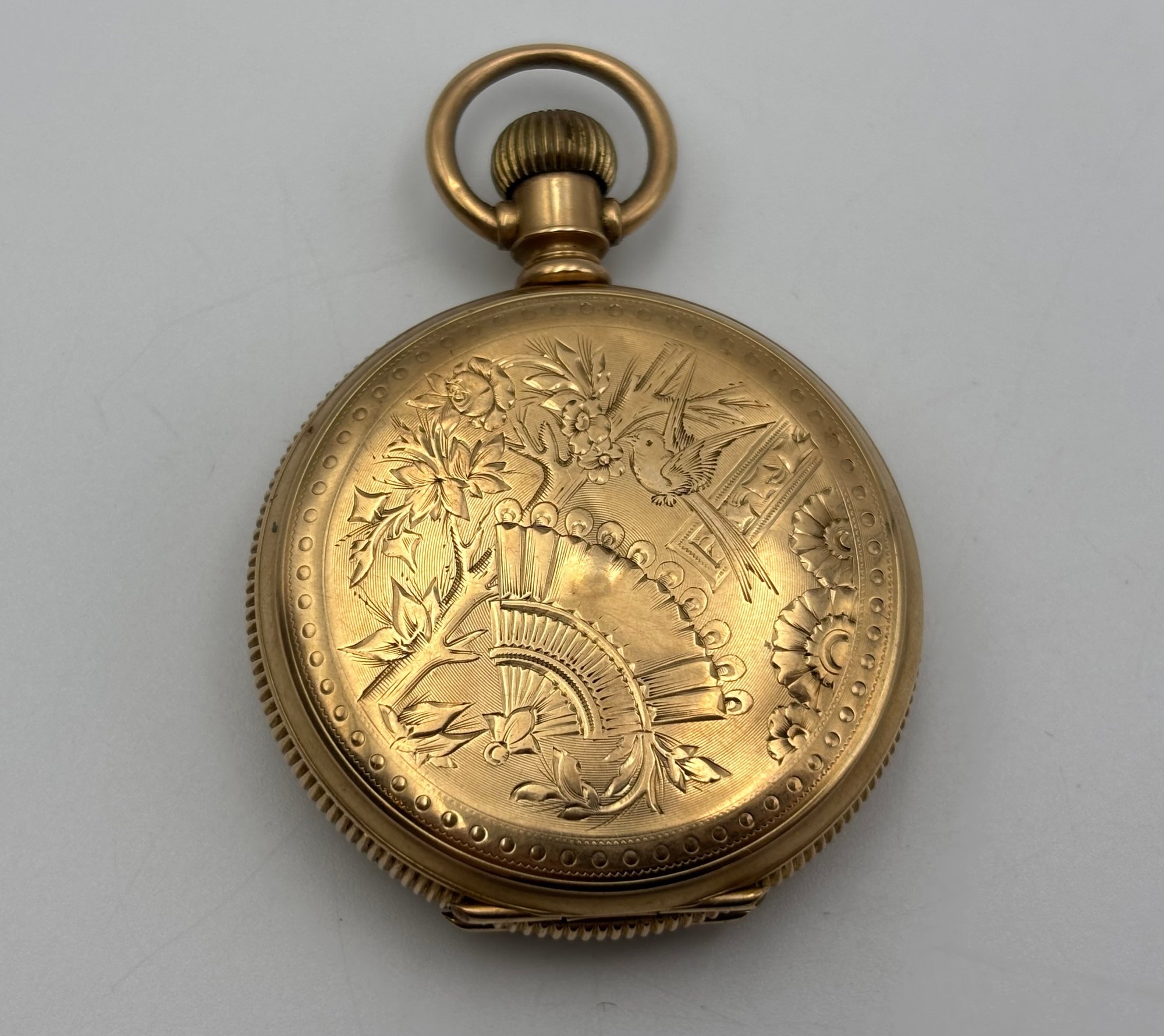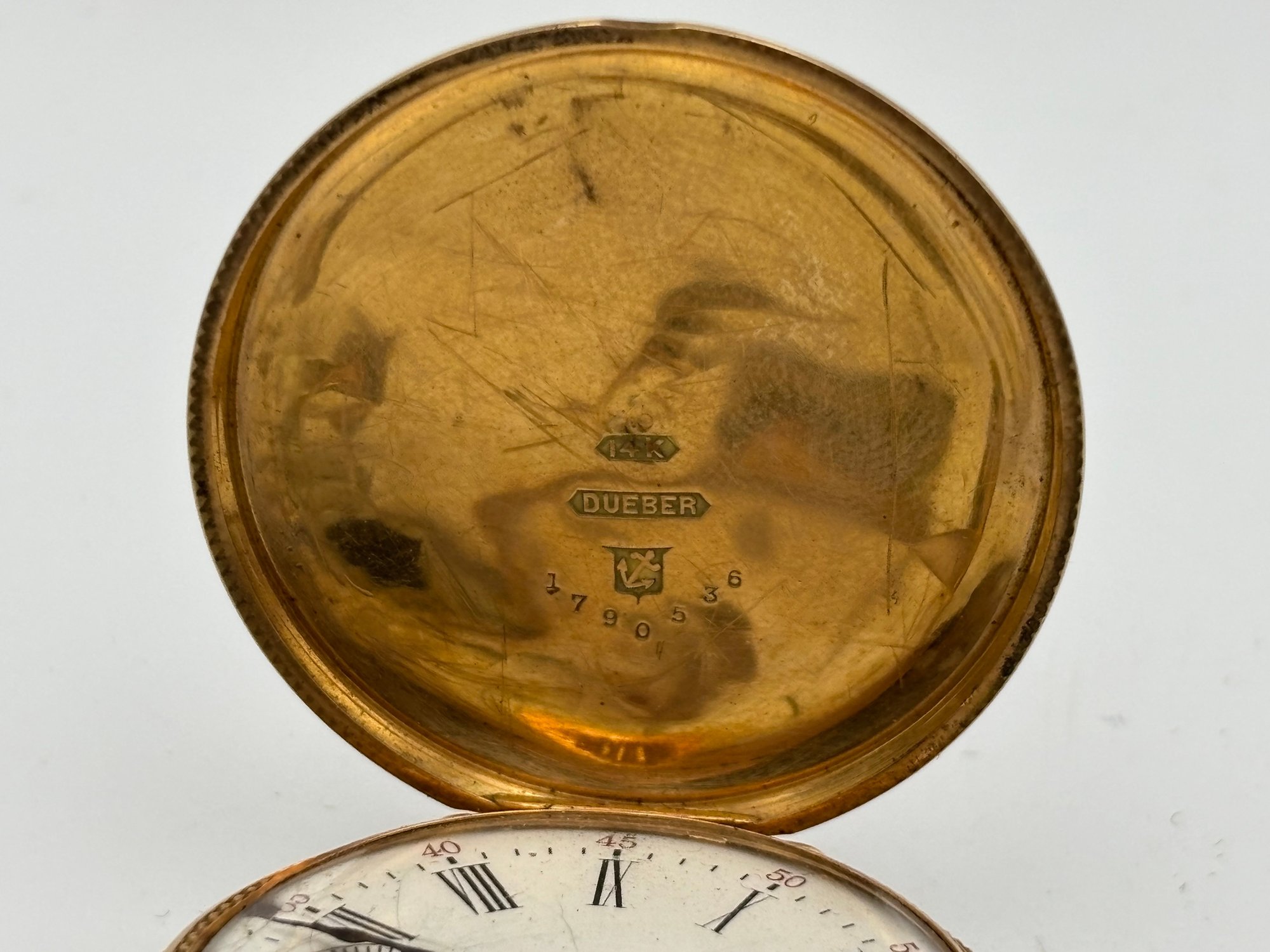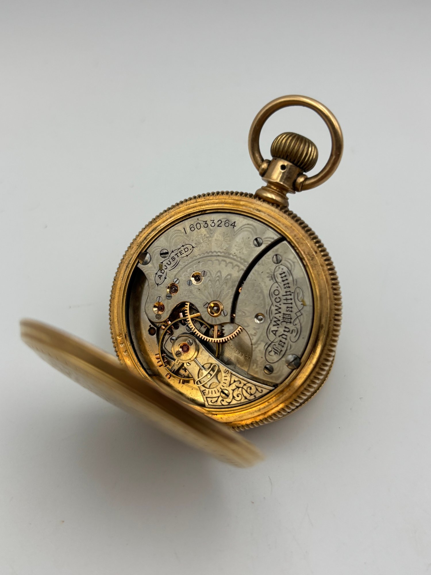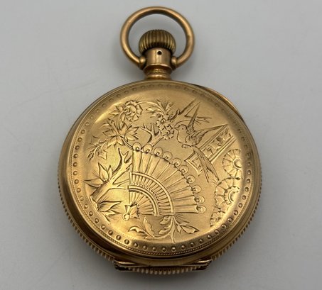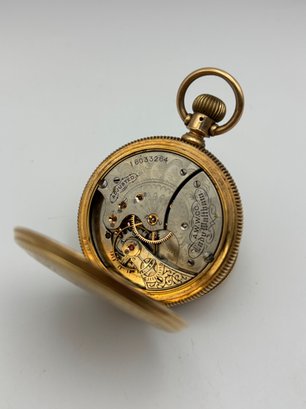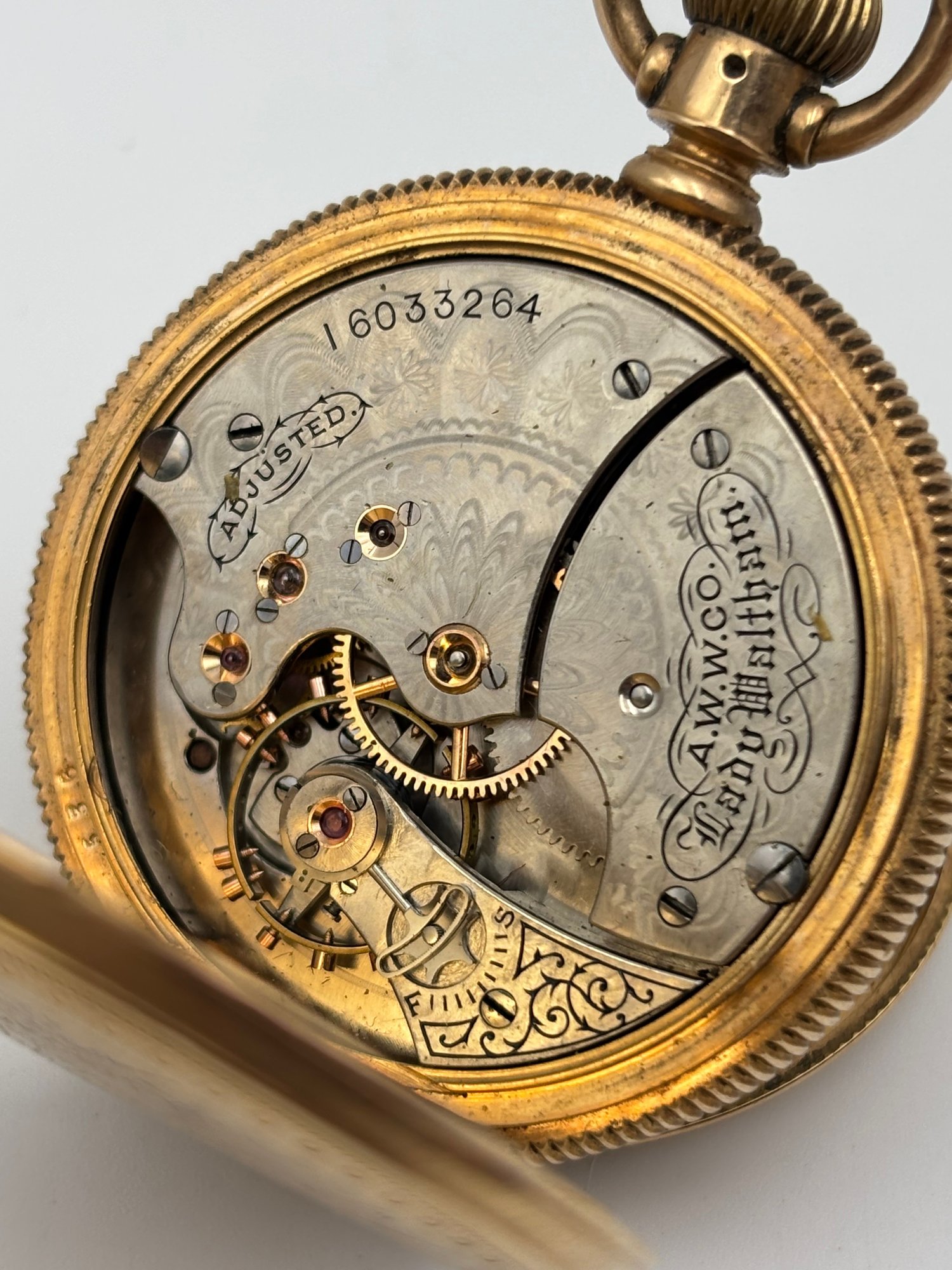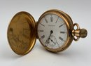 The watch presents in good overall condition with normal signs of age and use. *There is a crack/missing portion from the white clock face around the 35 min indicator line.* When wound, it begins ticking promptly and appears to be in good working order, though it has not been tested for timekeeping accuracy.