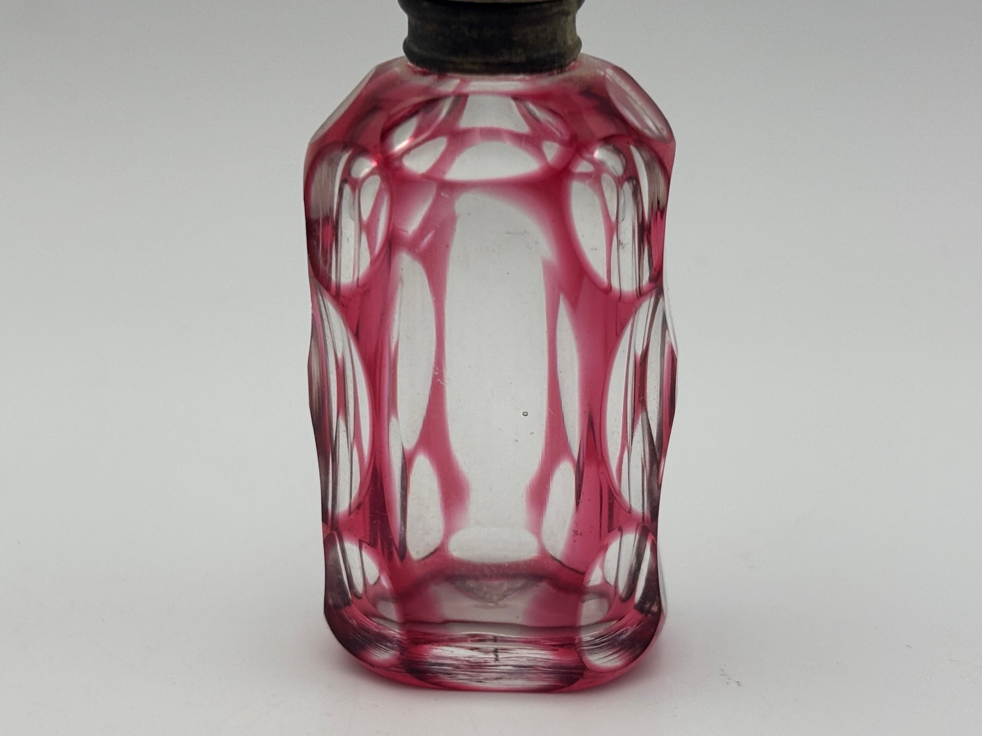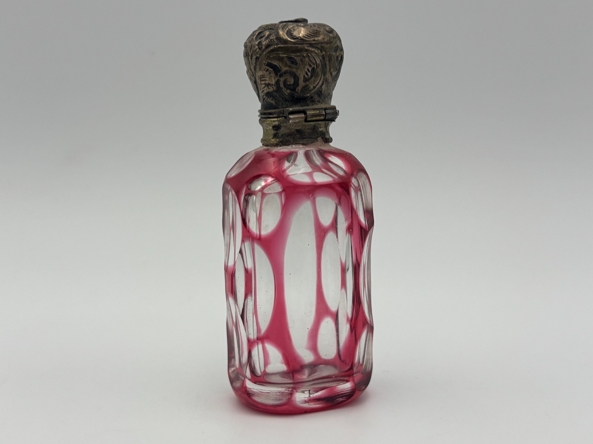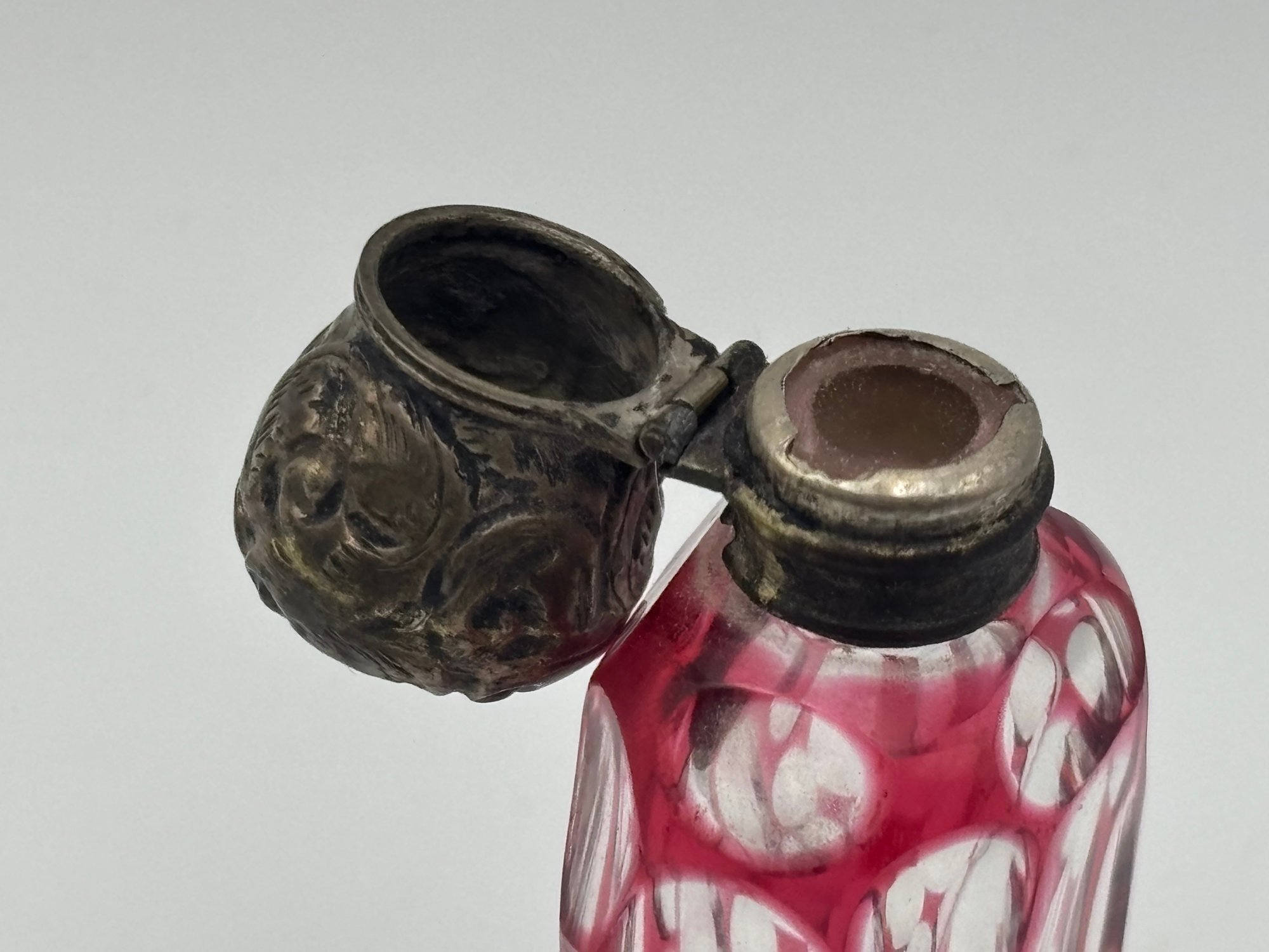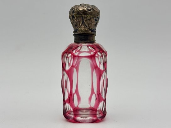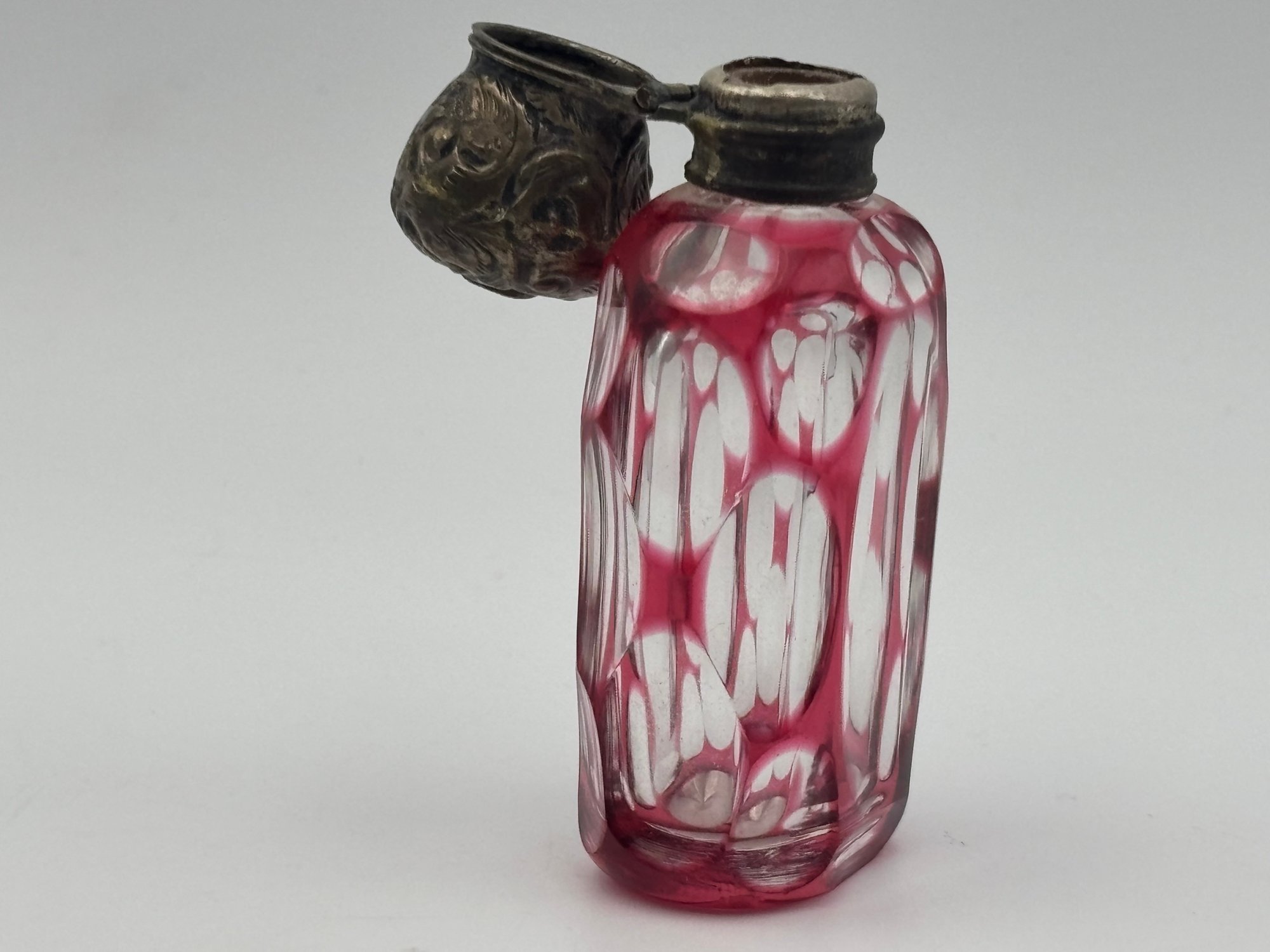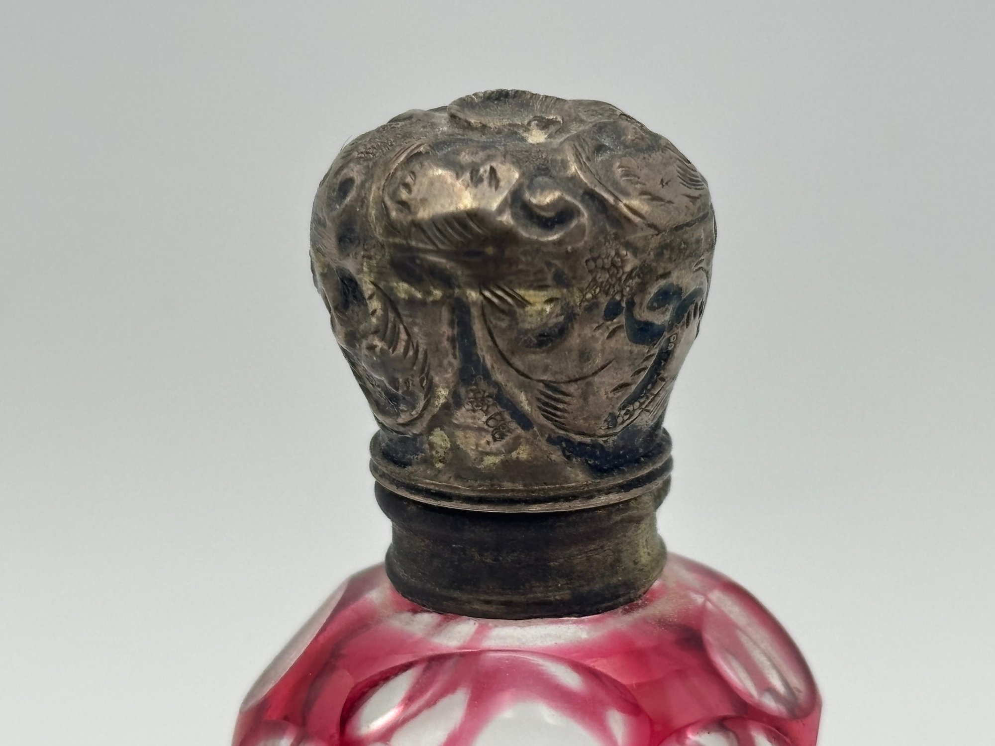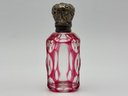 Antique 19th Century Red Cranberry Cut Glass Perfume Scent Bottle With Sterling Silver Hinged Cap 2.5"
