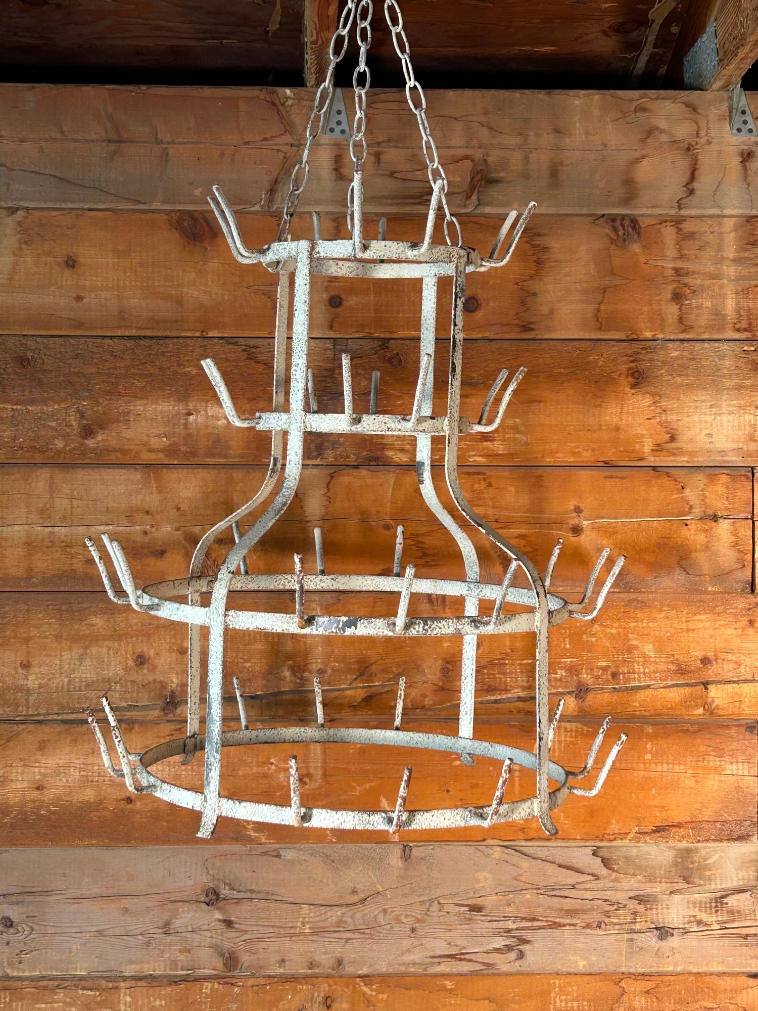 Originating from 19th to early 20th-century French farmhouses and vineyards, this drying rack was traditionally used for drying glass bottles after washing. Its rustic patina and aged metal frame reflect its authentic history and long-standing use