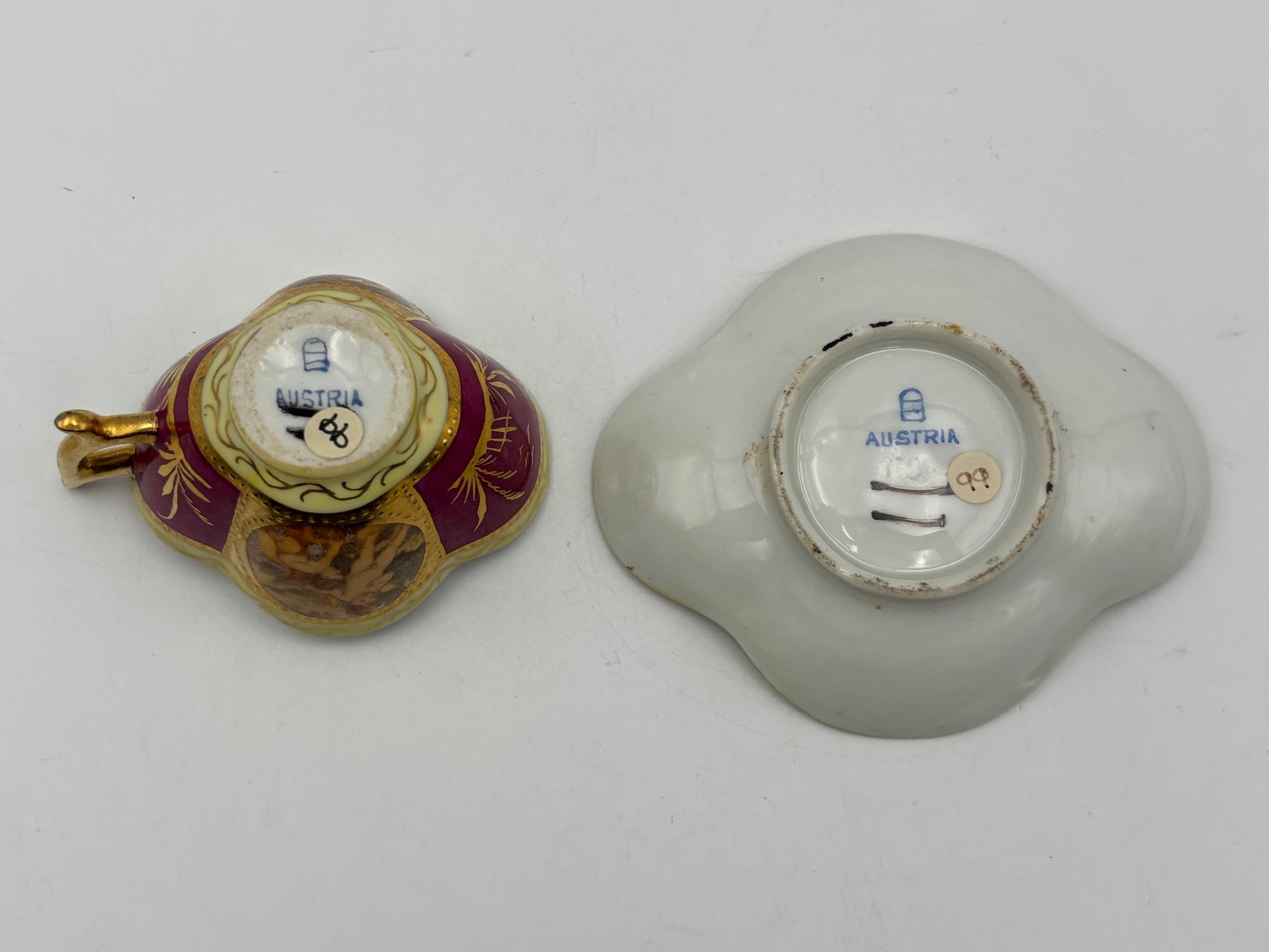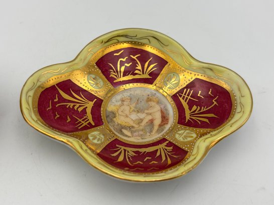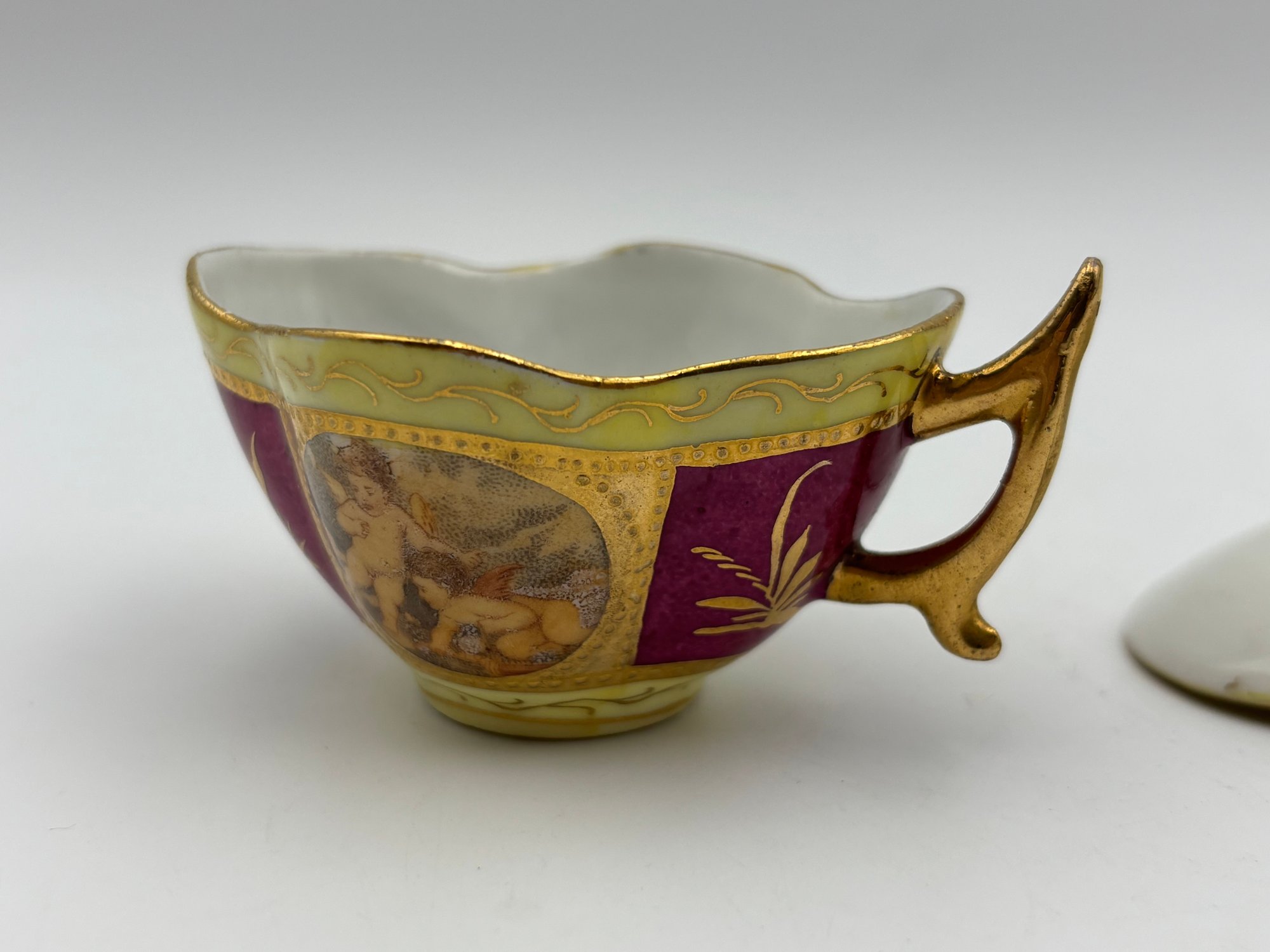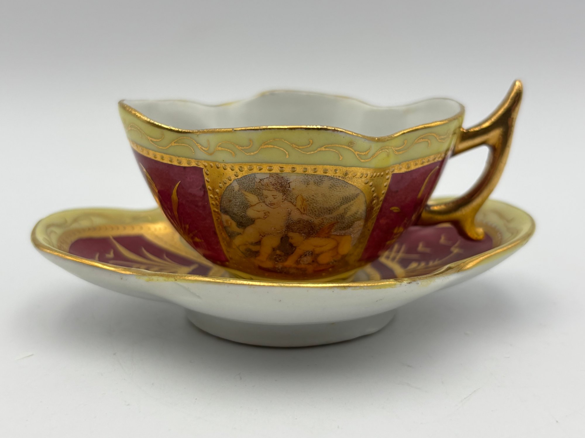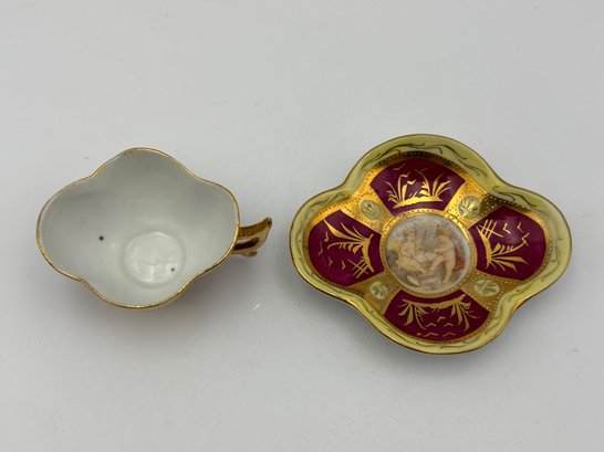 Antique Austrian Demitasse Teacup And Saucer Cerise And Gold Gilt With Cherubs In Panels W/ Wishbone Handle