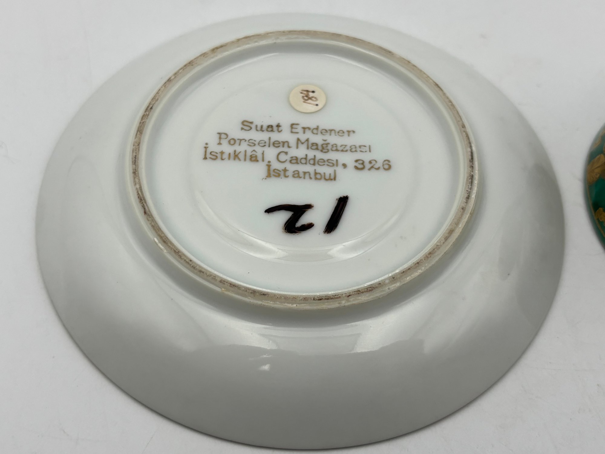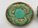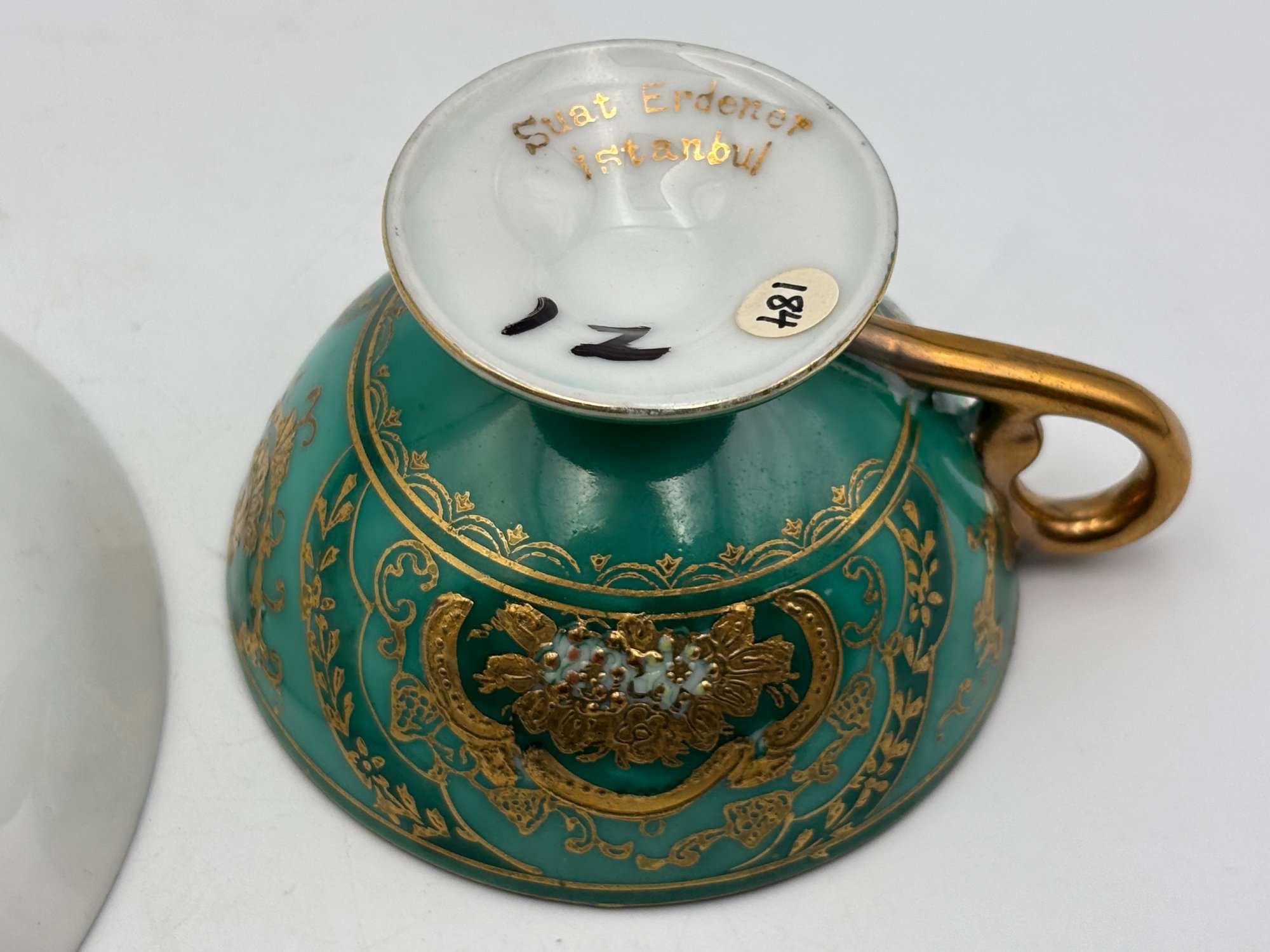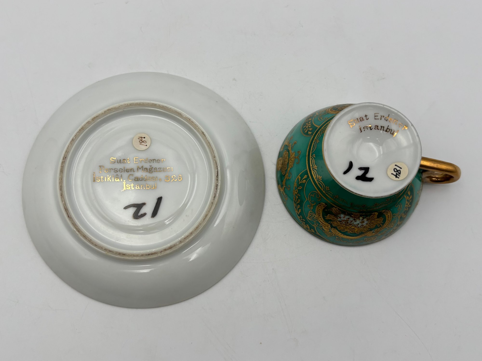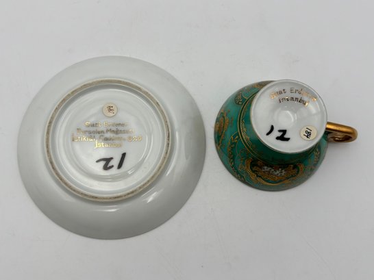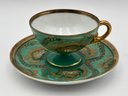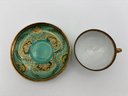 Antique Austrian Or German Demitasse Teacup And Saucer Bluish Green Turqoise Ornate With Gold Decorations