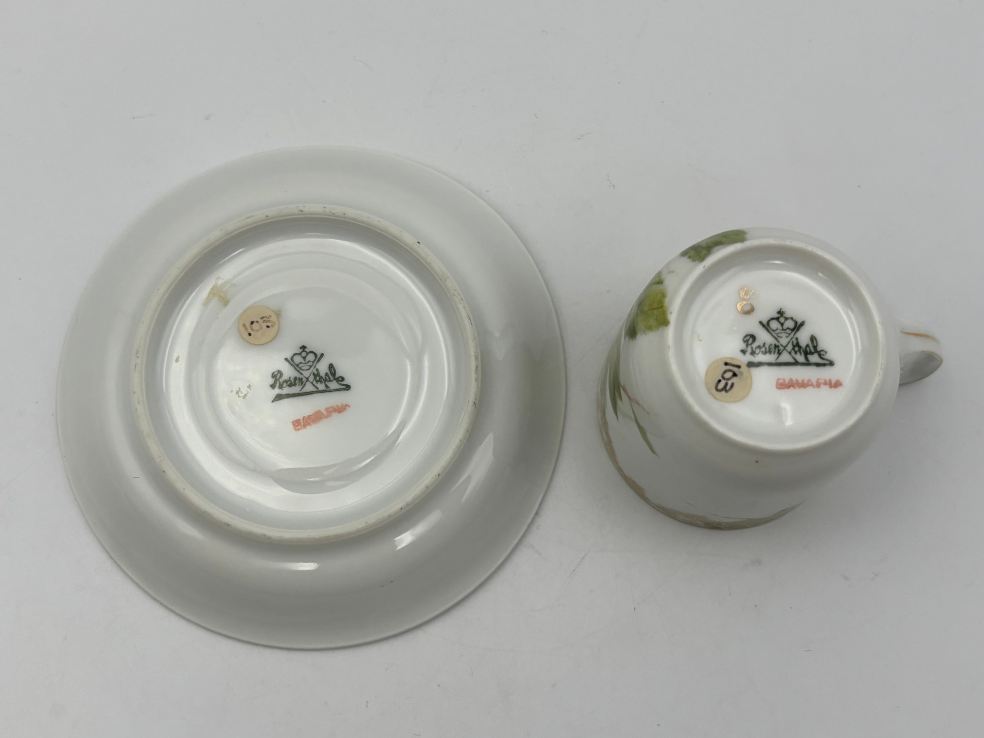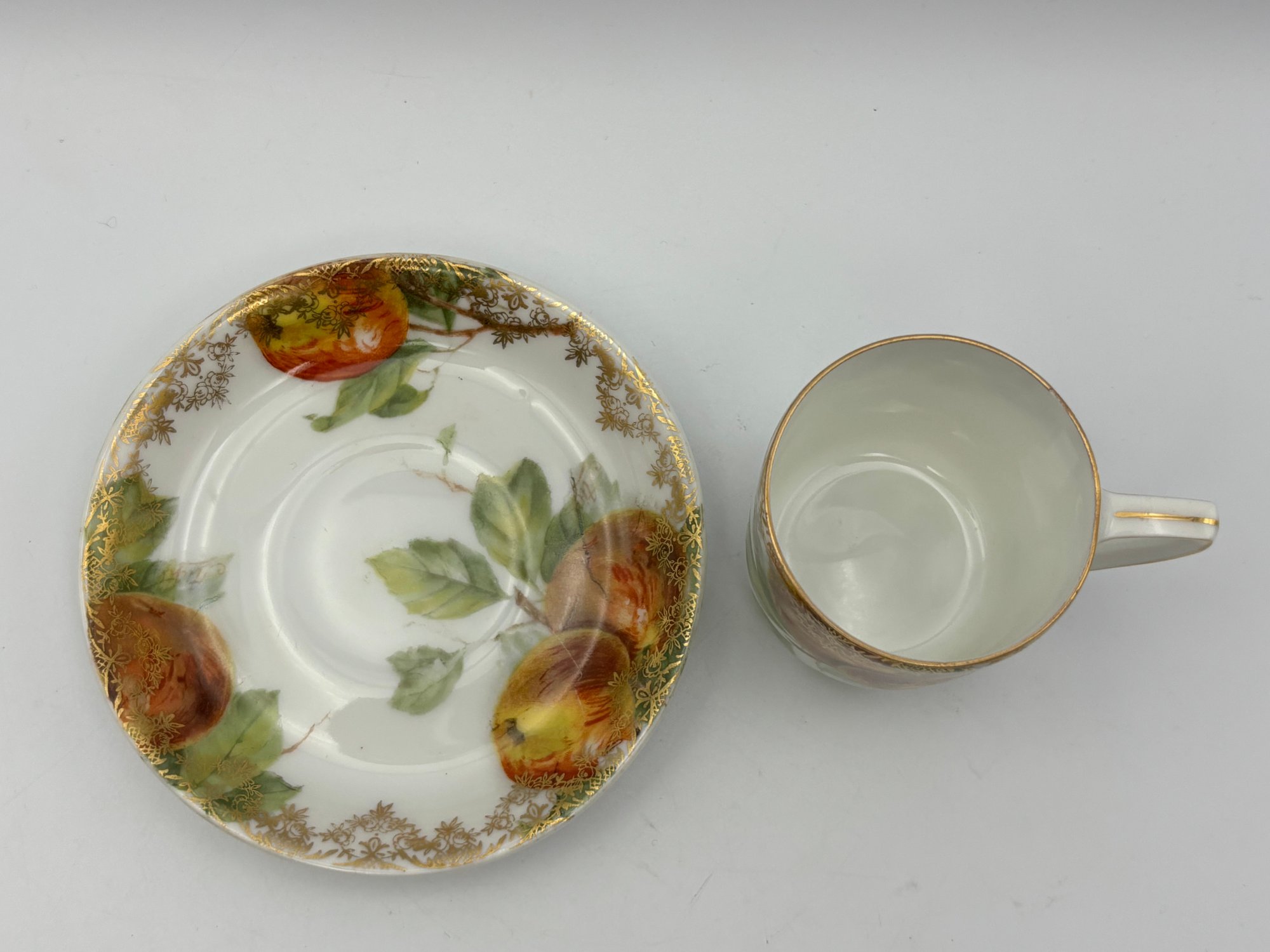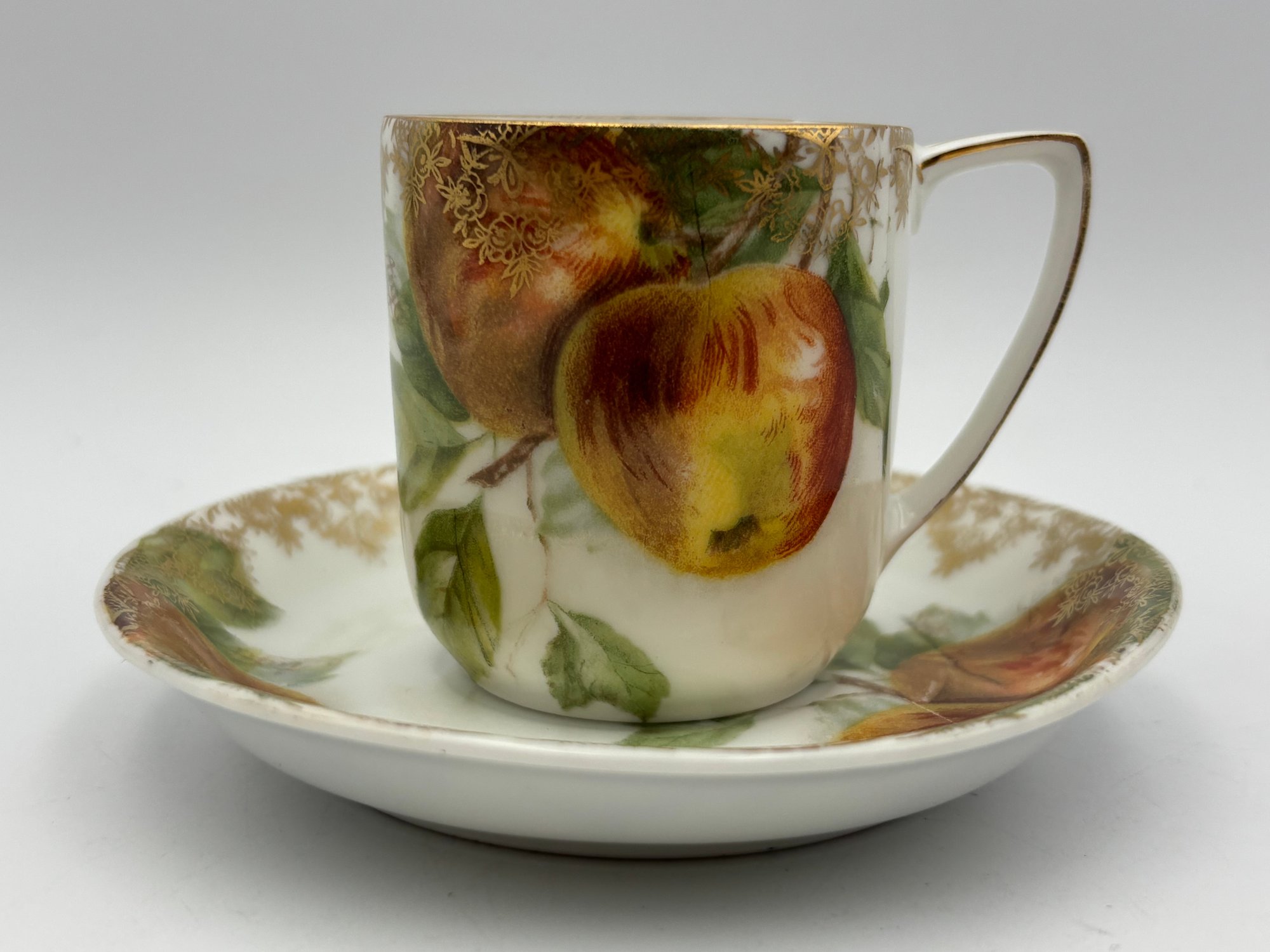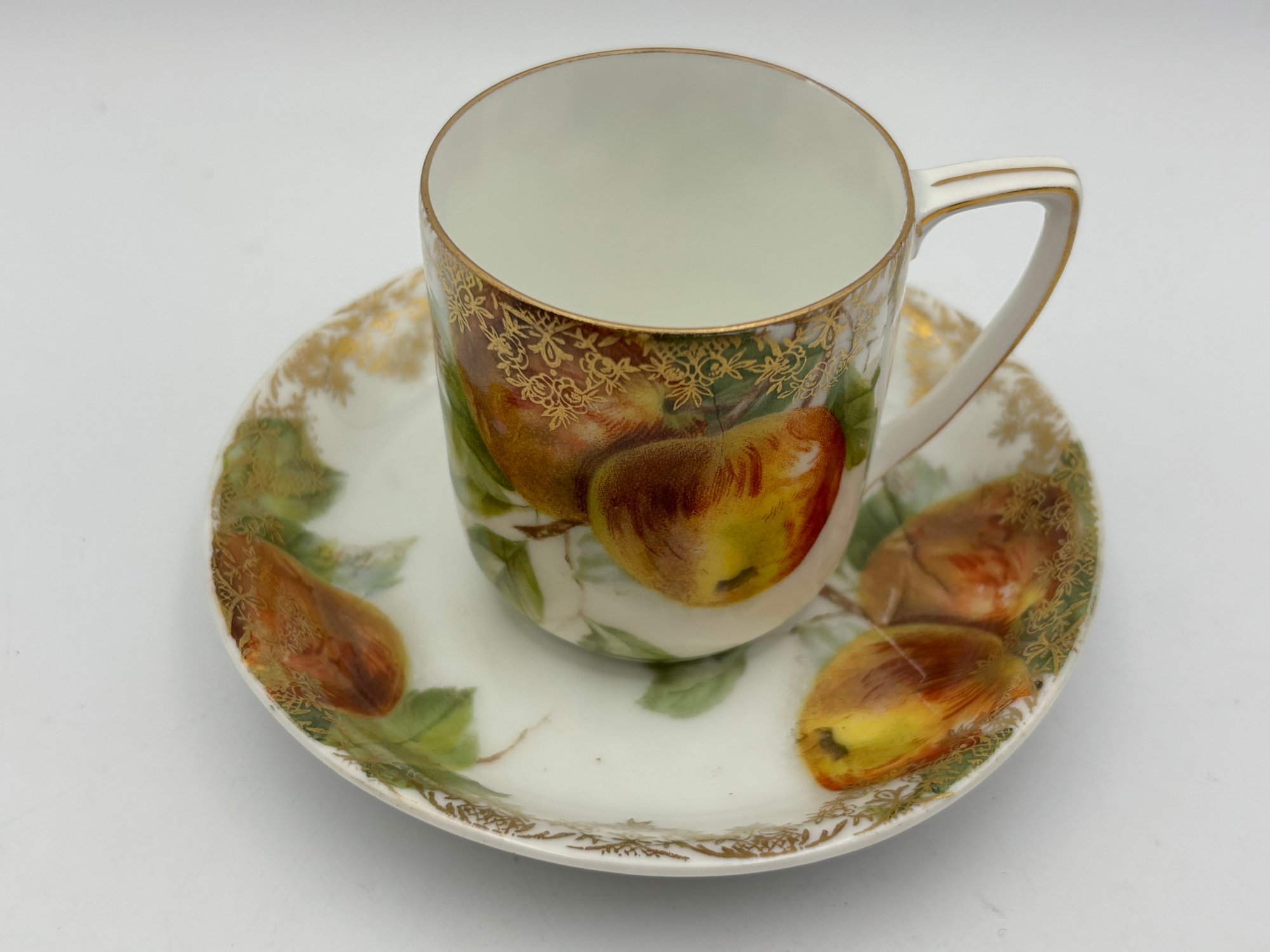 Antique Bavarian Rosenthal Demitasse Teacup And Saucer Apple Decorations On White Porcelain Gold Gilt
