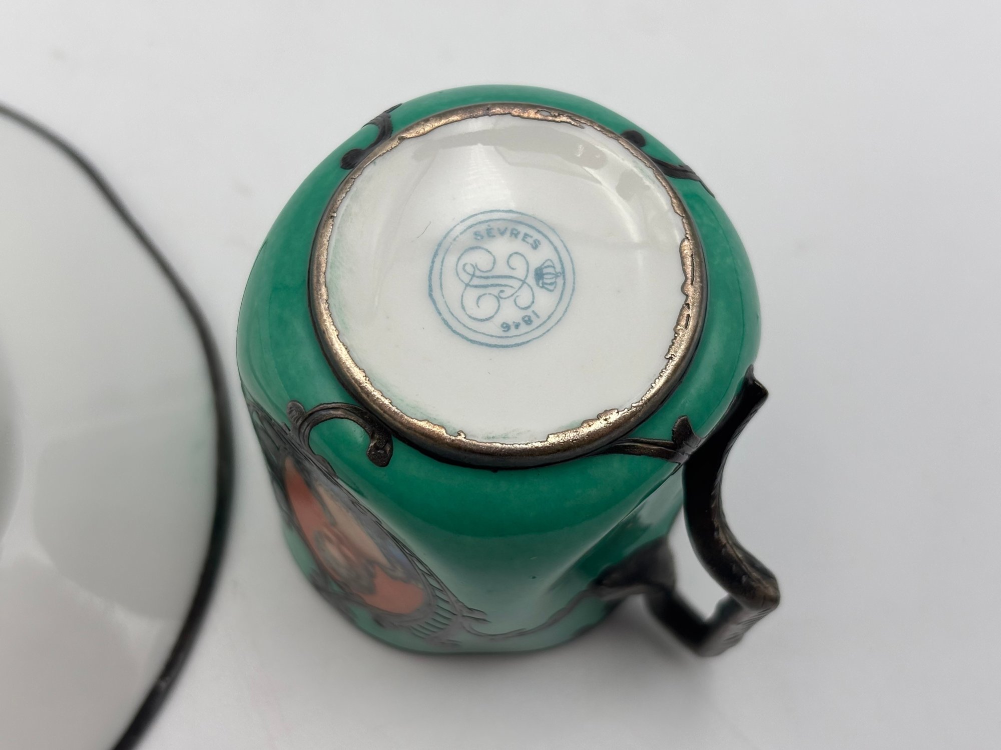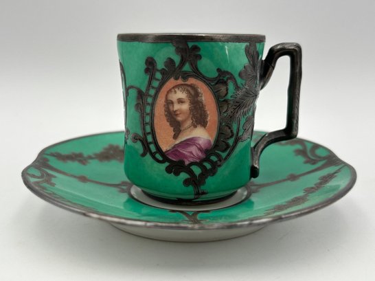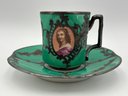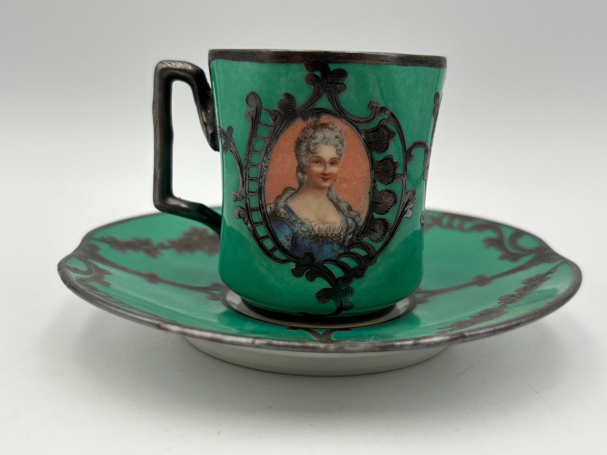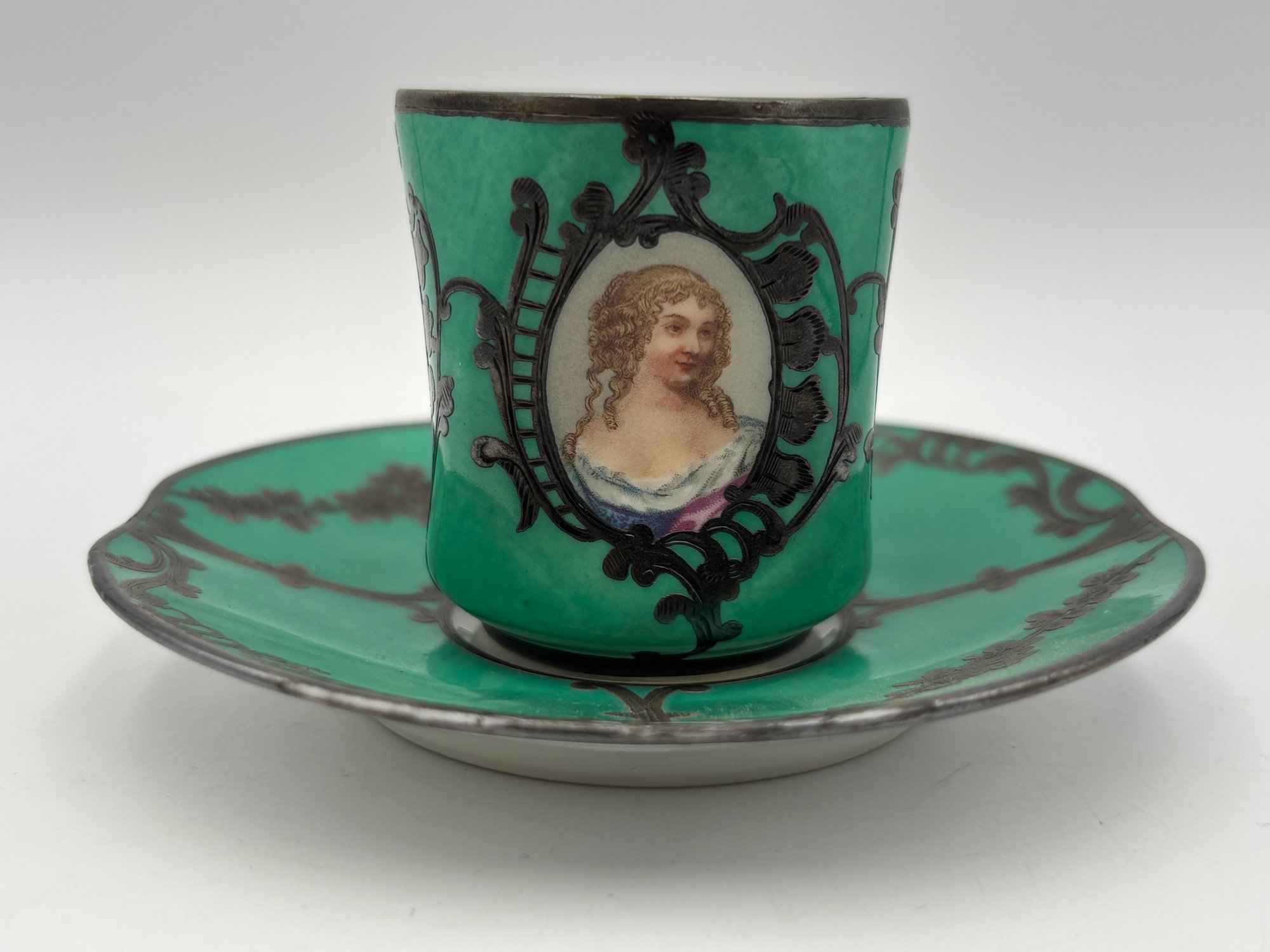 Antique Demitasse Sevres Porcelain French Teacup 3 Portrait Victorian Teal With Silver Decorations