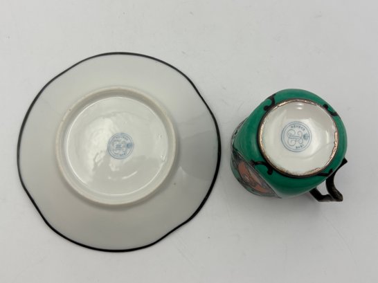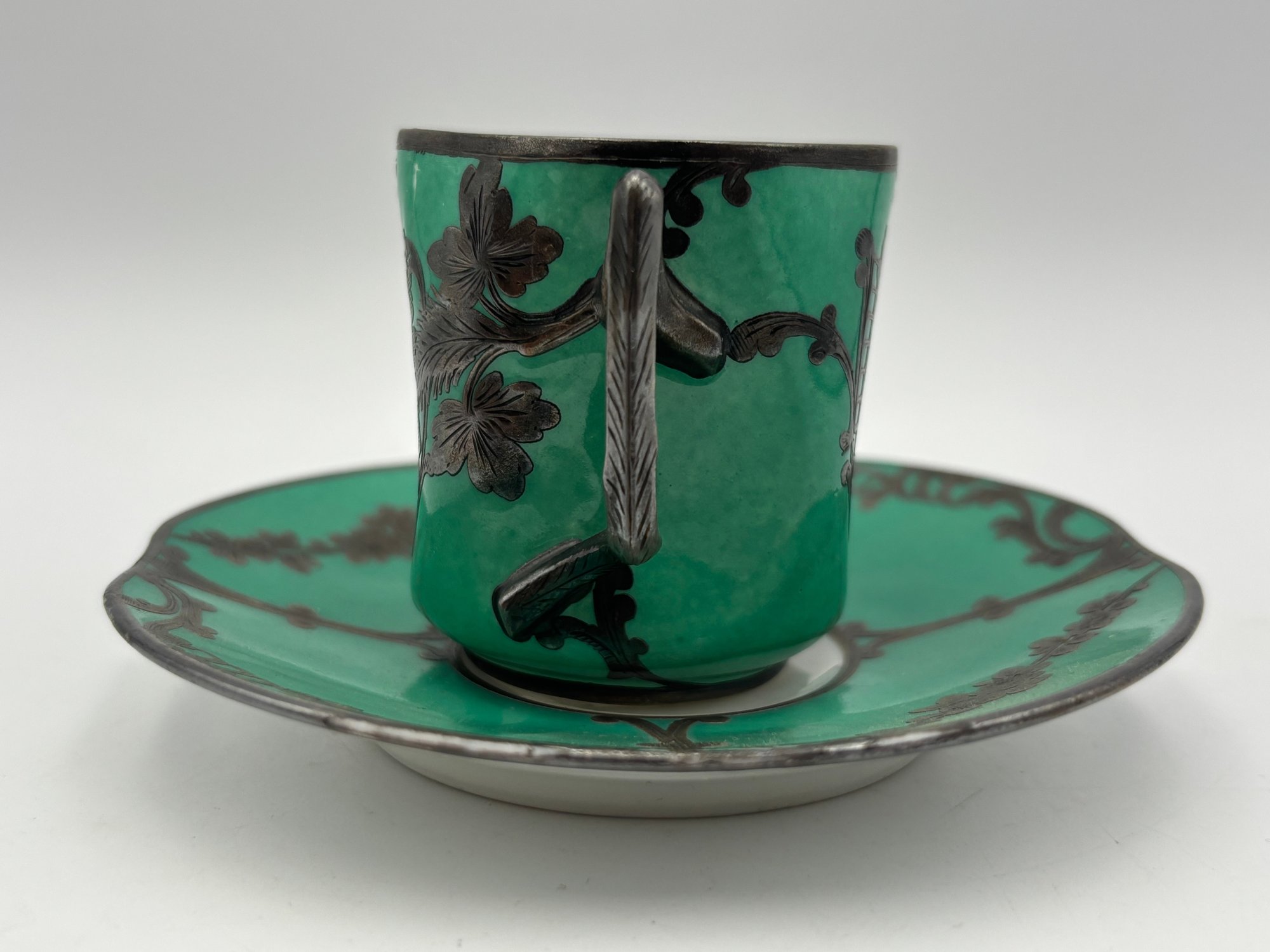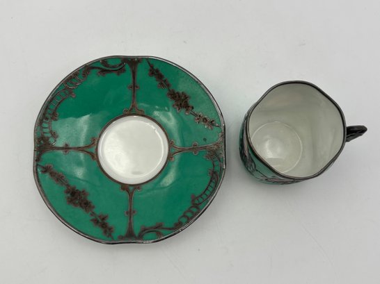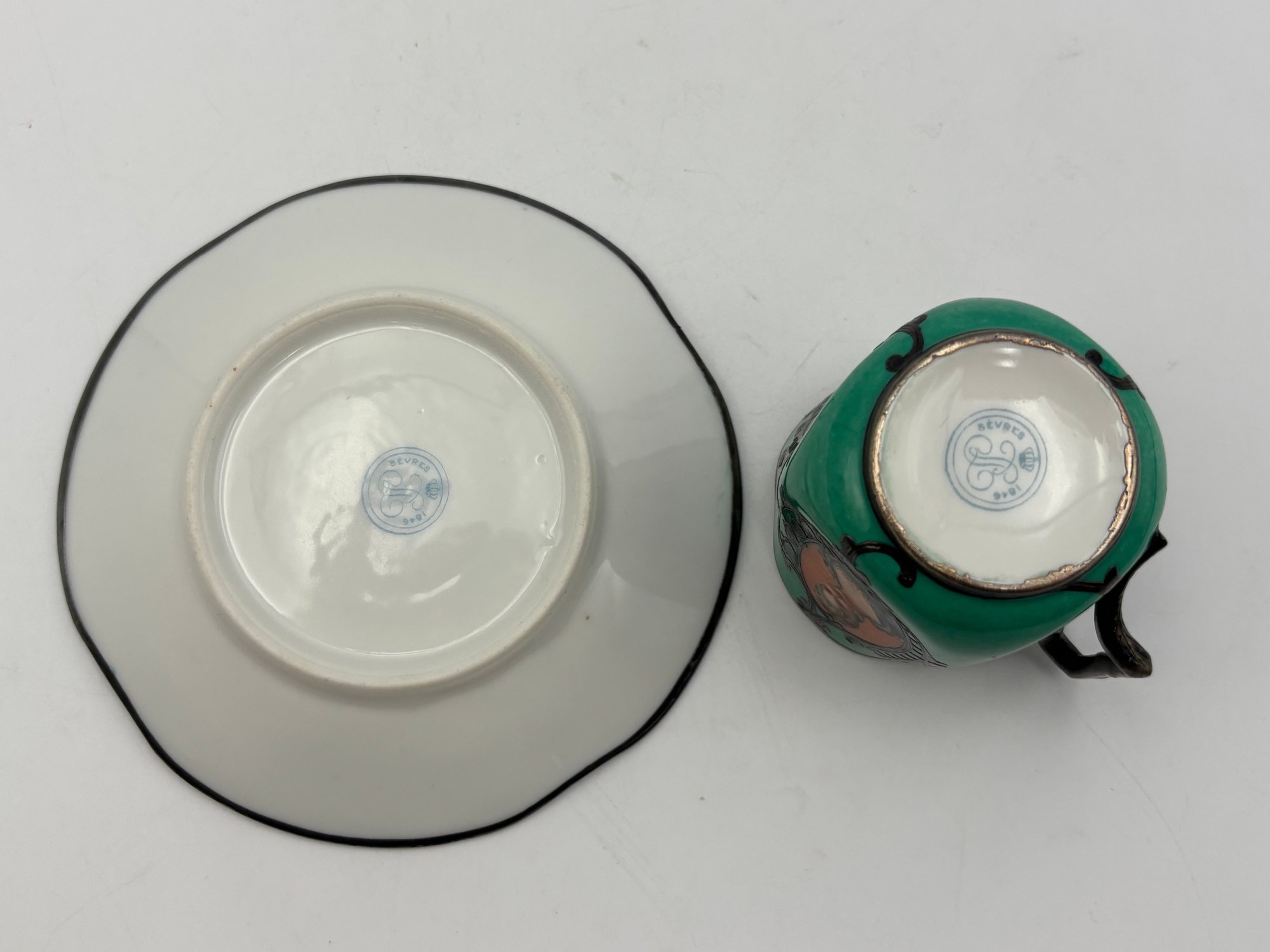 Antique Demitasse Sevres Porcelain French Teacup 3 Portrait Victorian Teal With Silver Decorations