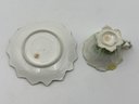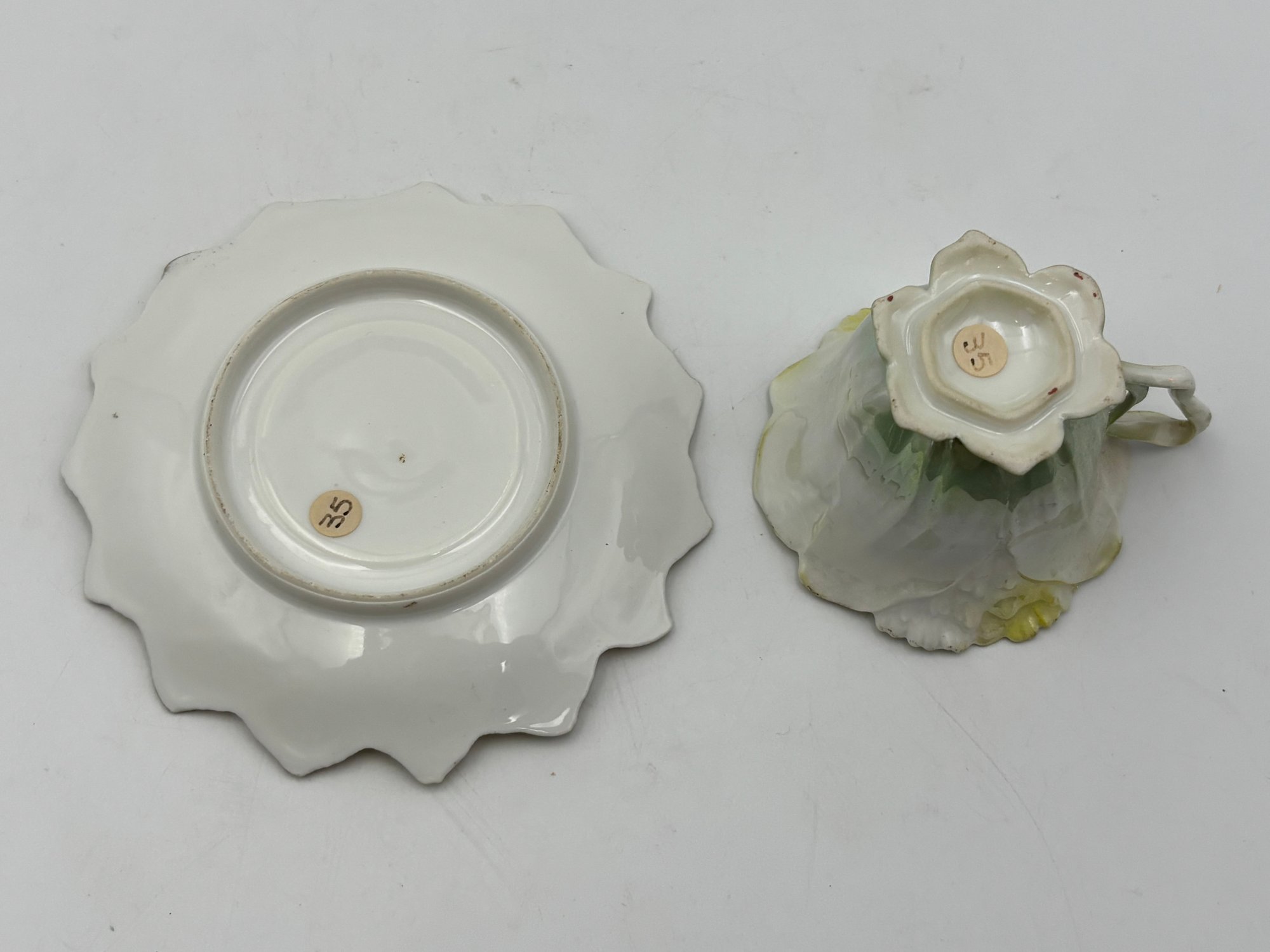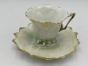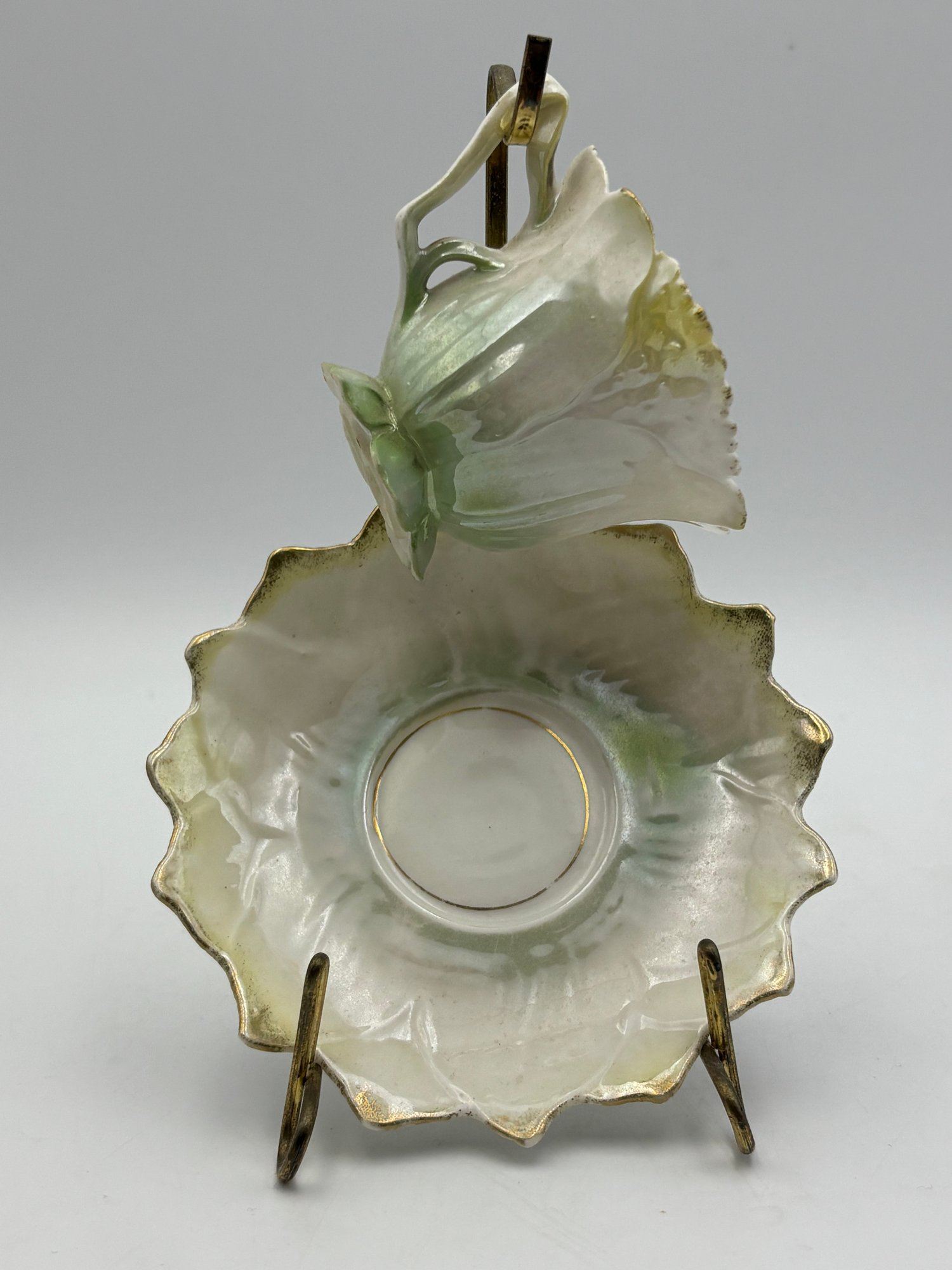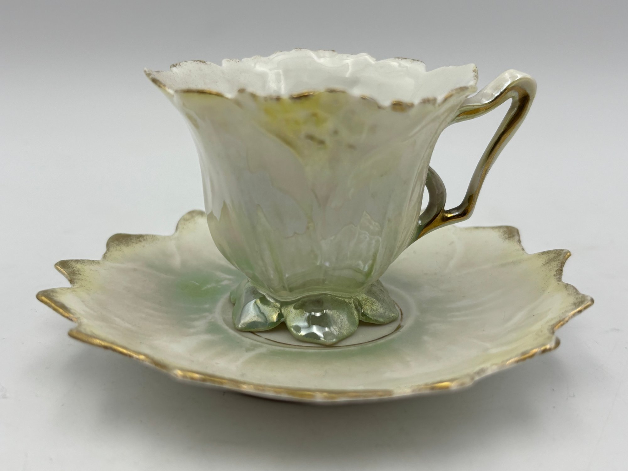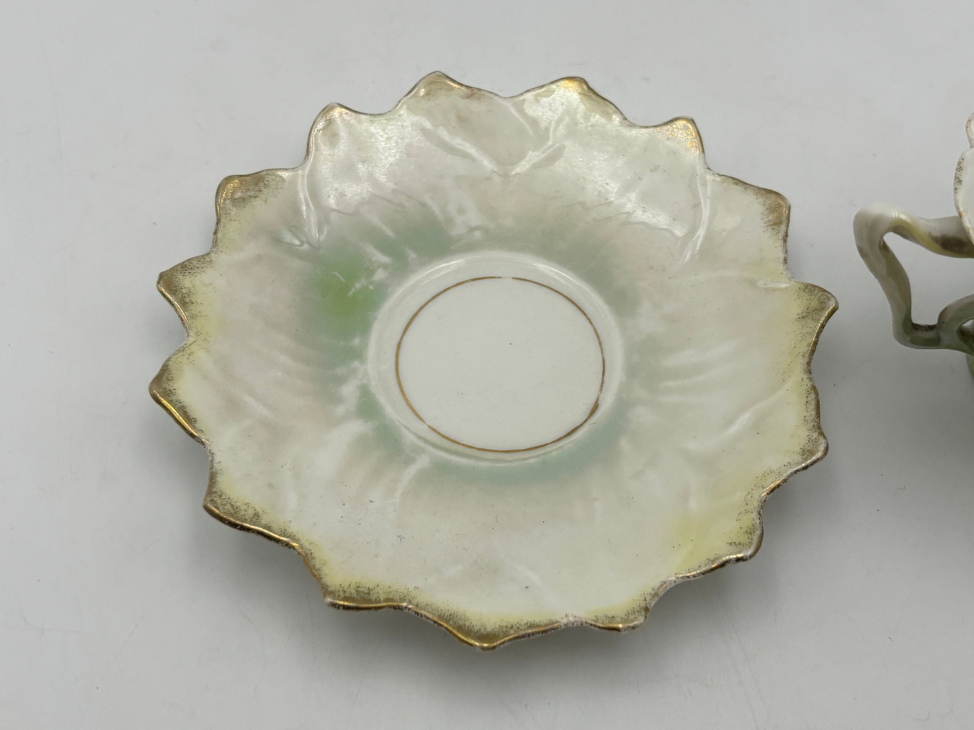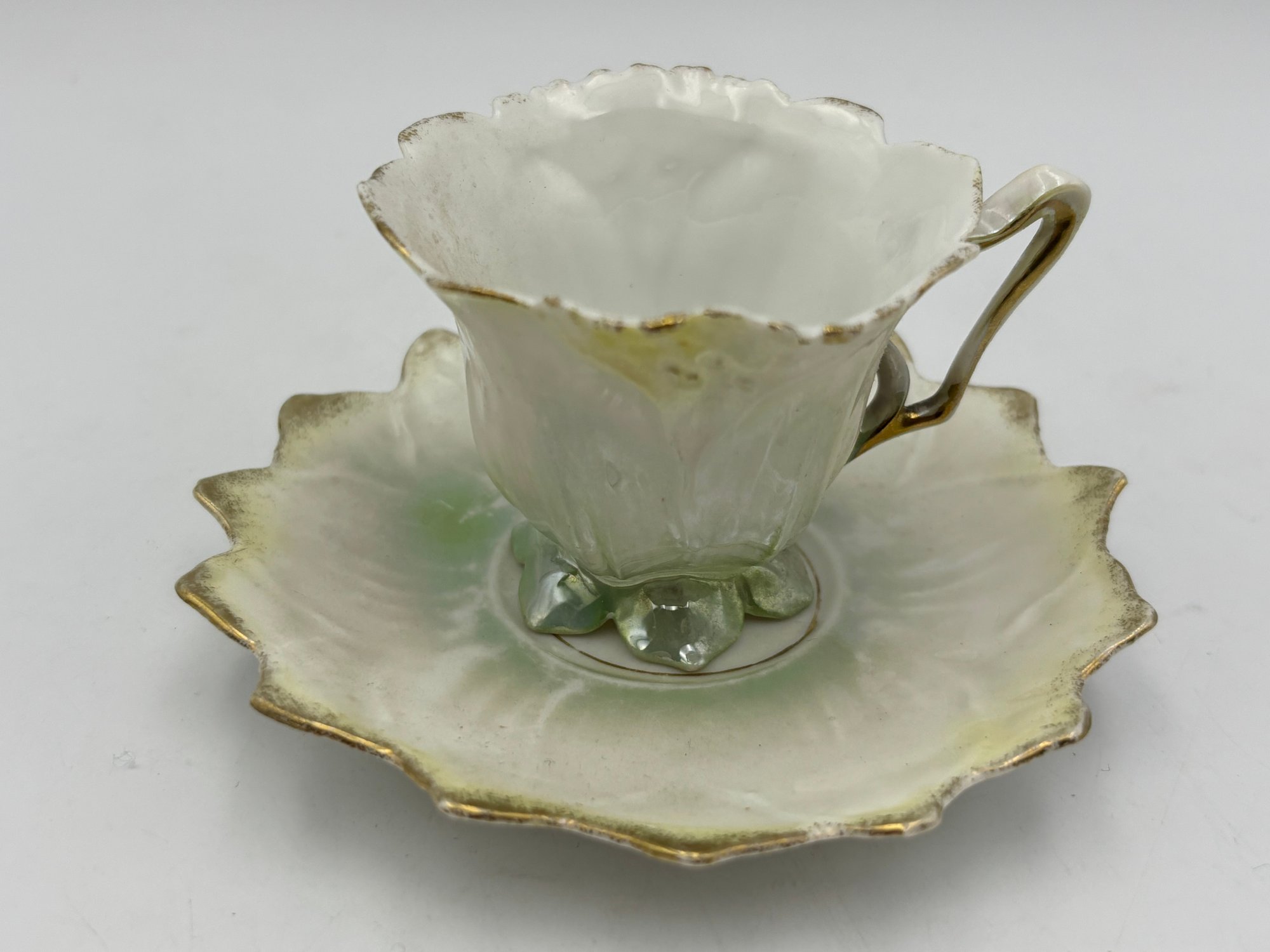 Antique Demitasse Teacup & Saucer With Stand Scalloped Green Lustre Flower Cup Open Flower Petal Design