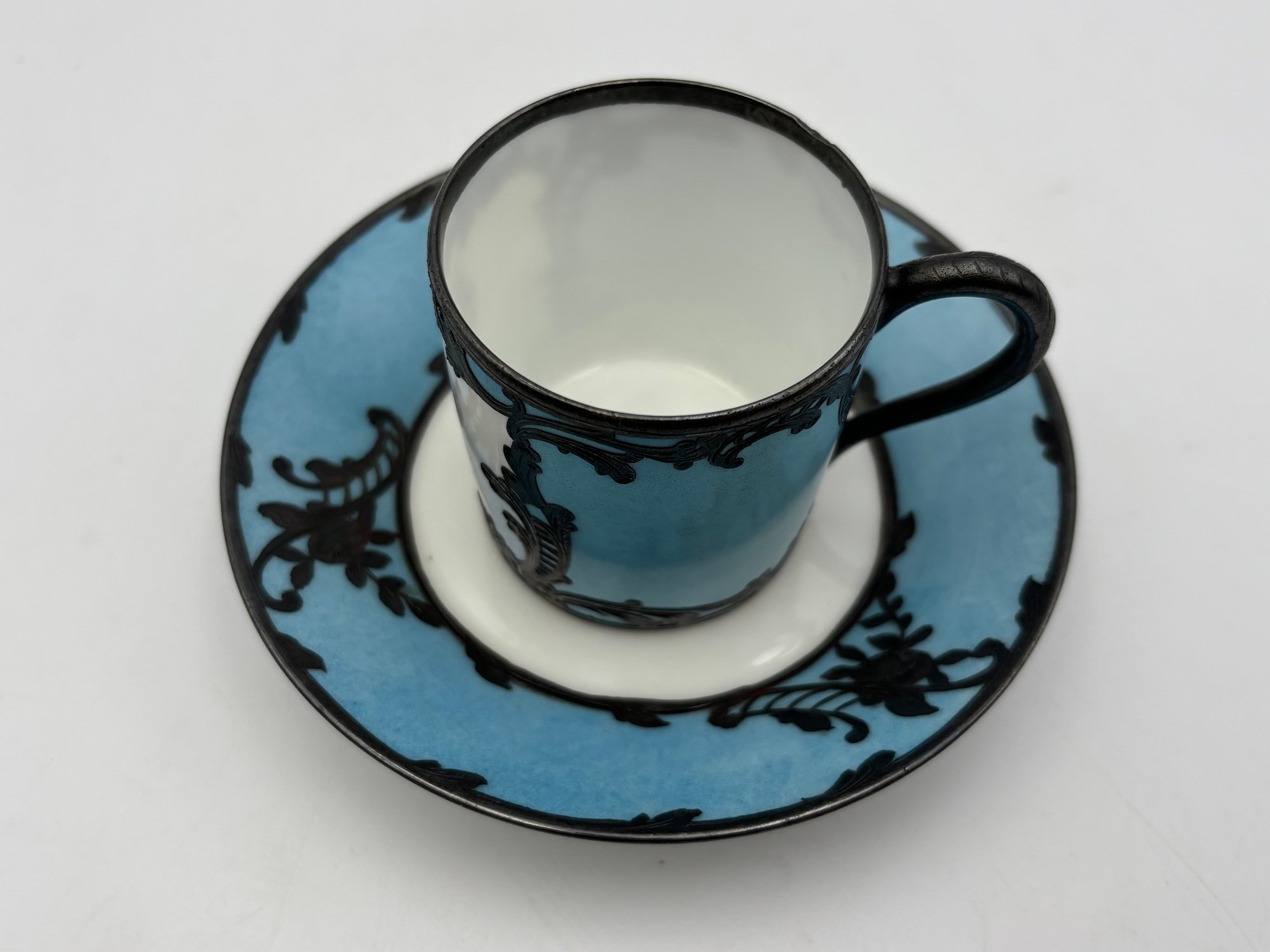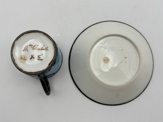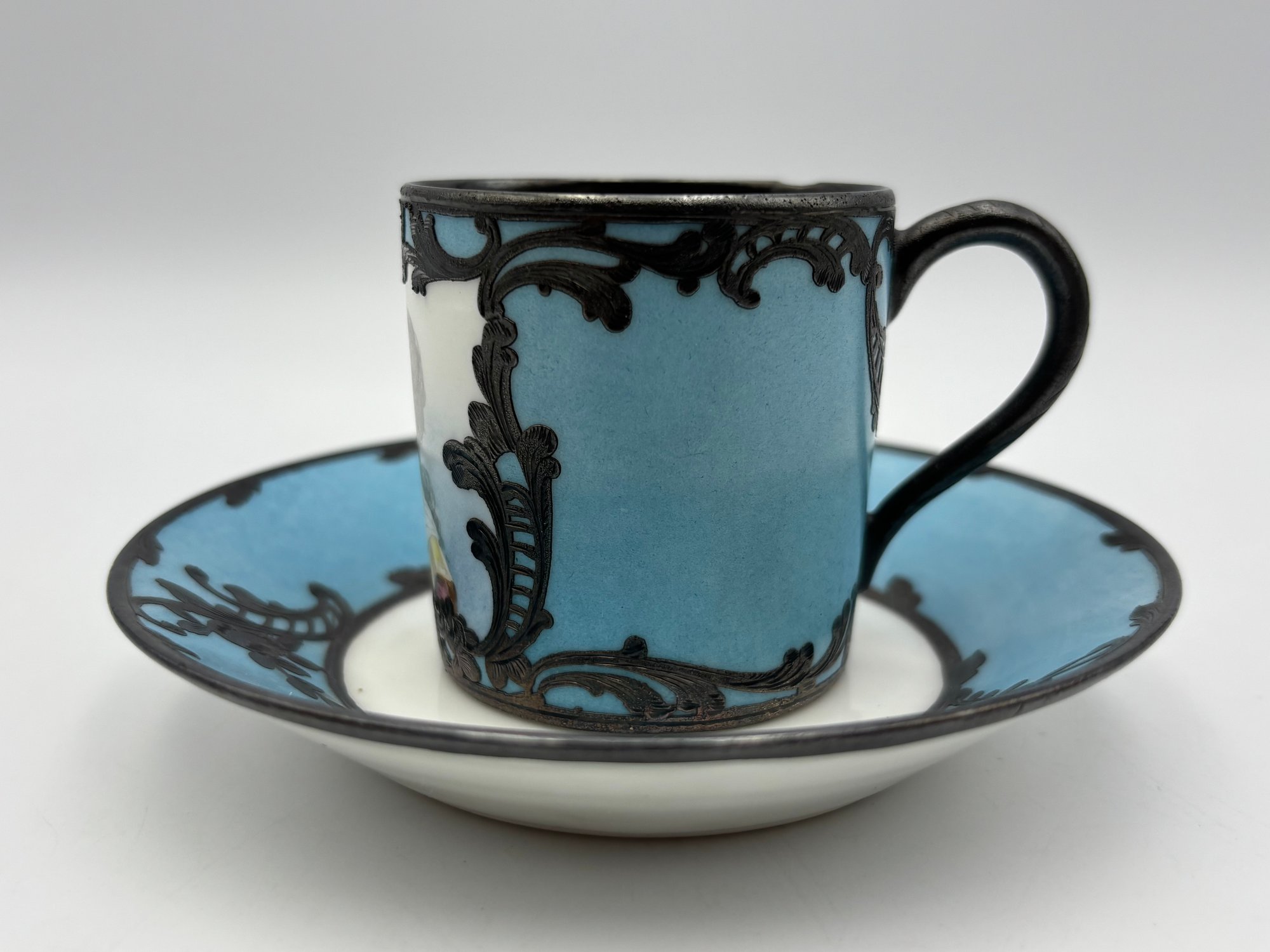 Antique French Demitasee Teacup & Saucer "Madame Elizabeth" Signed By Cler Portrait Blue W/ Silver Decoration