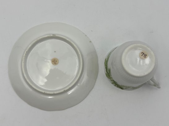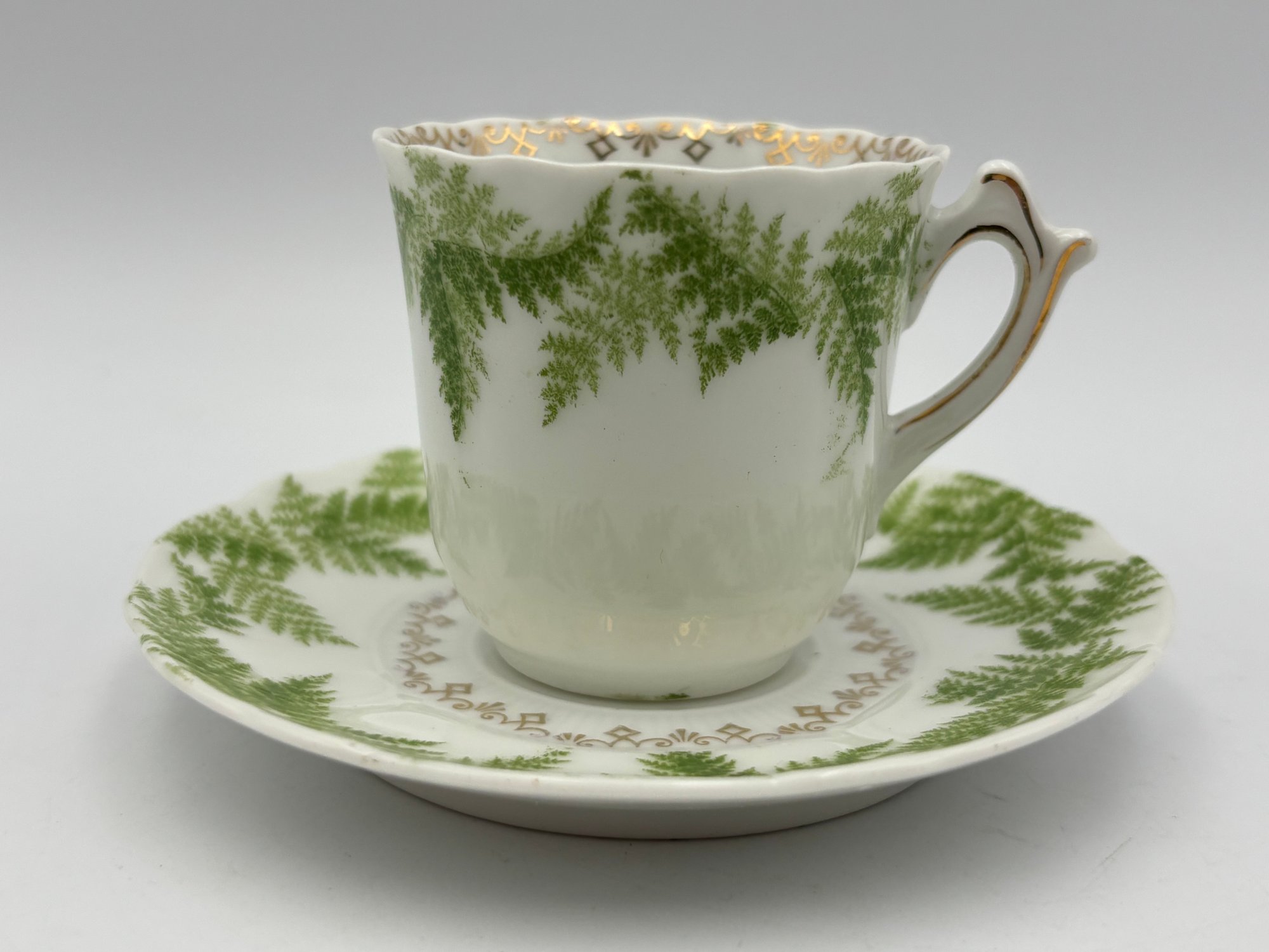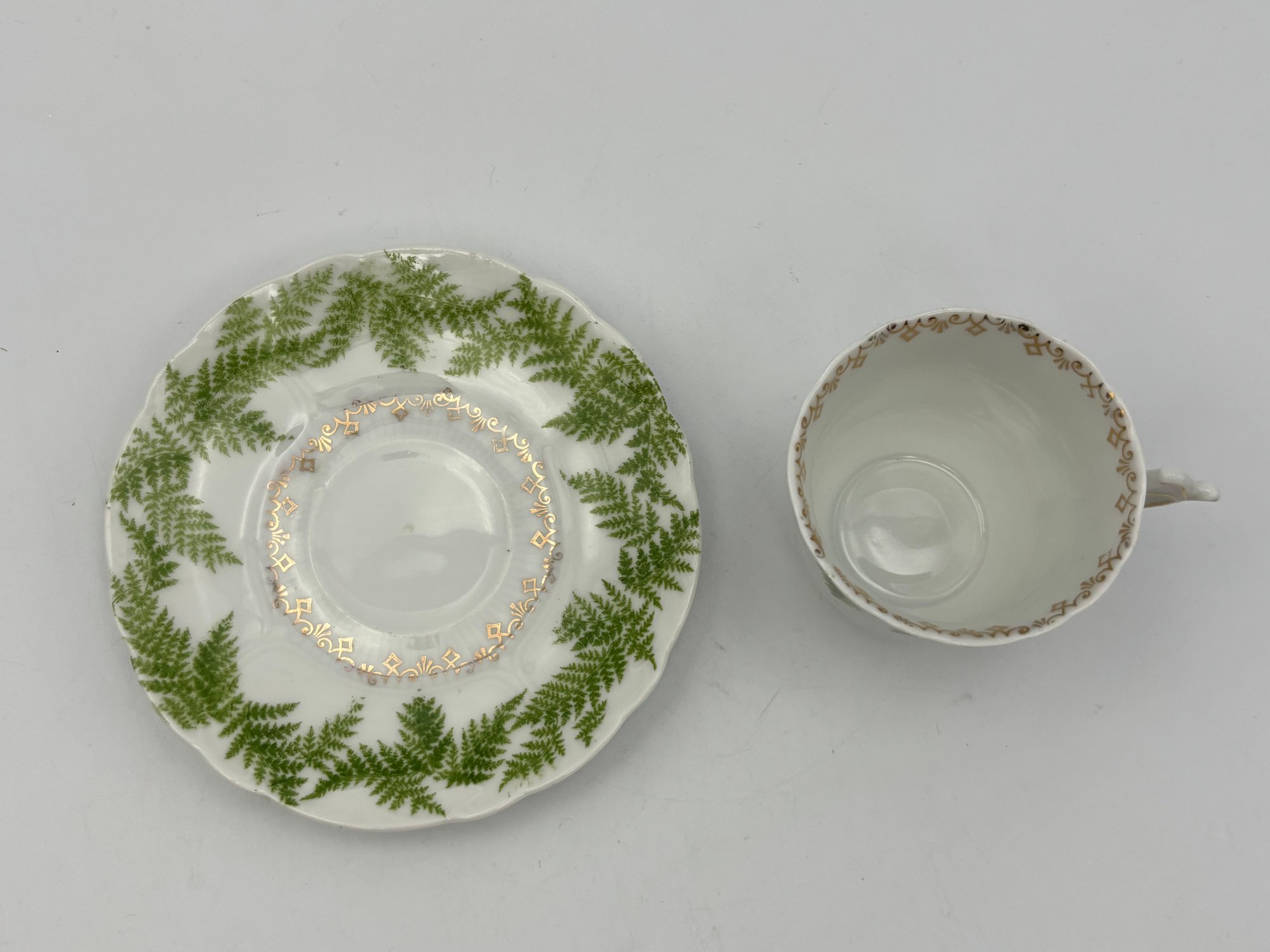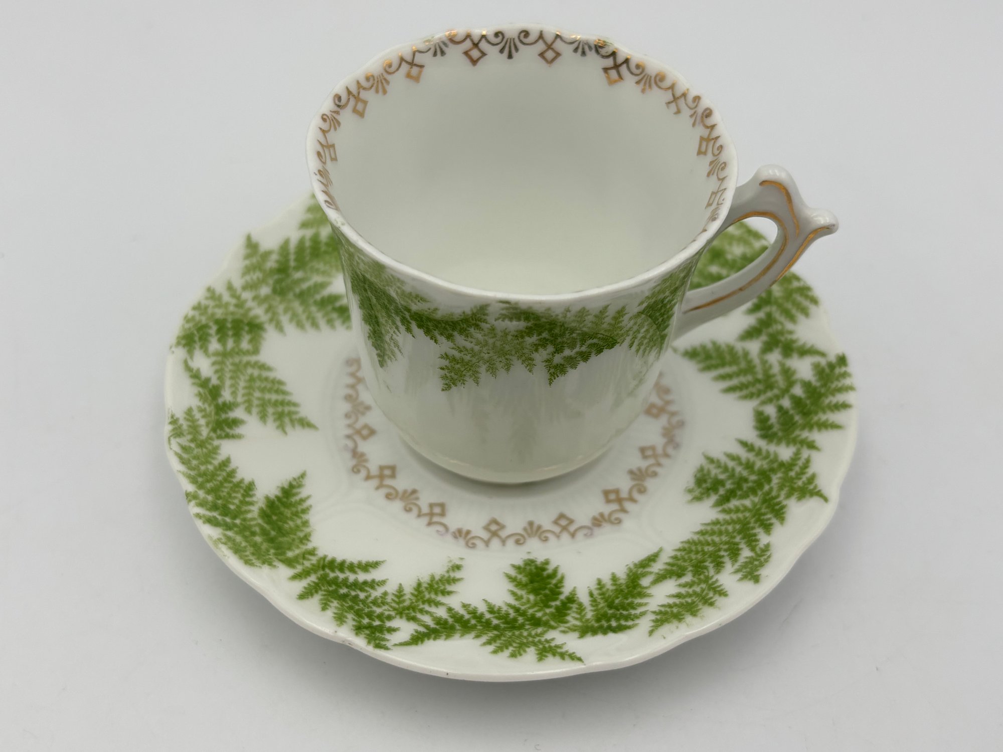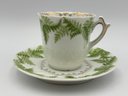 Antique German Demitasse Teacup And Saucer White With Fern And Gold Decorations