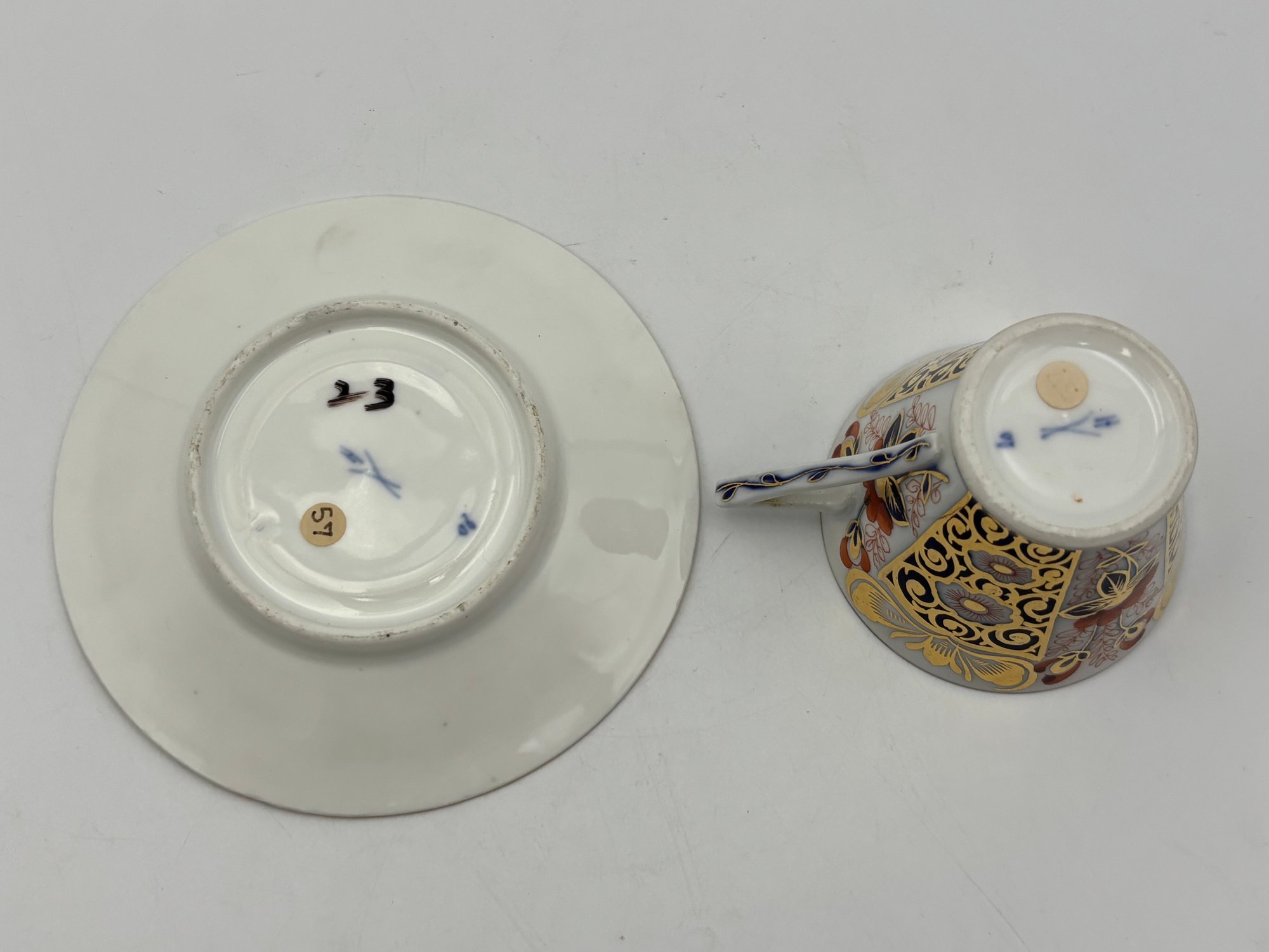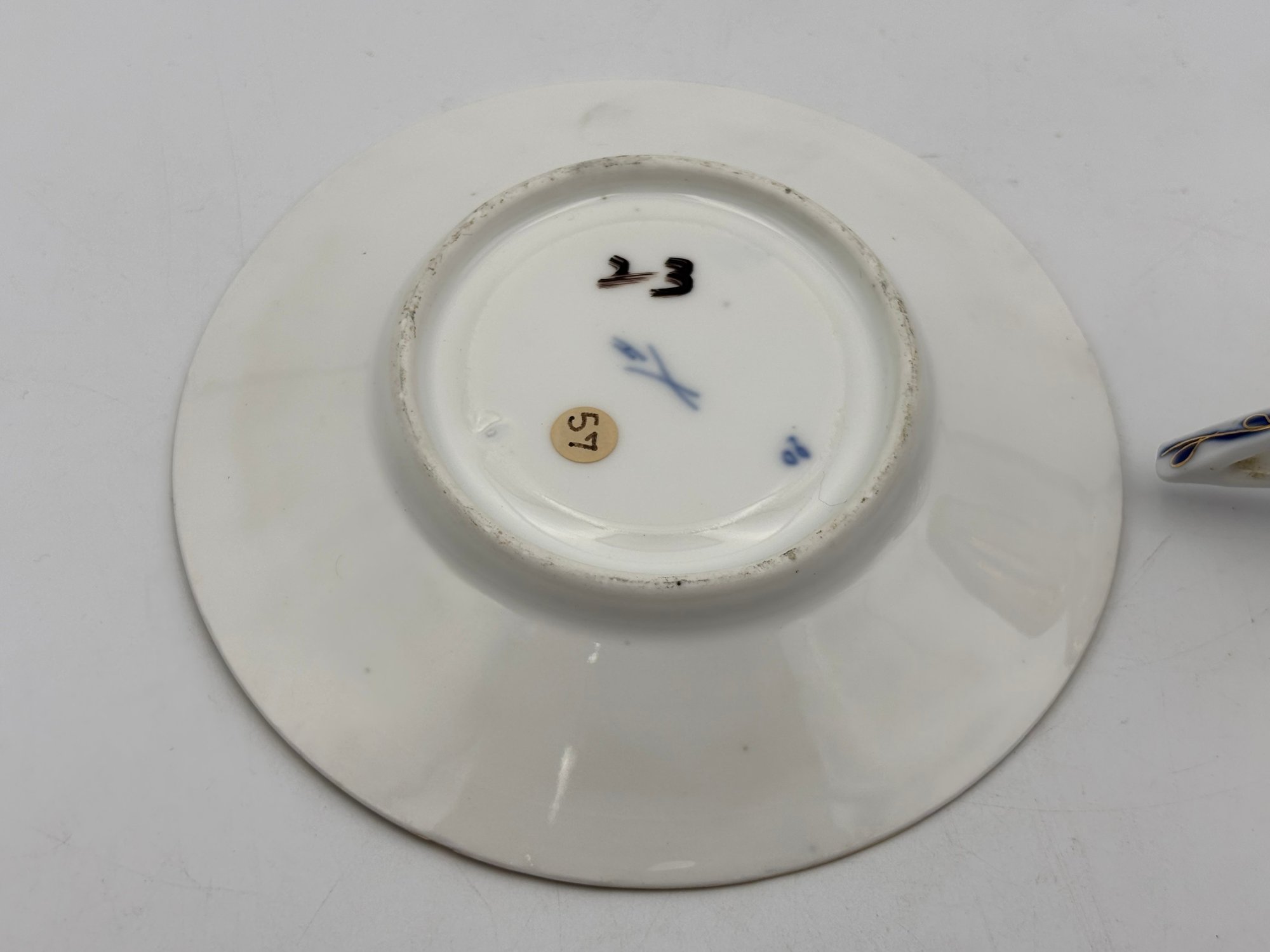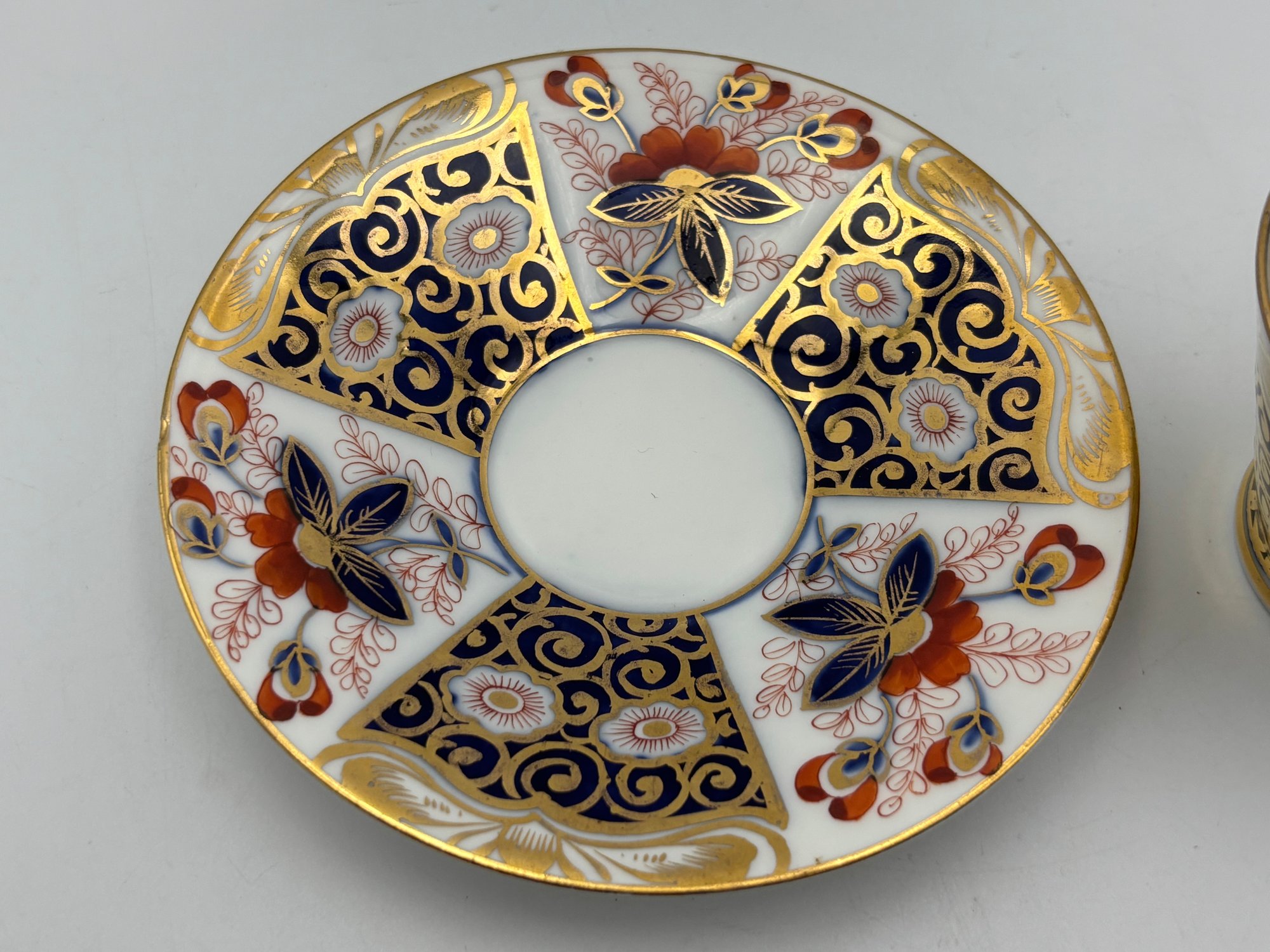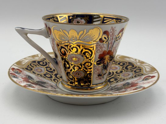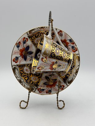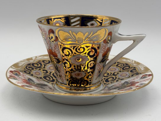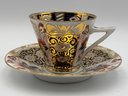 Antique German Made, English Decorated Demitasse Teacup & Saucer Elaborate Crown Derby Decor W/ Wire Stand