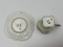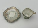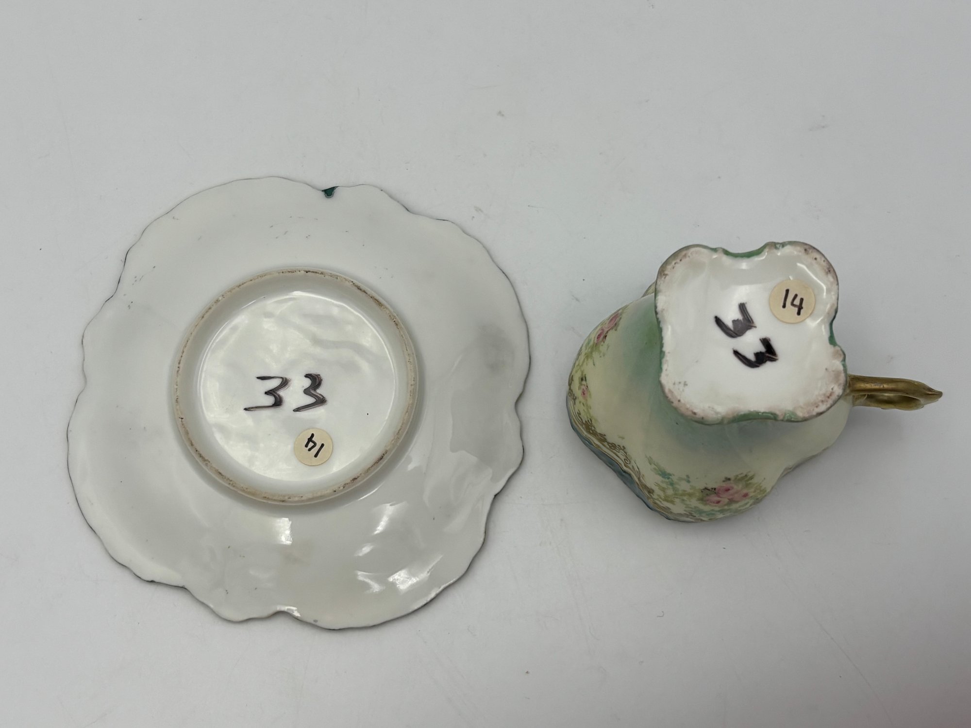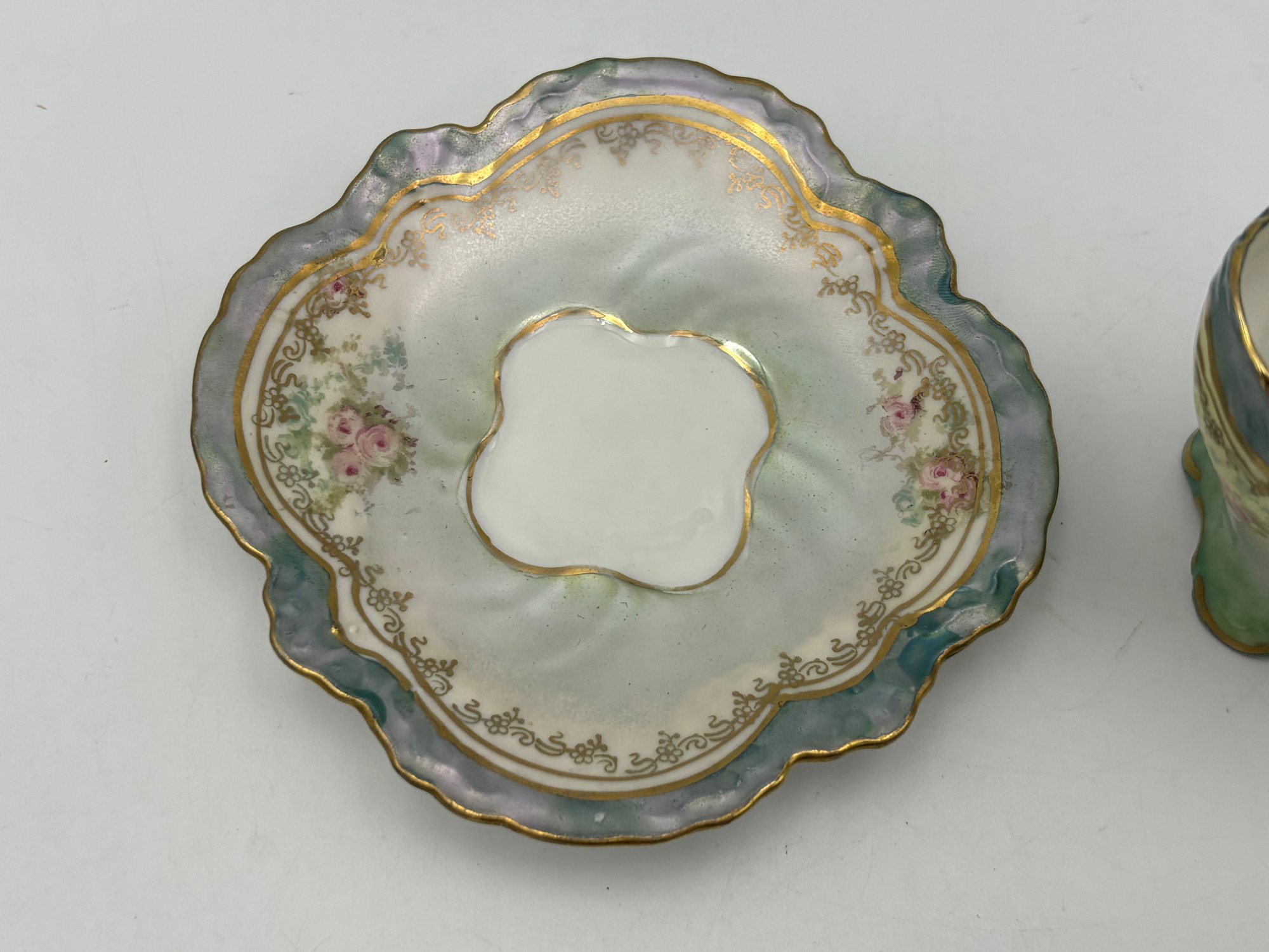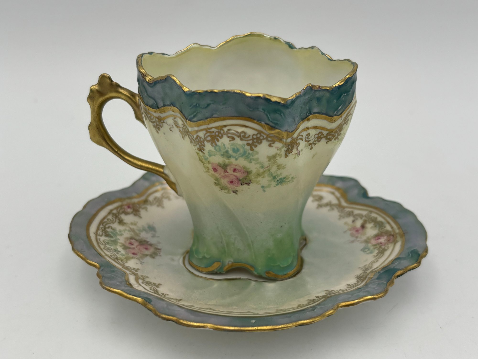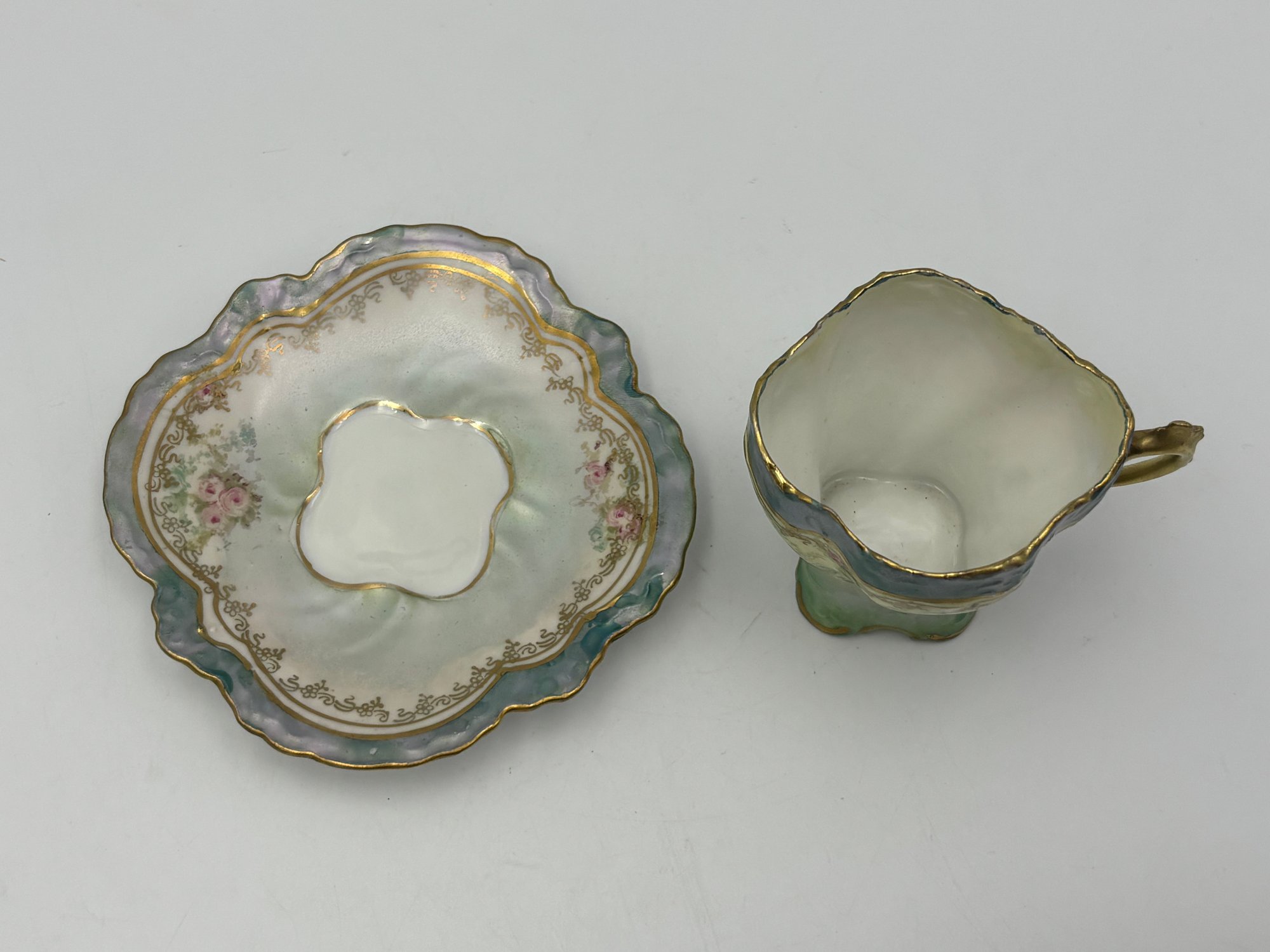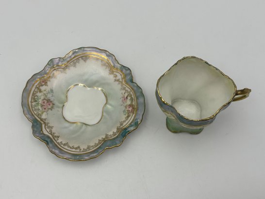 Antique German Victorian Demitasse Square Teacup And Saucer Set Gold Gilded Rim Bluish Green With Lustre