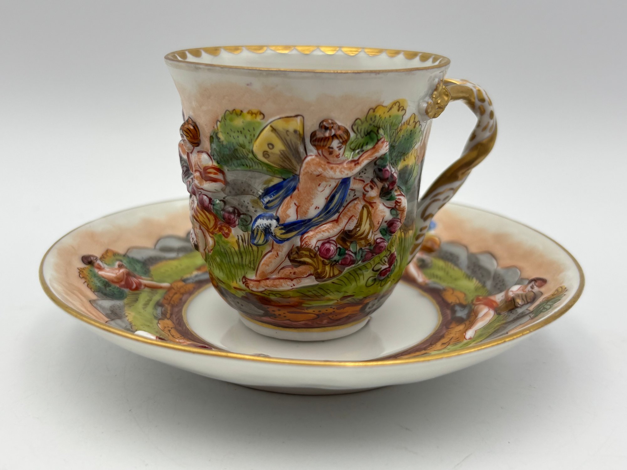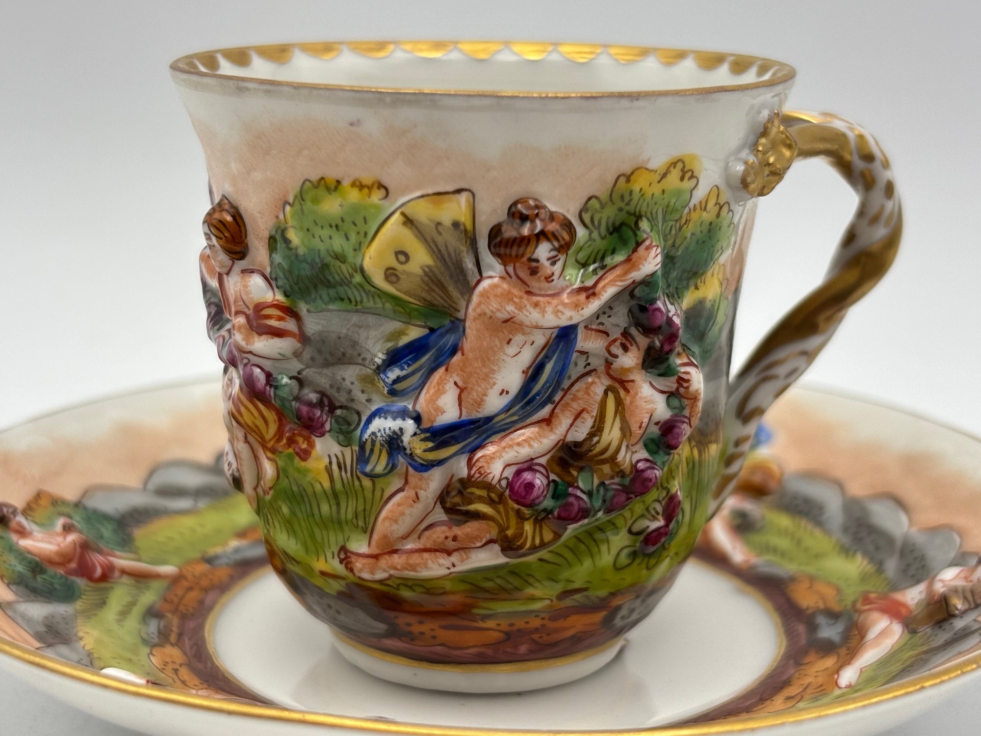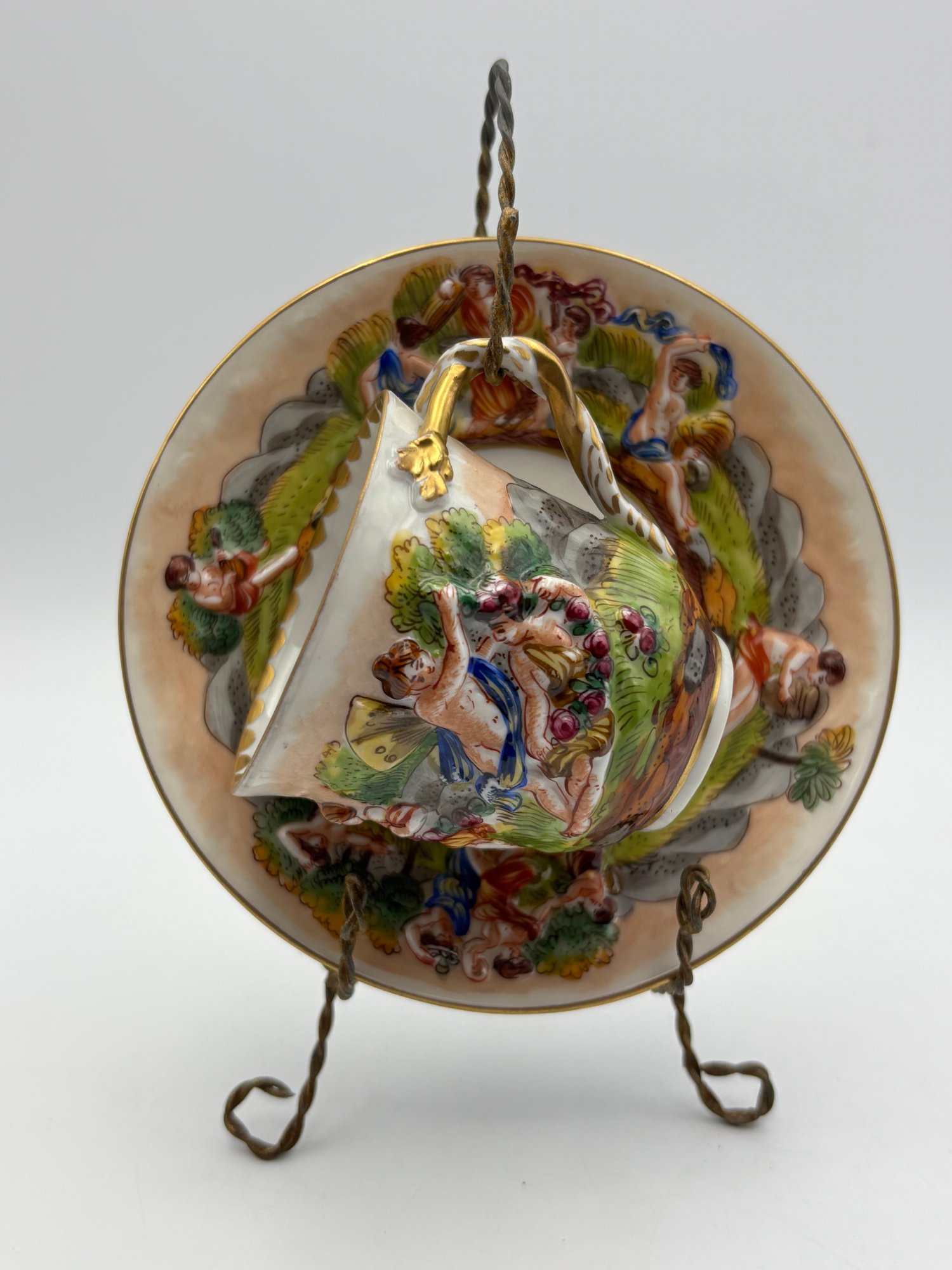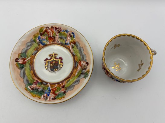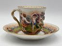 Antique Italian Capodimonte Decorative Demitasse Teacup & Saucer Ornate Depicting Roman Mythology W/ Stand