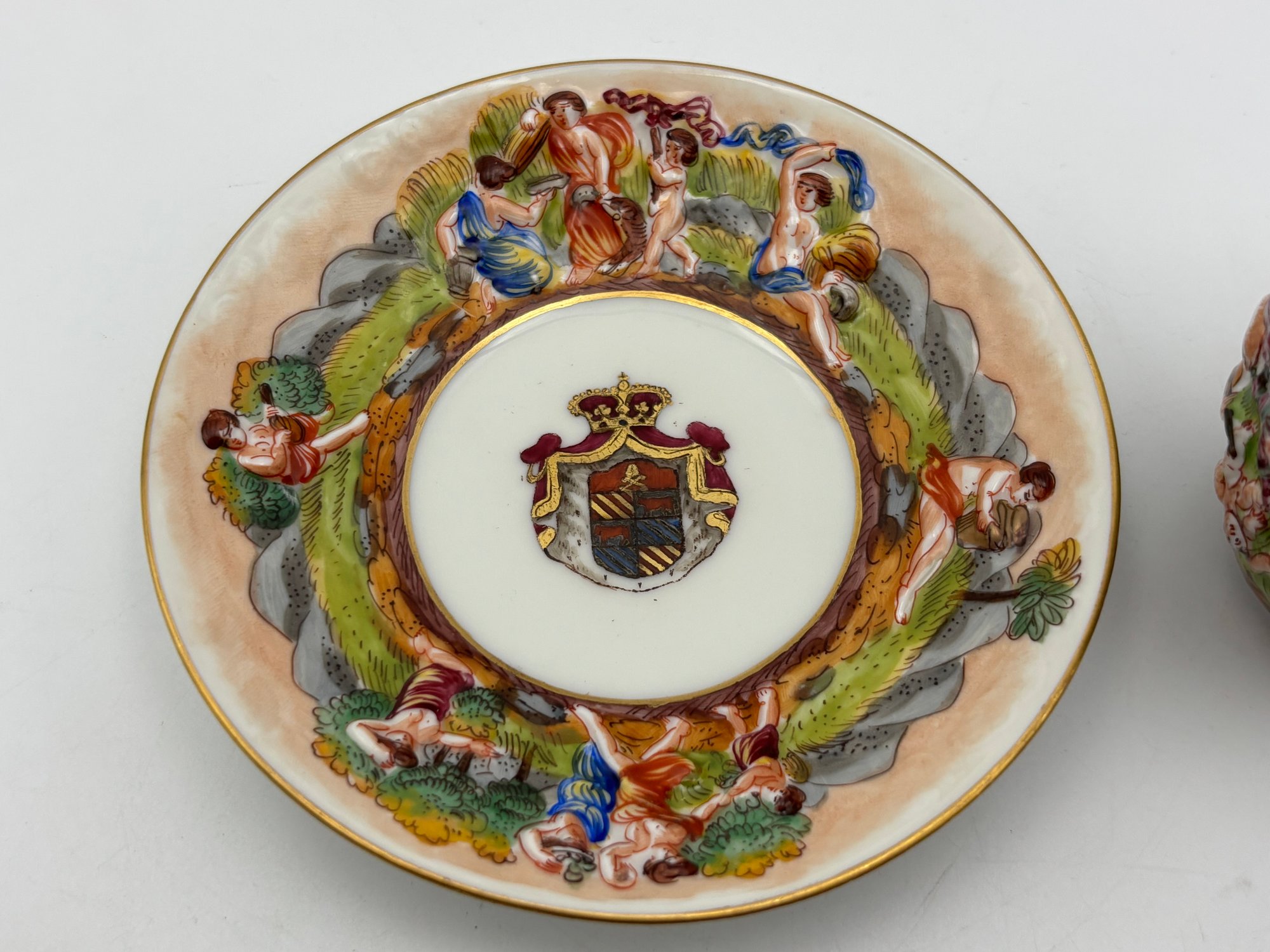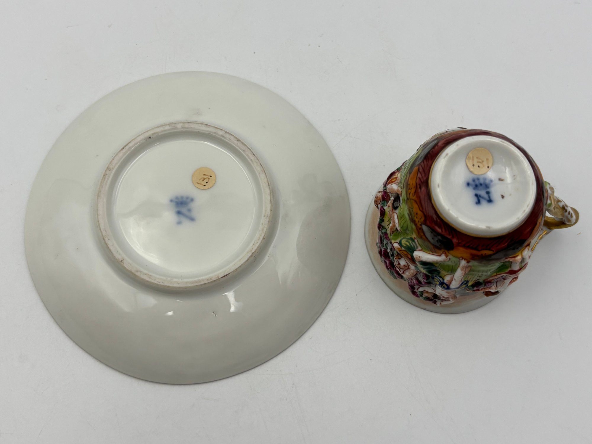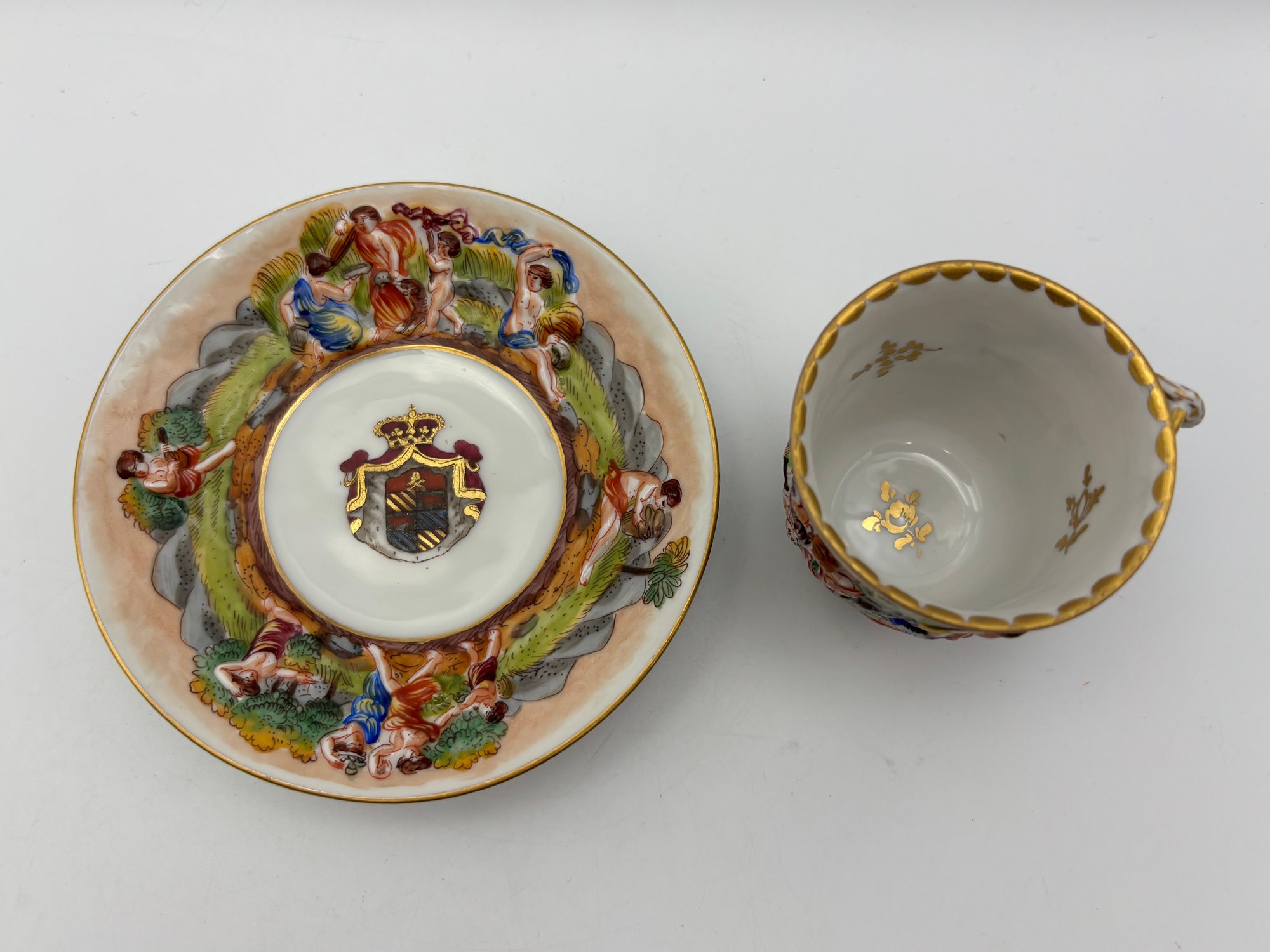 Antique Italian Capodimonte Decorative Demitasse Teacup & Saucer Ornate Depicting Roman Mythology W/ Stand