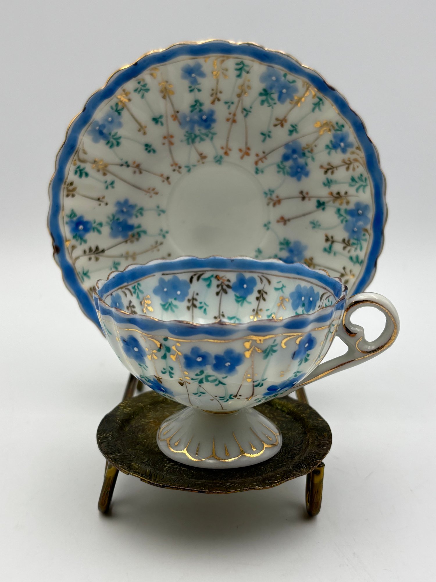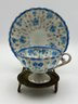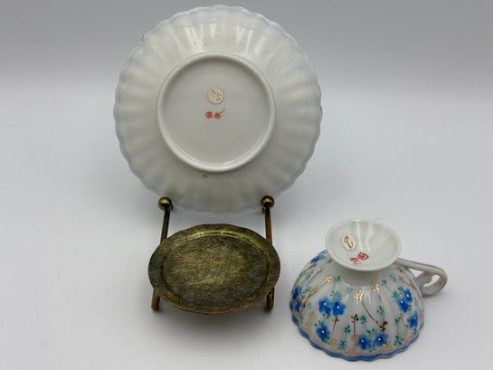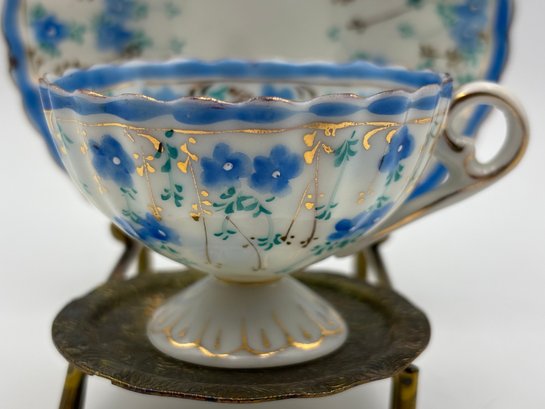 Antique Japanese Demitasse Teacup And Saucer Dainty Decorated With Small Blue Flowers Marked In Japanese Chara