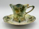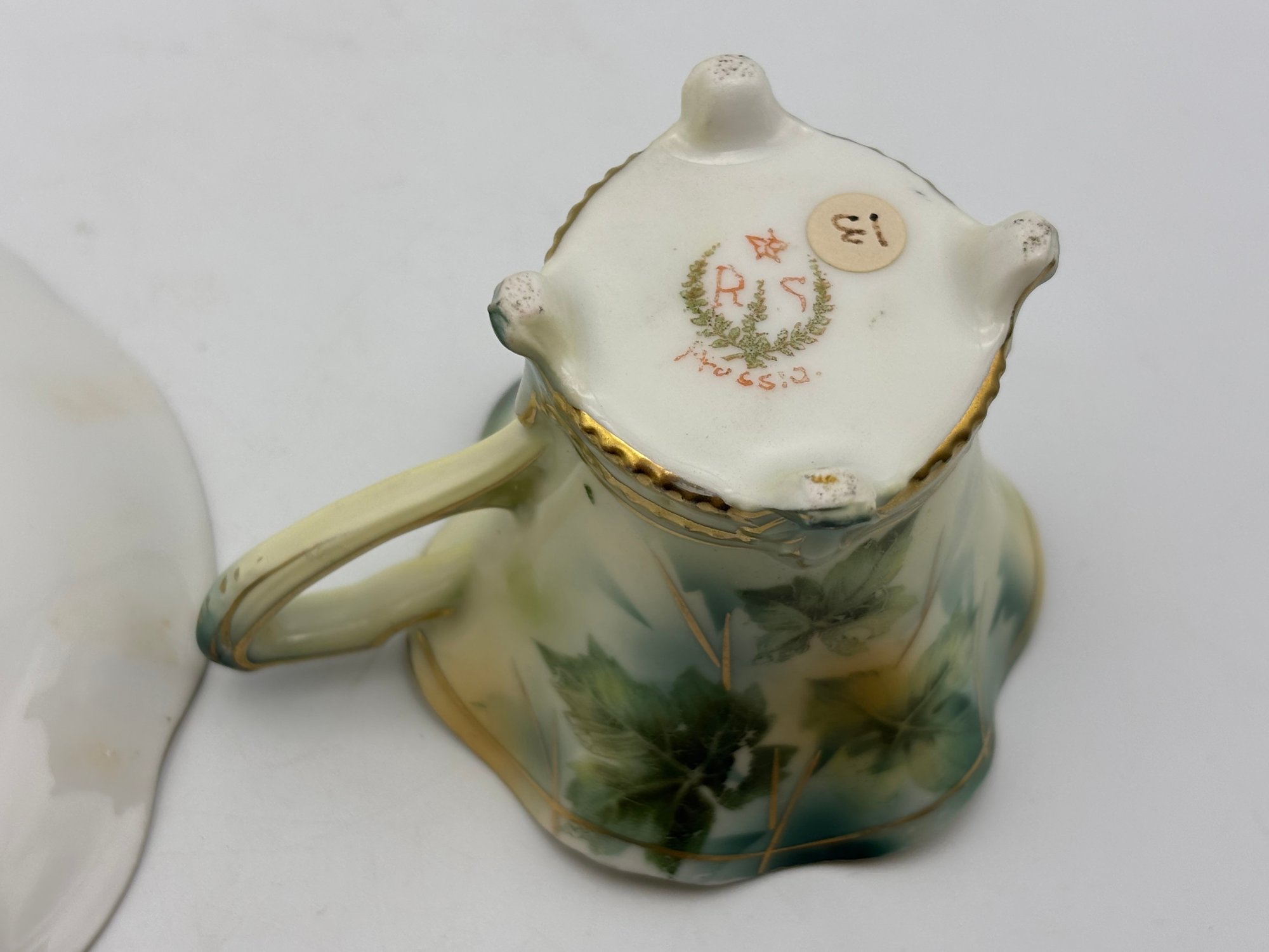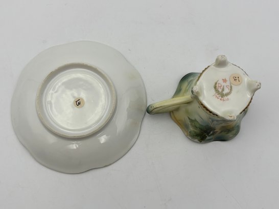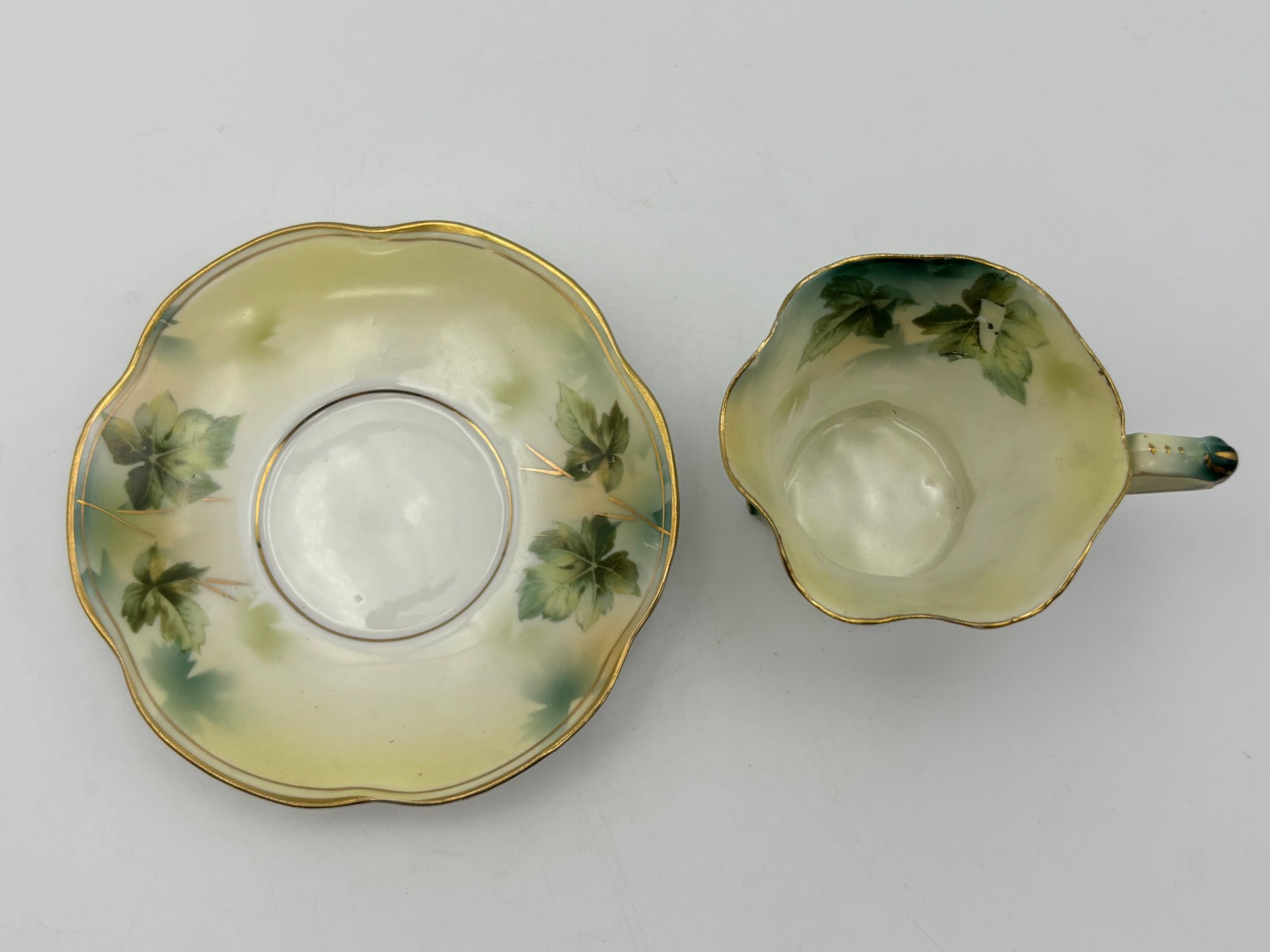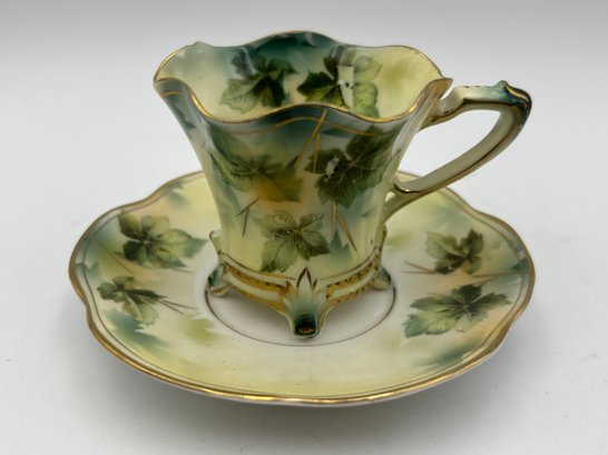 Antique Prussian Demitasse Teacup And Saucer Four Leg Footed Green Leaf Decorations