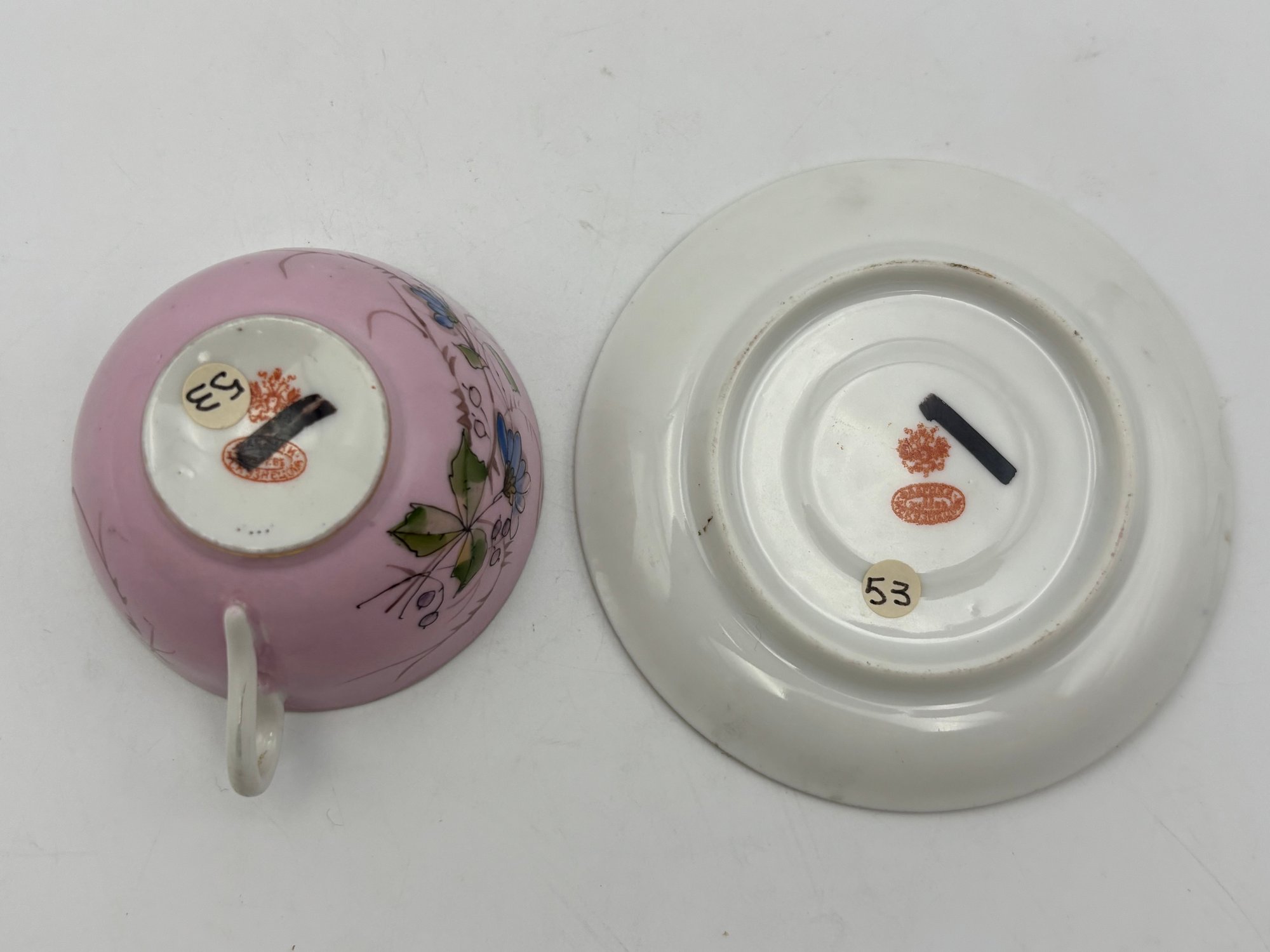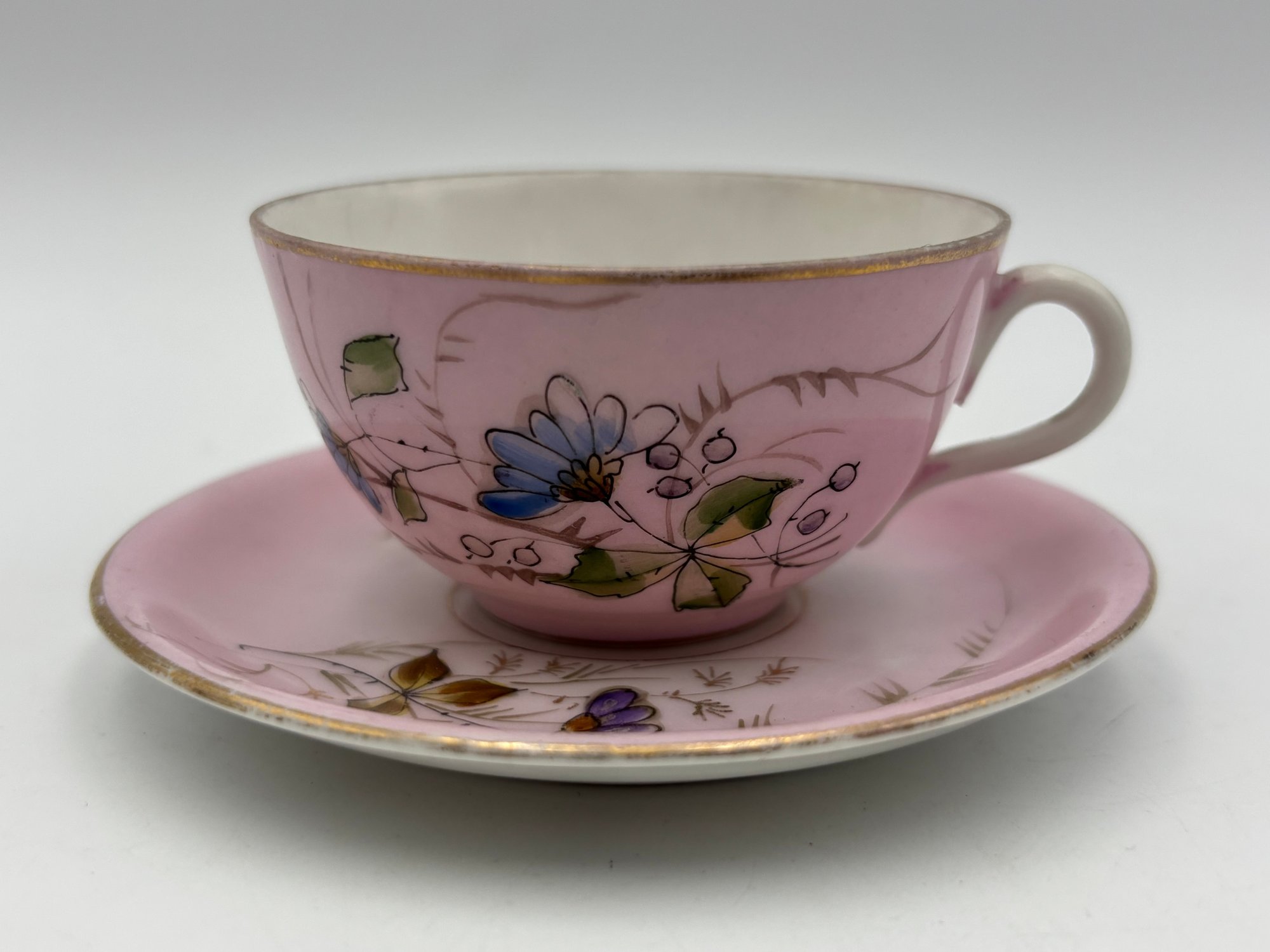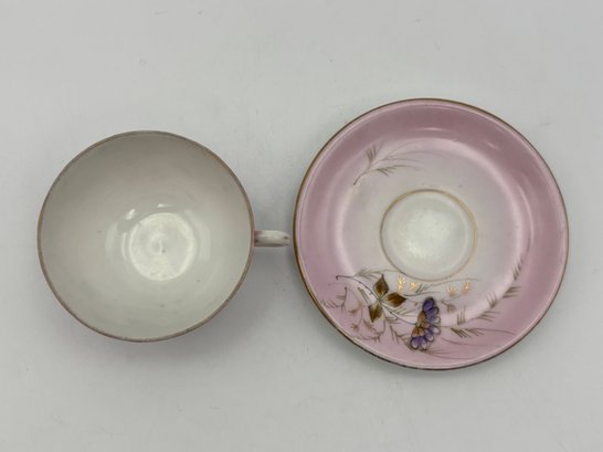 Antique Russian Demitasse Teacup And Saucer Dainty Lavender Pink With Flower Spray Decorations