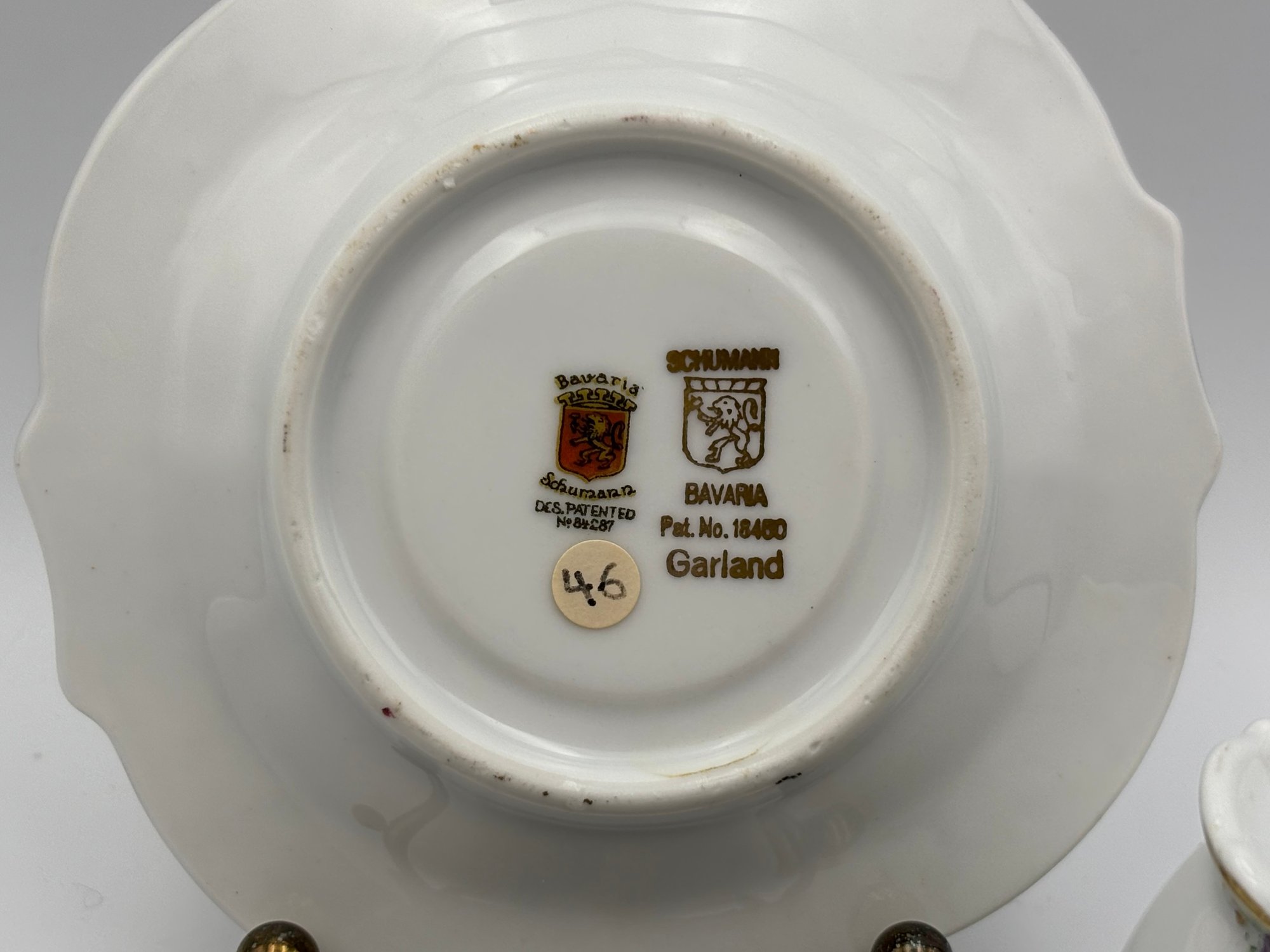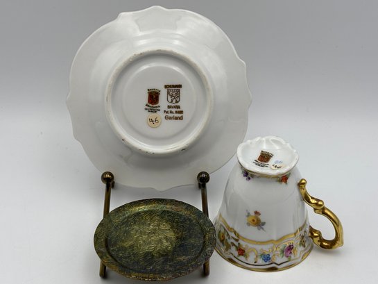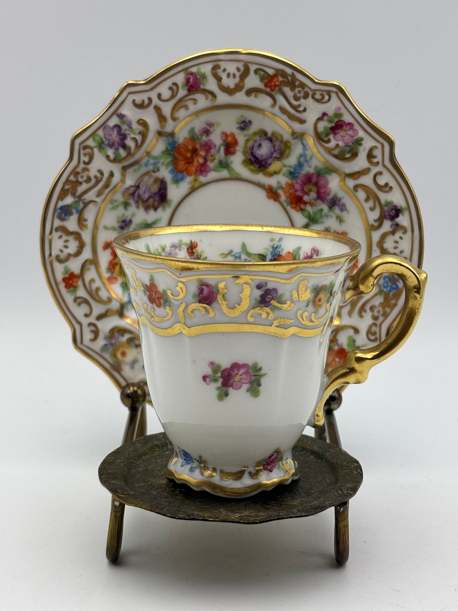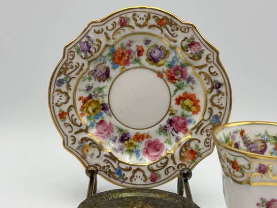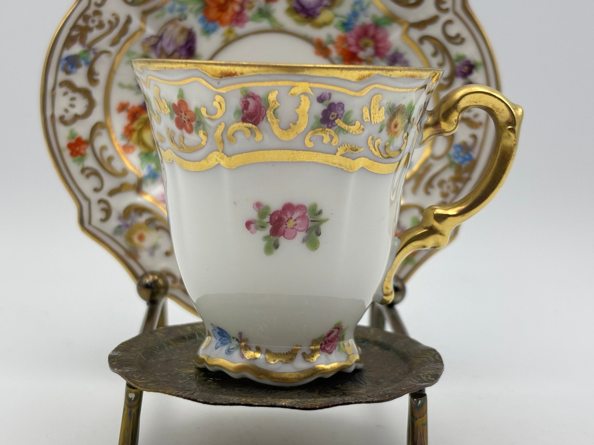 Antique Schumann Dresden Demitasse Teacup And Saucer With Stand Highly Decorated, Gold Gilt Floral