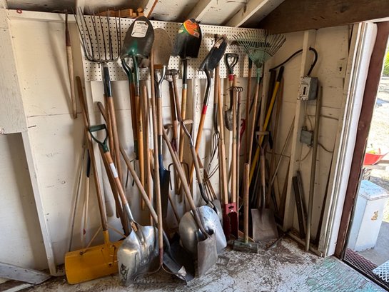 Huge Contractor Lot Of Hand Tools - Shovels, Pitck Forks, Rakes, Pole Augers, Axes, Etc