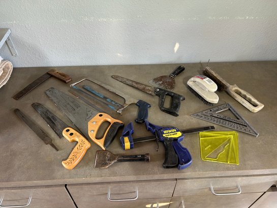 Lot Of Hand Tools, Saws, Irwin Clamp, Square Etc