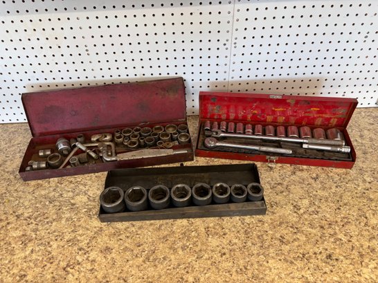 Lot Of Misc Metal Tool Kits Tool Boxes - Large Socket Sets Etc