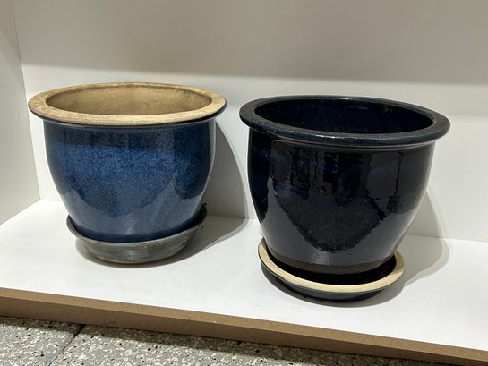 Lot Of Two Large Ceramic Glazed Terracotta Blue & Black Planter Pots