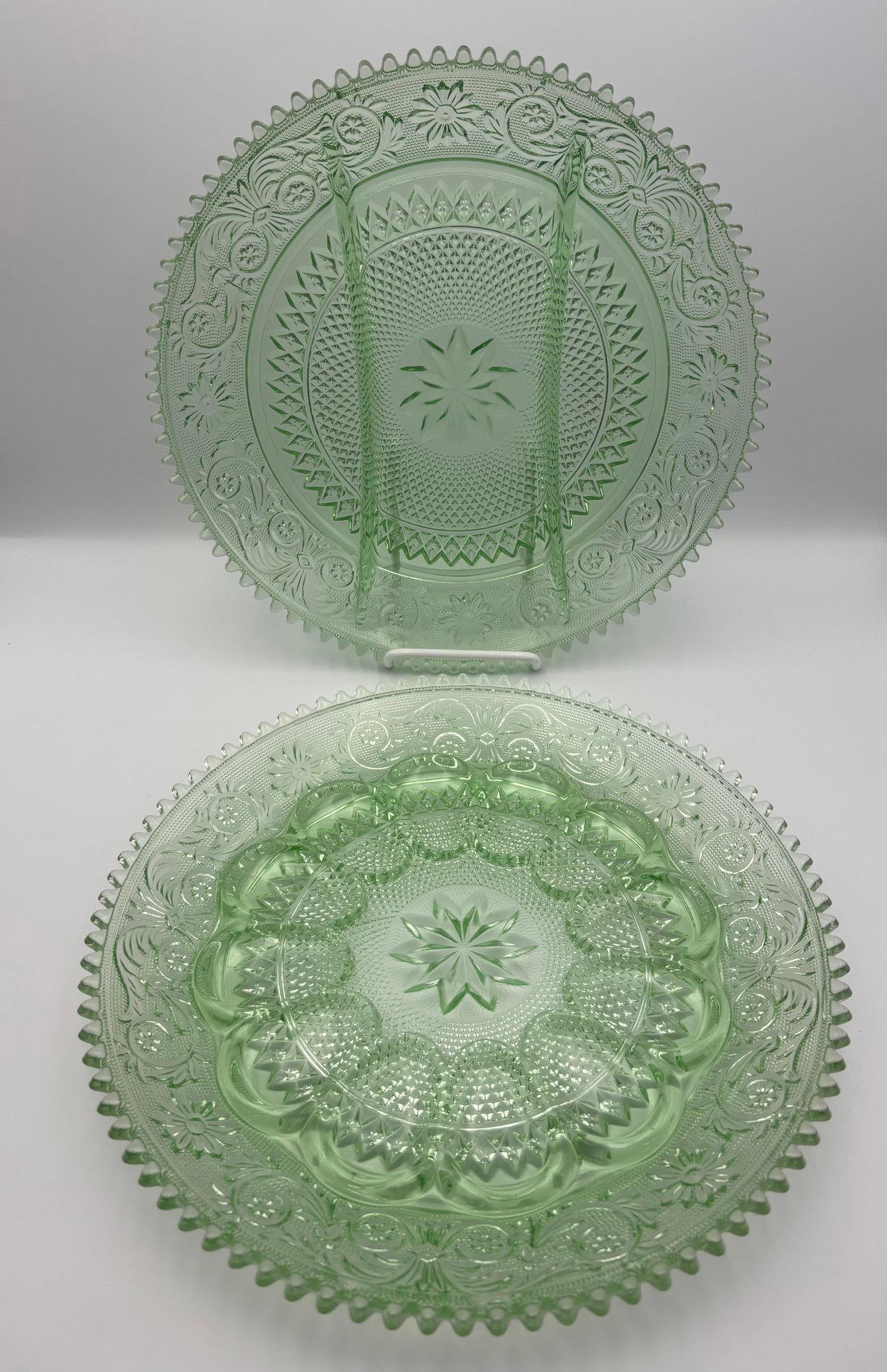 Set Of Indiana Glass Tiara Chantilly Green Sandwich Glass Serving Platters - Egg Dish & Relish Dish (lot 2)