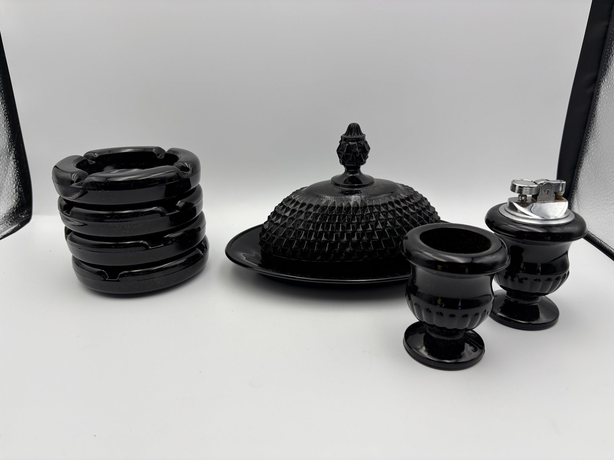 Vintage Black Tiara Smokers Set Glass Butter Dish, Ash Trays, Table Lighter And Tooth Pick Holder