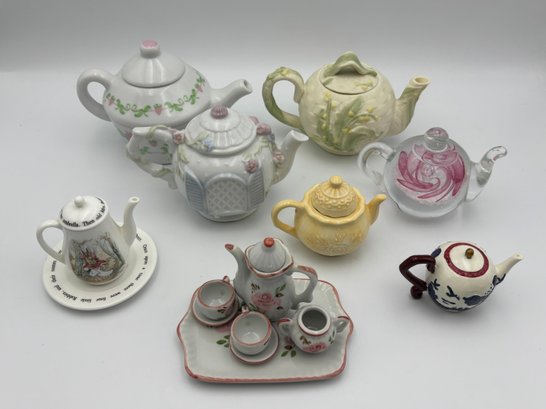 Vintage Collection Of 7 Miniature Tea Pots Ceramic, Plastic, Glass Blown, And 1 Miniature Tea Set