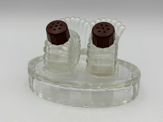 Vintage Crystal Turkey Salt And Pepper Shakers On Fan Tail Tray